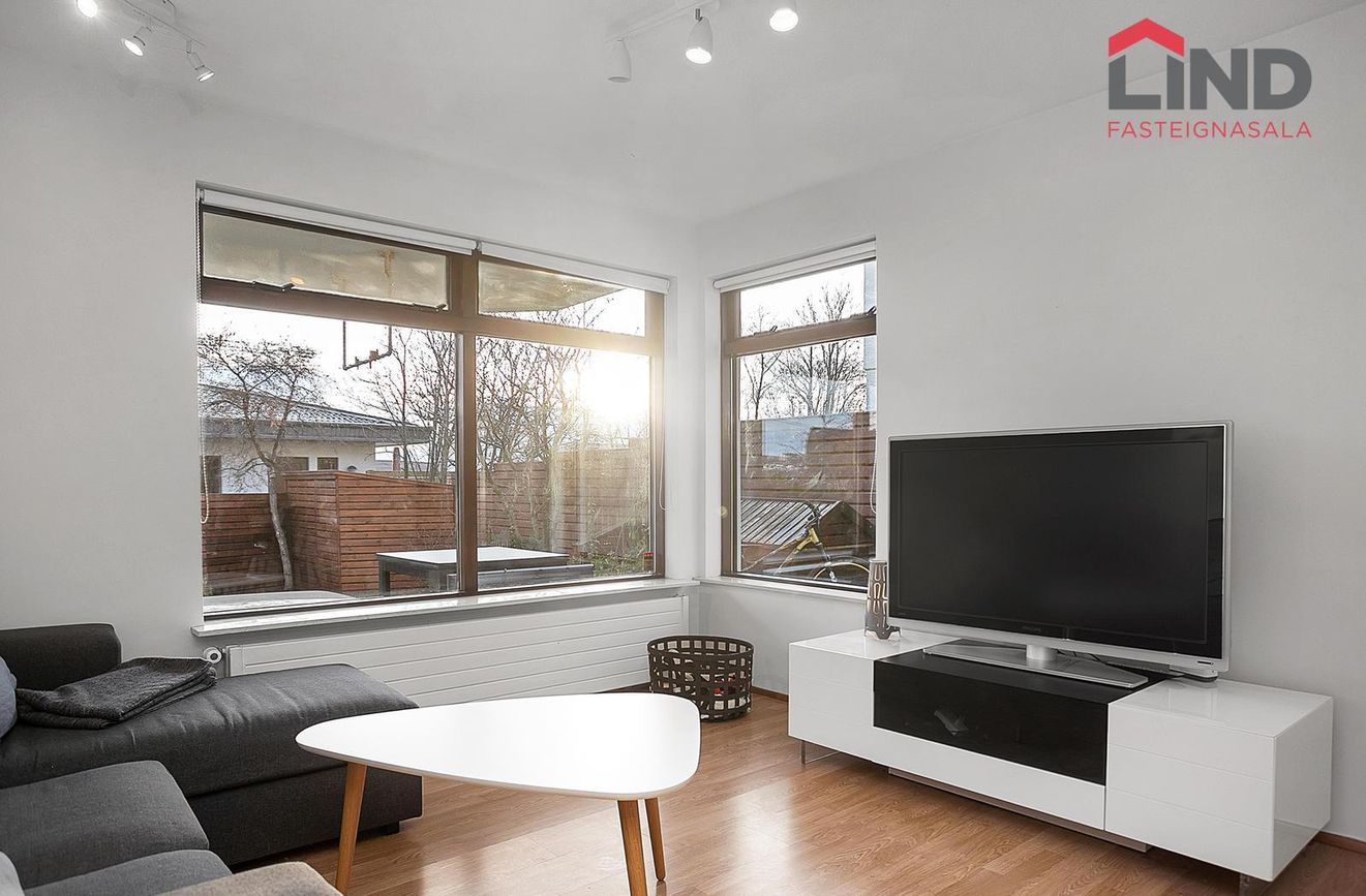 Stofan er opin og björt, með stórum gluggum til suðurs og útsýni inn í garðinn, en einnig er gluggi til vesturs. Stofan rennur saman við miðrými/hol sem er með stórum skápum, en úr holinu er gengið inn í önnur rými íbúðarinnar.