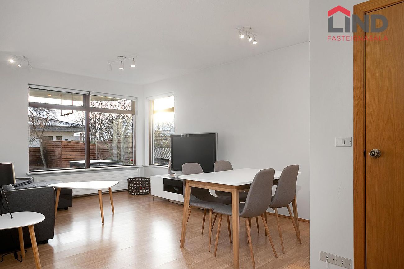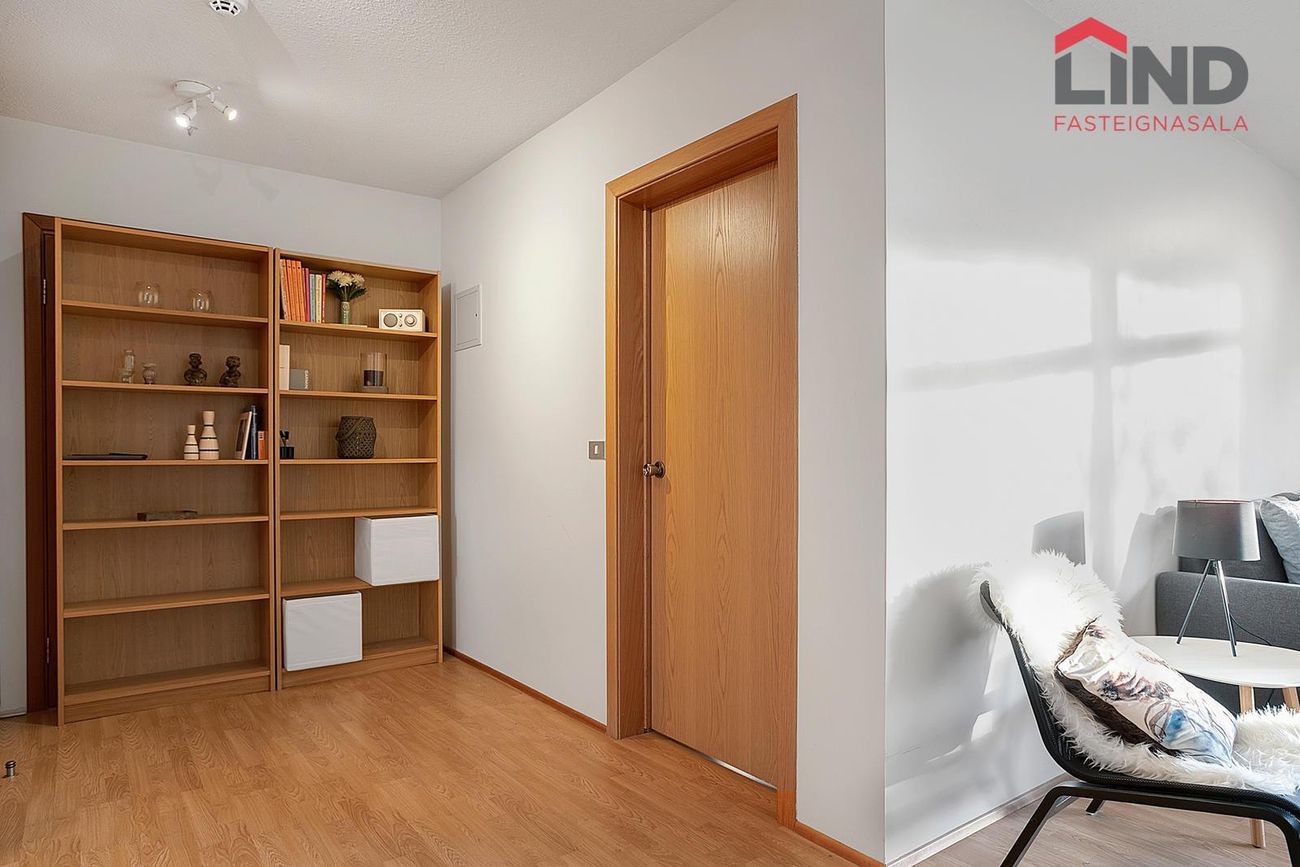 Stofa, svefnherbergi og eldhús eru með samfljótandi harðparketi.Lítil útigeymsla fyrir hjól eða annað smálegt er við tröppur að inngangi íbúðarinnar.