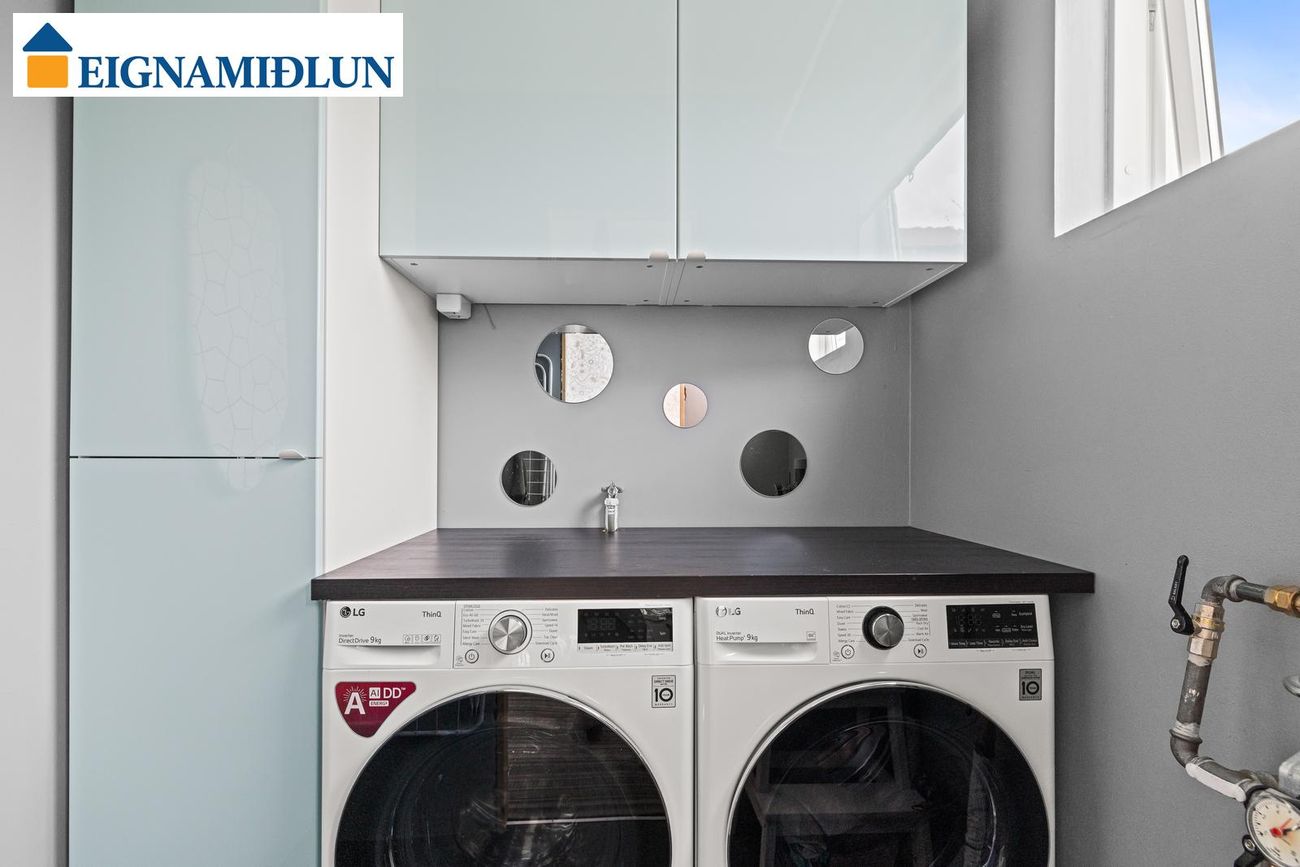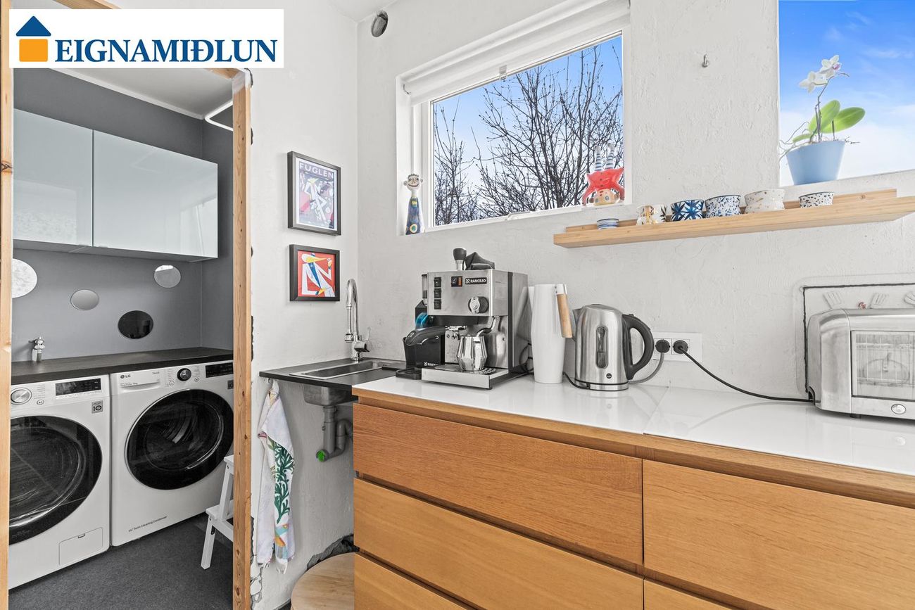 Þvottahús og búr eru inn af eldhúsi. Ikea innrétting í þvottahúsi með pláss fyrir þvottavél og þurrkara, opnanlegur gluggi. Útgengt er úr búri út á timburpall.