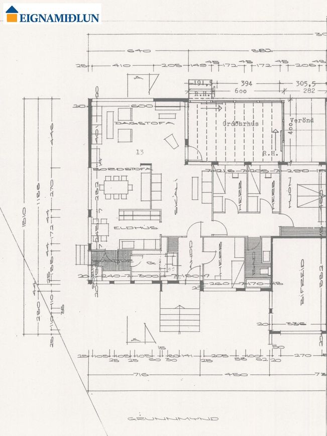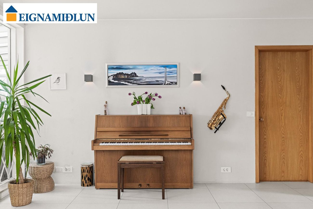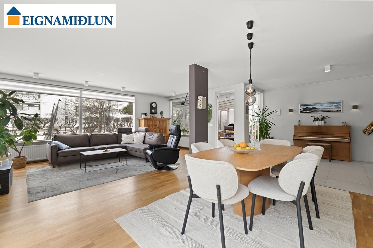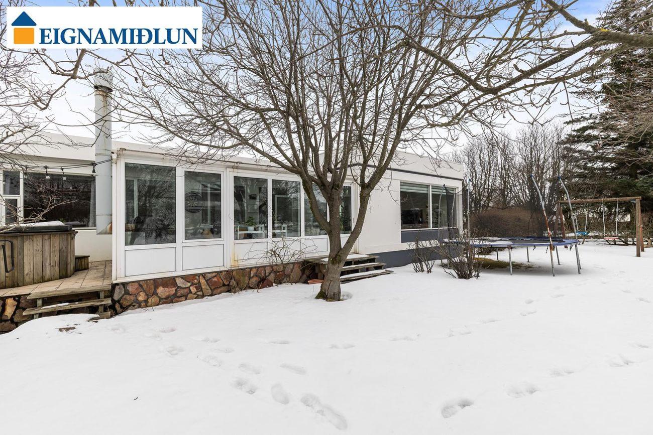 Um er að ræða nánar tiltekið Hlunnavog 13, 104 Reykjavík, F2020793. 5-6 herbergja parhús á einni hæð með bílskúr. Samkvæmt Fasteignaskrá HMS er eignin skráð samtals 182,8 fm, þar af er íbúðarrými 161,2 fm, bílskúr er skráður 21,6 fm. Íbúðarrými hússins skiptist í anddyri, snyrtingu, húsbónda/forstofuherbergi, skála, eldhús, borðstofu og stofu. Stór sólstofa (24 fm) með gólfhita og kamínu út frá stofu. Á herbergjagangi eru nú tvö svefnherbergi (áður þrjú) og baðherbergi. Sérþvottahús og búr inn af eldhúsi með útgengi út á timburverönd. Bílskúr er snyrtilegur, rúmgóður með óskráðu millilofti, góðri innkeyrsluhurð (með gönguhurð) og mörgum gluggum. Fasteignamat 2026 = 136.400.000 kr.