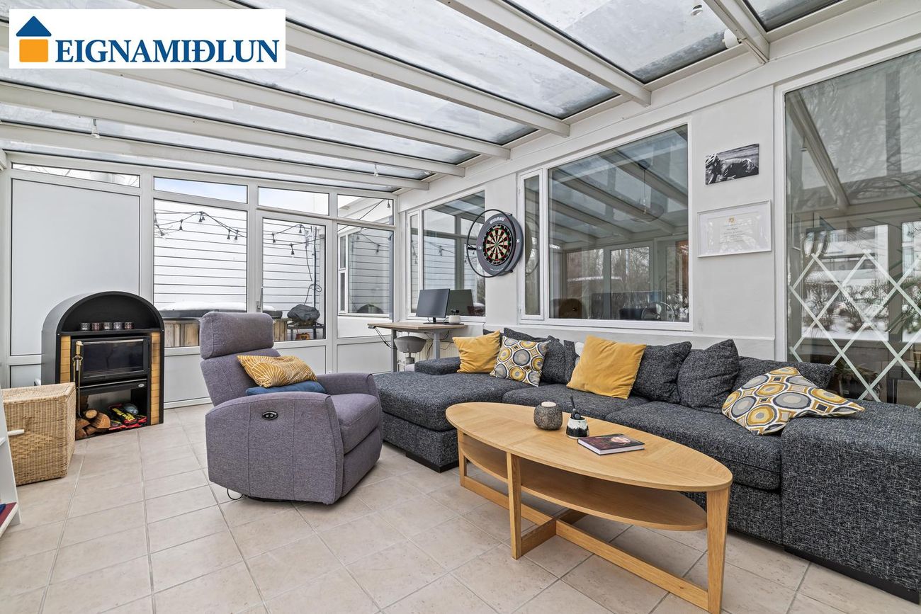 Sólstofa er út frá stofu. Mjög gott rými (24 fm) með gólfhita og kamínu. Tveir útgangar út á flísalagða verönd eru úr sólstofunni, annar beint út að heita pottinum.