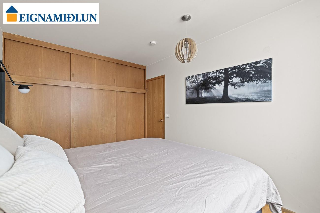 Herbergi 2 er hjónaherbergi er rúmgott með góðum upprunalegum fataskápum með rennihurðum. Parket á gólfi.