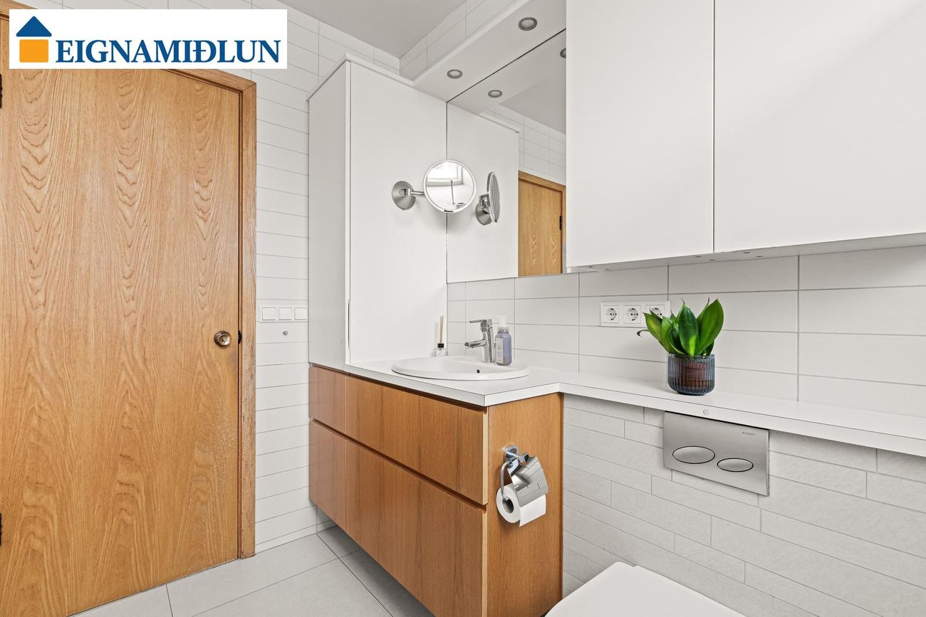Baðherbergi er rúmgott (6,9 fm) með snyrtilegri eikarinnréttingu frá Brúnás með hvítum efri skápum og handlaug. Stór sturtuklefi með innbyggðum blöndunartækjum. Upphengt salerni. Flísar í hólf og gólf. Opnanlegur gluggi. Handklæðaofn. Gólfhiti.