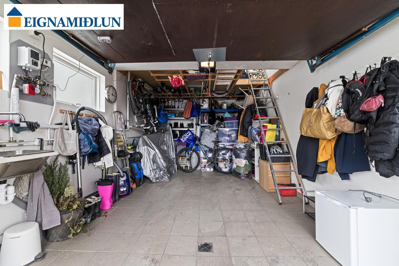 Bílskúr er snyrtilegur, 21,6 fm og með mörgum gluggum. Innkeyrsluhurð (með inngönguhurð). Heitt og kalt vatn. Flísar á gólfi. Góð hellulögð innkeyrsla er fyrir framan bílskúrinn með pláss fyrir 1-2 bíla. Snjóbræðsla er í innkeyrslunni og í hellulögðum göngustíg en ekki í útitröppum.