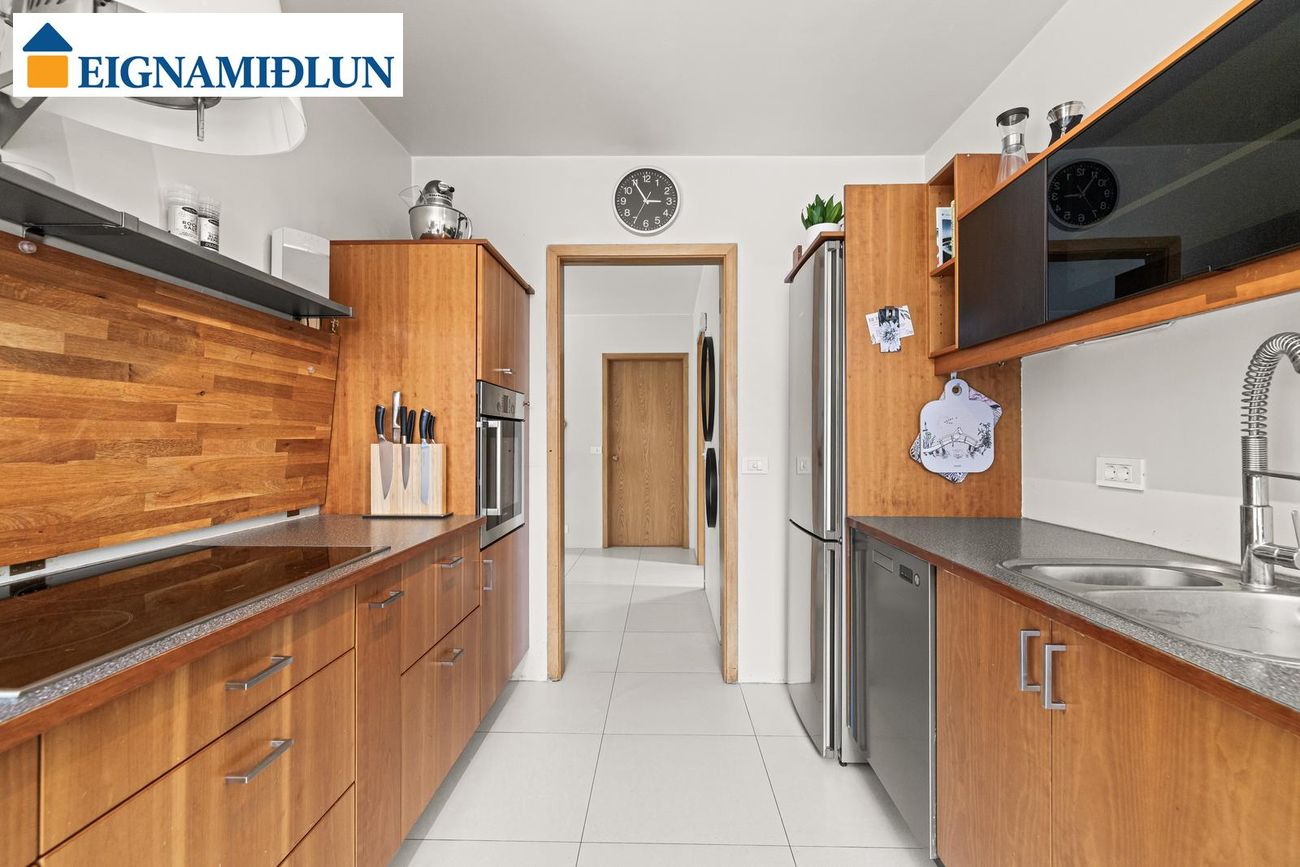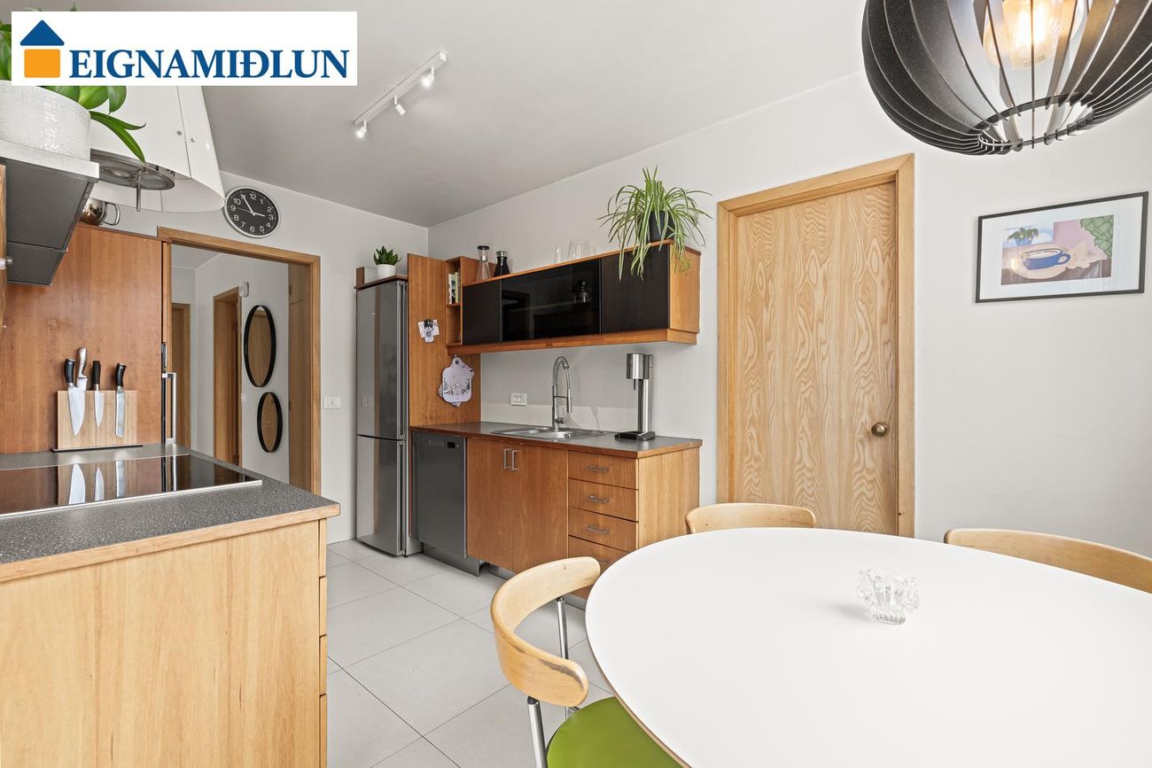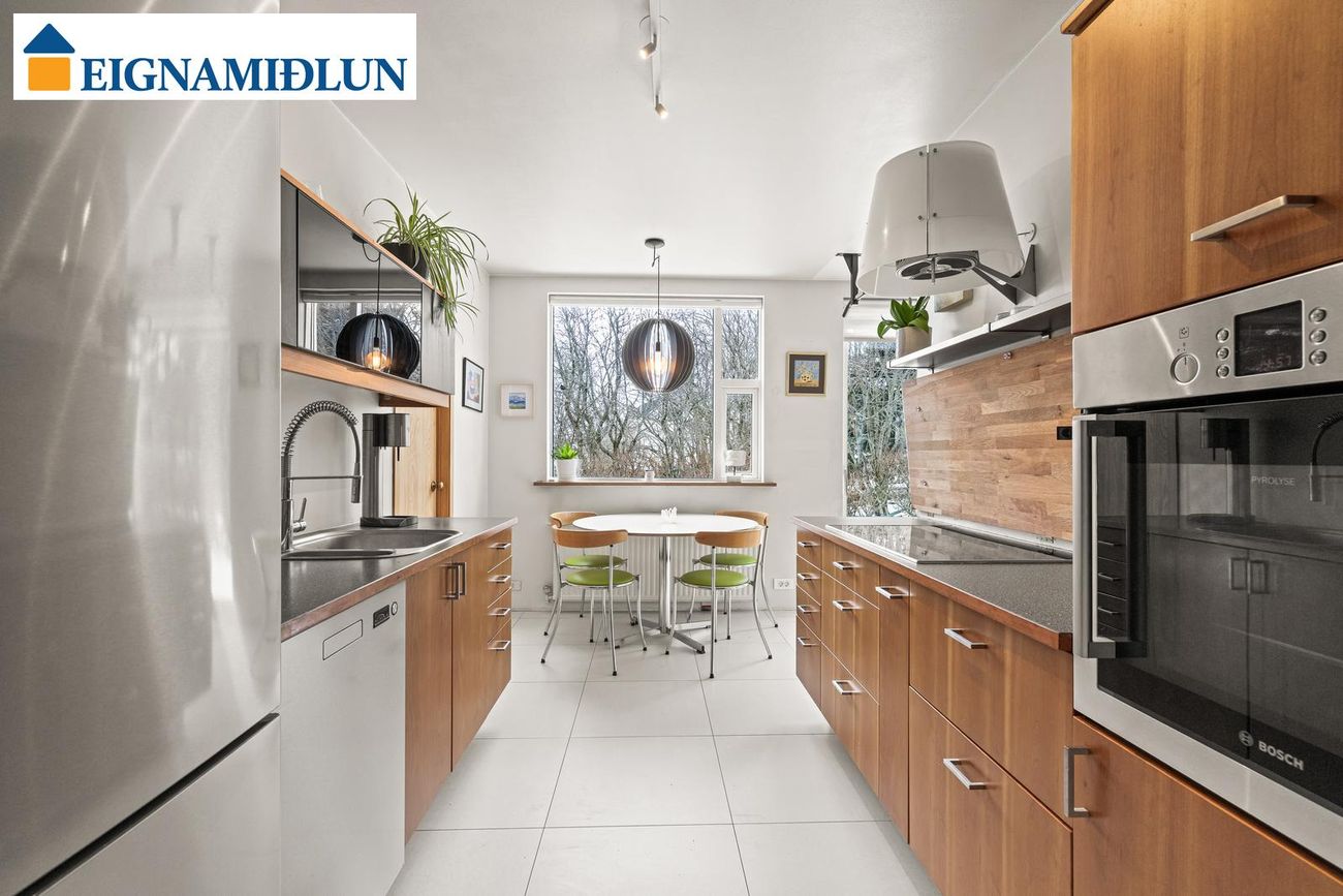 Eldhús er lokað, rúmgott með fallegri viðarinnréttingu með góðu vinnu- og skápaplássi og góðum borðkrók. Vönduð eldhústæki frá Bosch, Siemens og Asko. Flísar á gólfi.