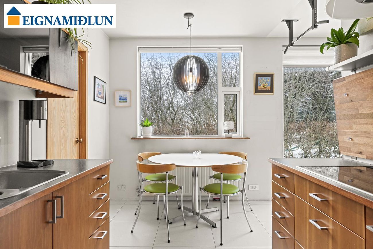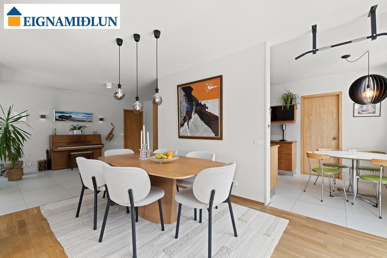 Borðstofa er með tengingu við eldhús og stofu. Stór rennihurð og útgengt út á timburpall.