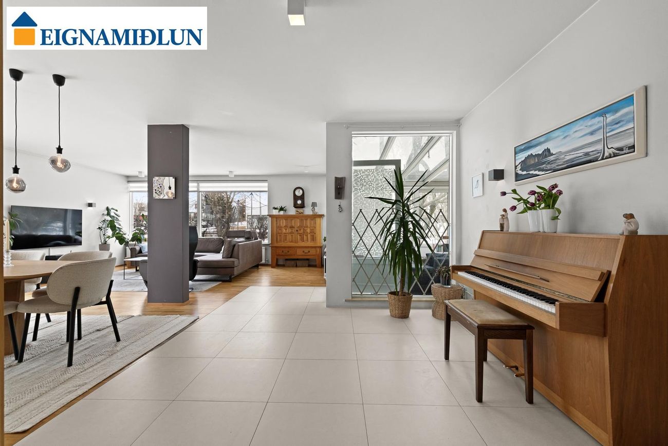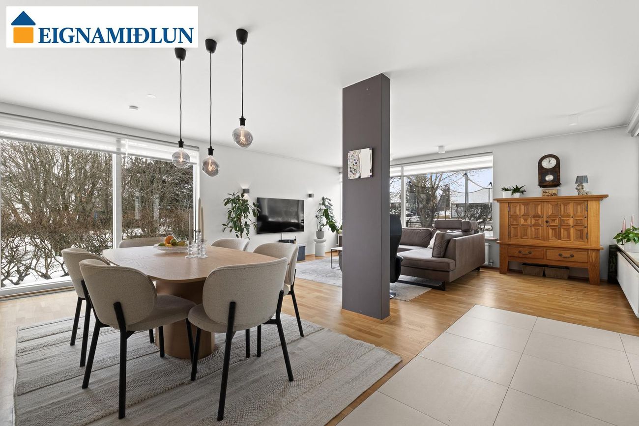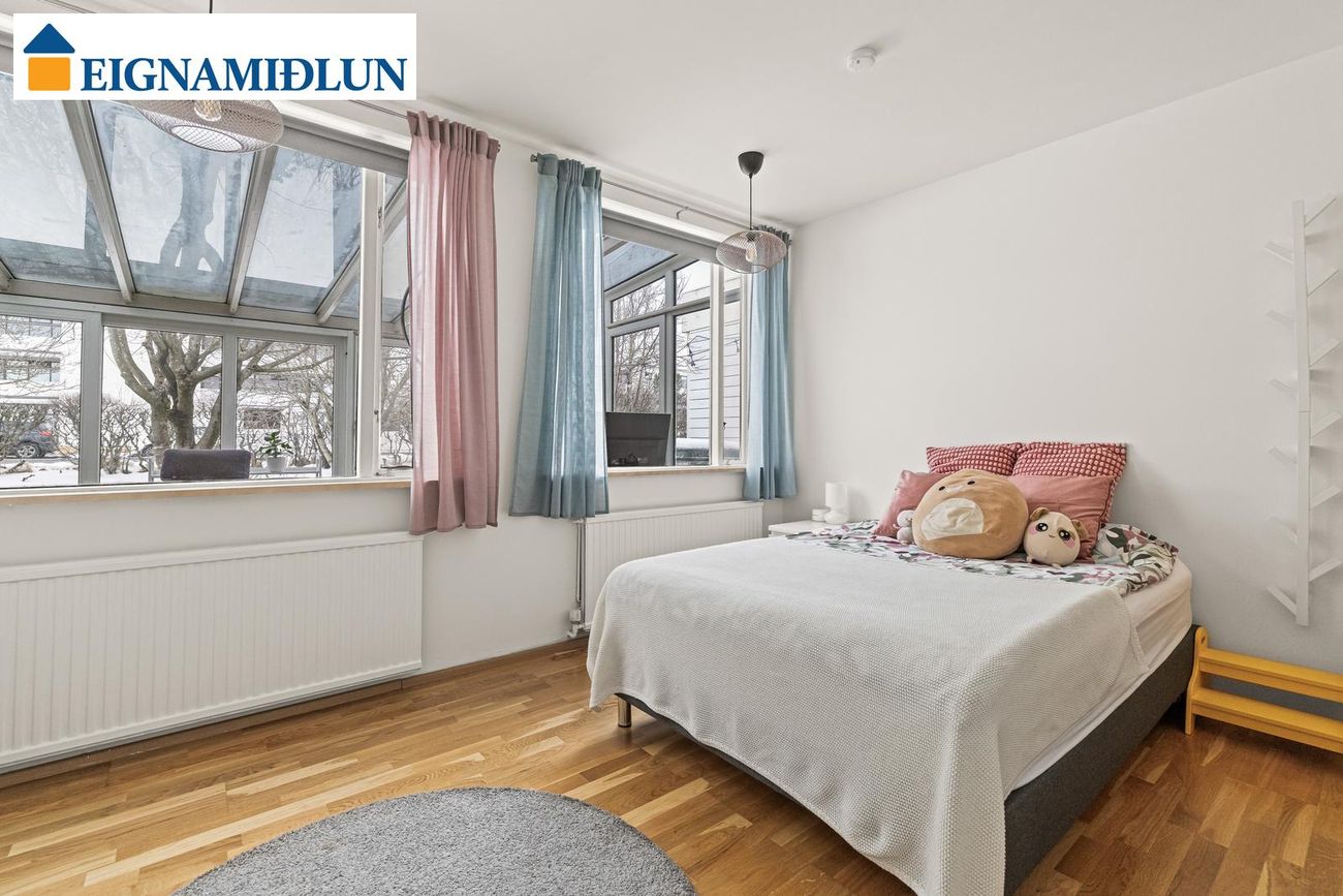 Um er að ræða nánar tiltekið Hlunnavog 13, 104 Reykjavík, F2020793. 5-6 herbergja parhús á einni hæð með bílskúr. Samkvæmt Fasteignaskrá HMS er eignin skráð samtals 182,8 fm, þar af er íbúðarrými 161,2 fm, bílskúr er skráður 21,6 fm. Íbúðarrými hússins skiptist í anddyri, snyrtingu, húsbónda/forstofuherbergi, skála, eldhús, borðstofu og stofu. Stór sólstofa (24 fm) með gólfhita og kamínu út frá stofu. Á herbergjagangi eru nú tvö svefnherbergi (áður þrjú ) og baðherbergi. Sérþvottahús og búr inn af eldhúsi með útgengi út í garð. Bílskúr er snyrtilegur, rúmgóður með óskráðu millilofti, góðri innkeyrsluhurð (með gönguhurð) og mörgum gluggum. Fasteignamat 2026 = 136.400.000 kr.