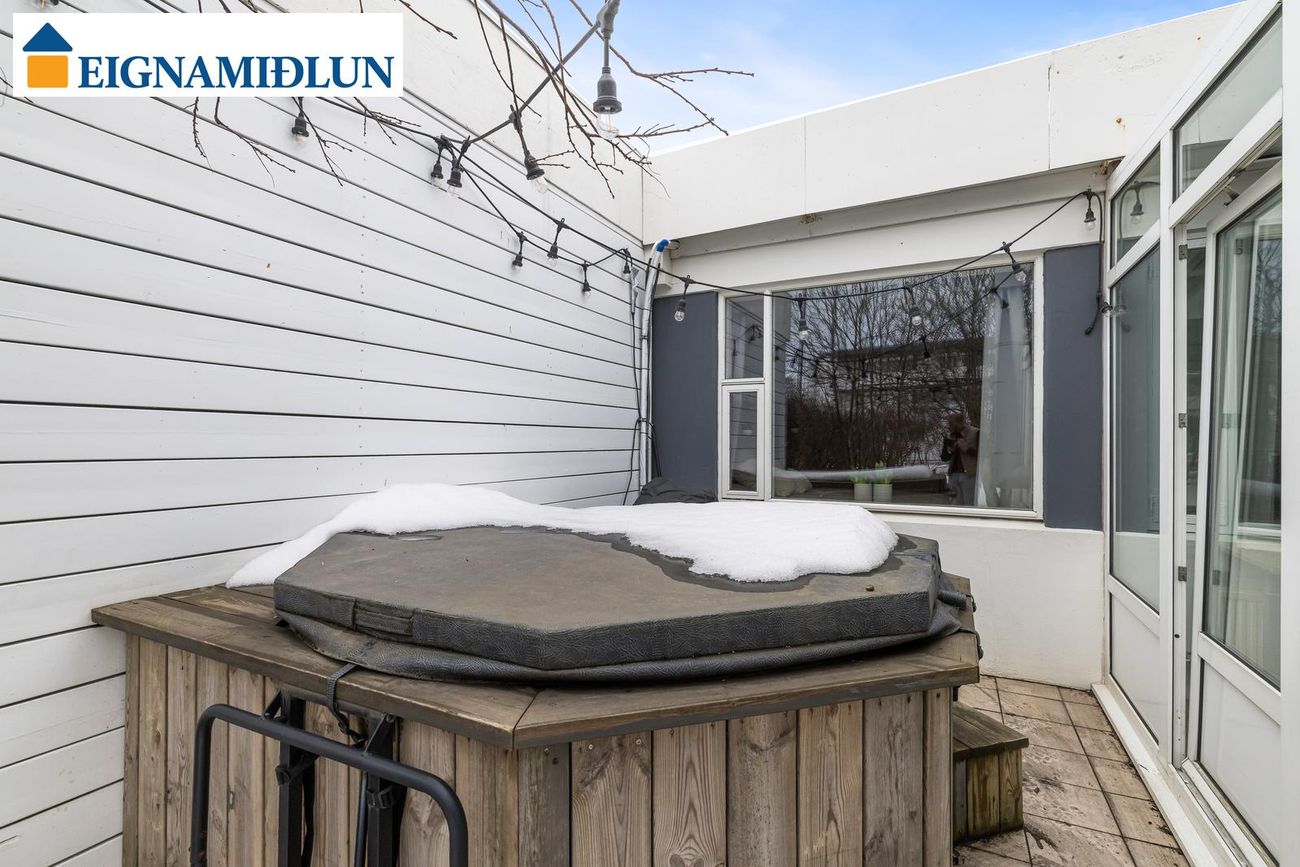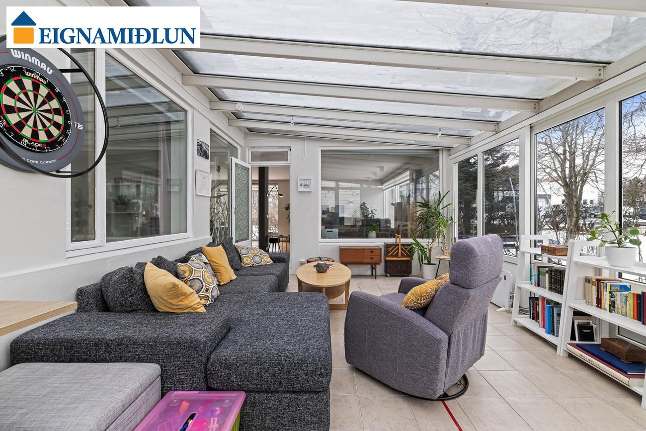 Sólstofa er út frá stofu. Mjög gott rými (24 fm) með gólfhita og kamínu. Tveir útgangar út á flísalagða verönd eru úr sólstofunni, annar beint út að heita pottinum.