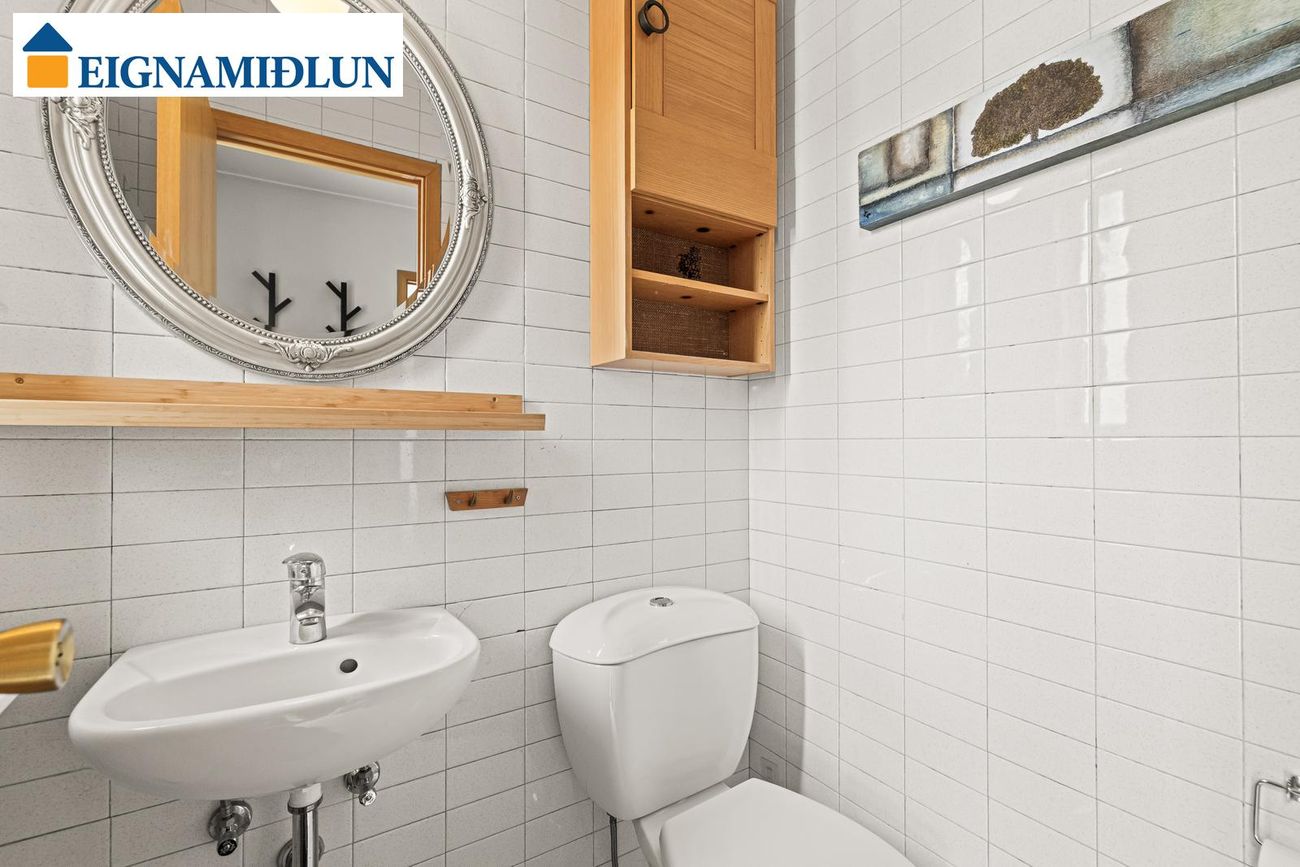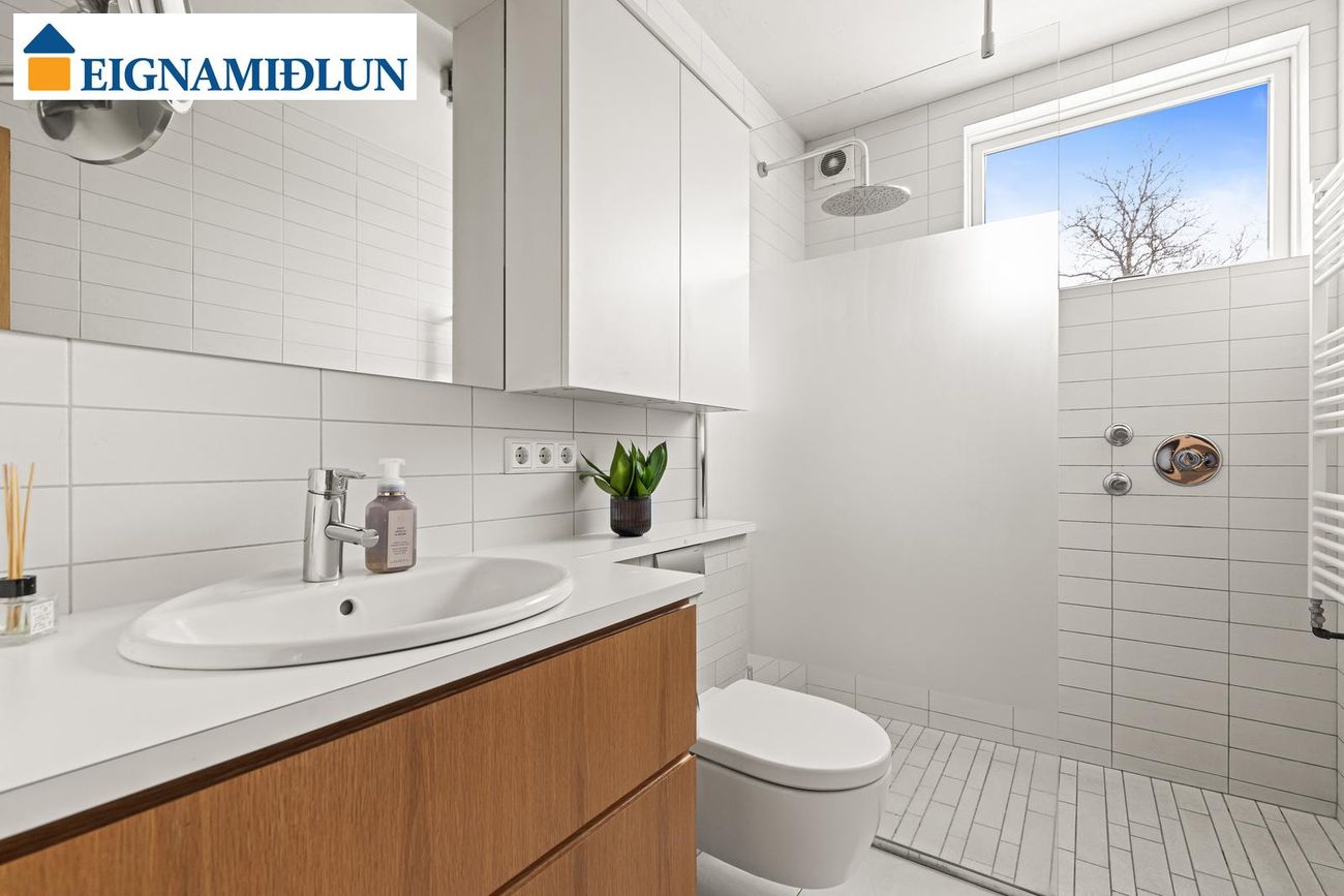 Baðherbergi er rúmgott (6,9 fm) með snyrtilegri eikarinnréttingu frá Brúnás með hvítum efri skápum og handlaug. Stór sturtuklefi með innbyggðum blöndunartækjum. Upphengt salerni. Flísar í hólf og gólf. Opnanlegur gluggi. Handklæðaofn. Gólfhiti.