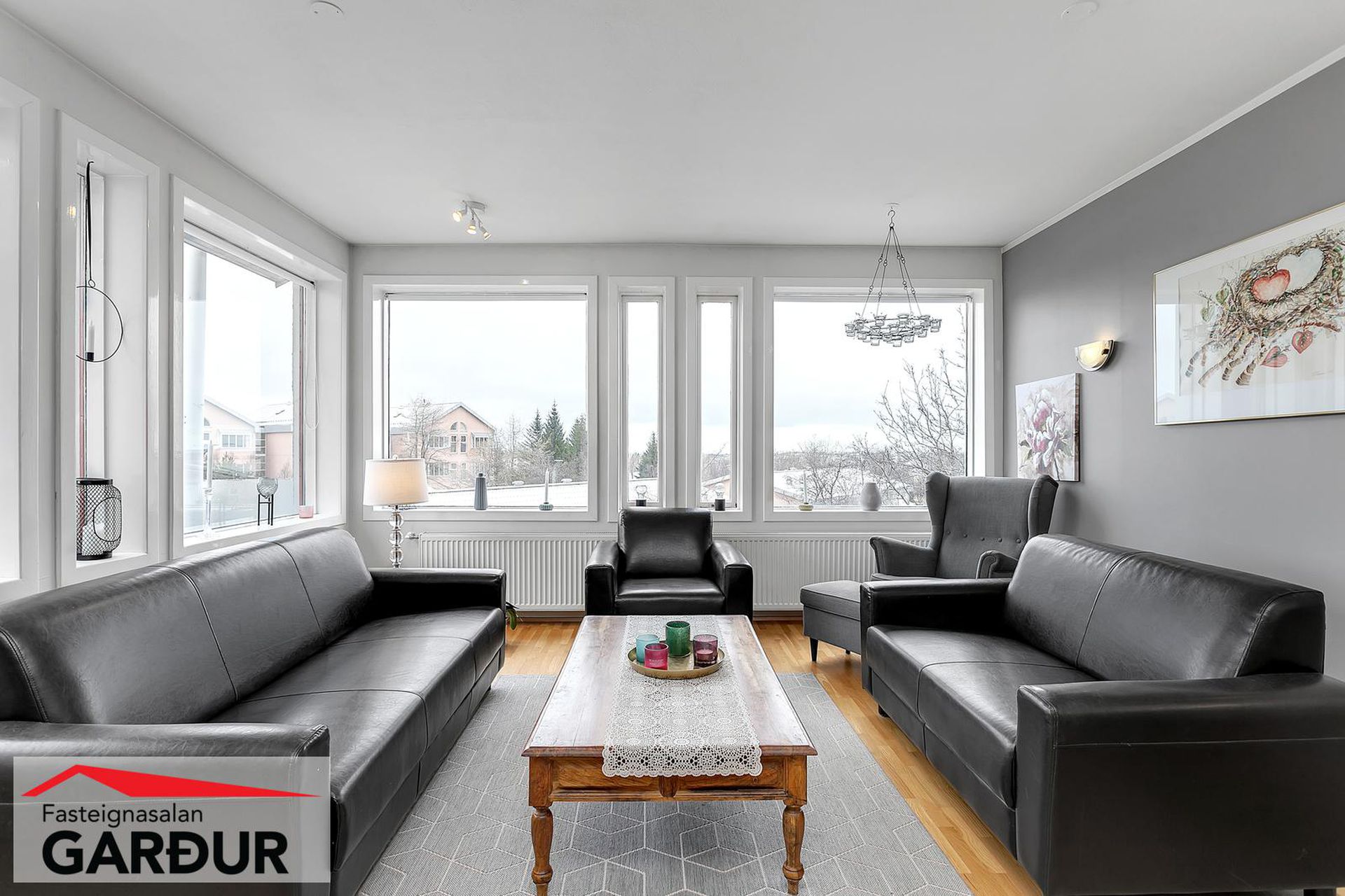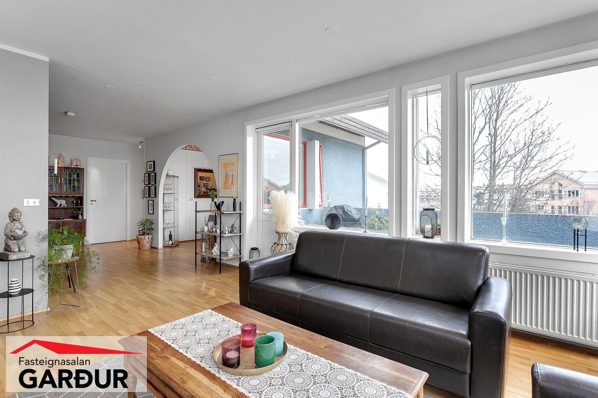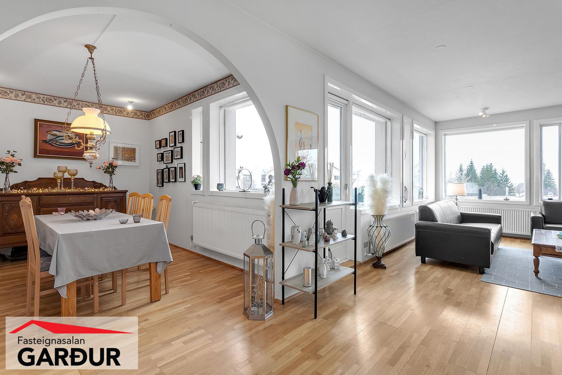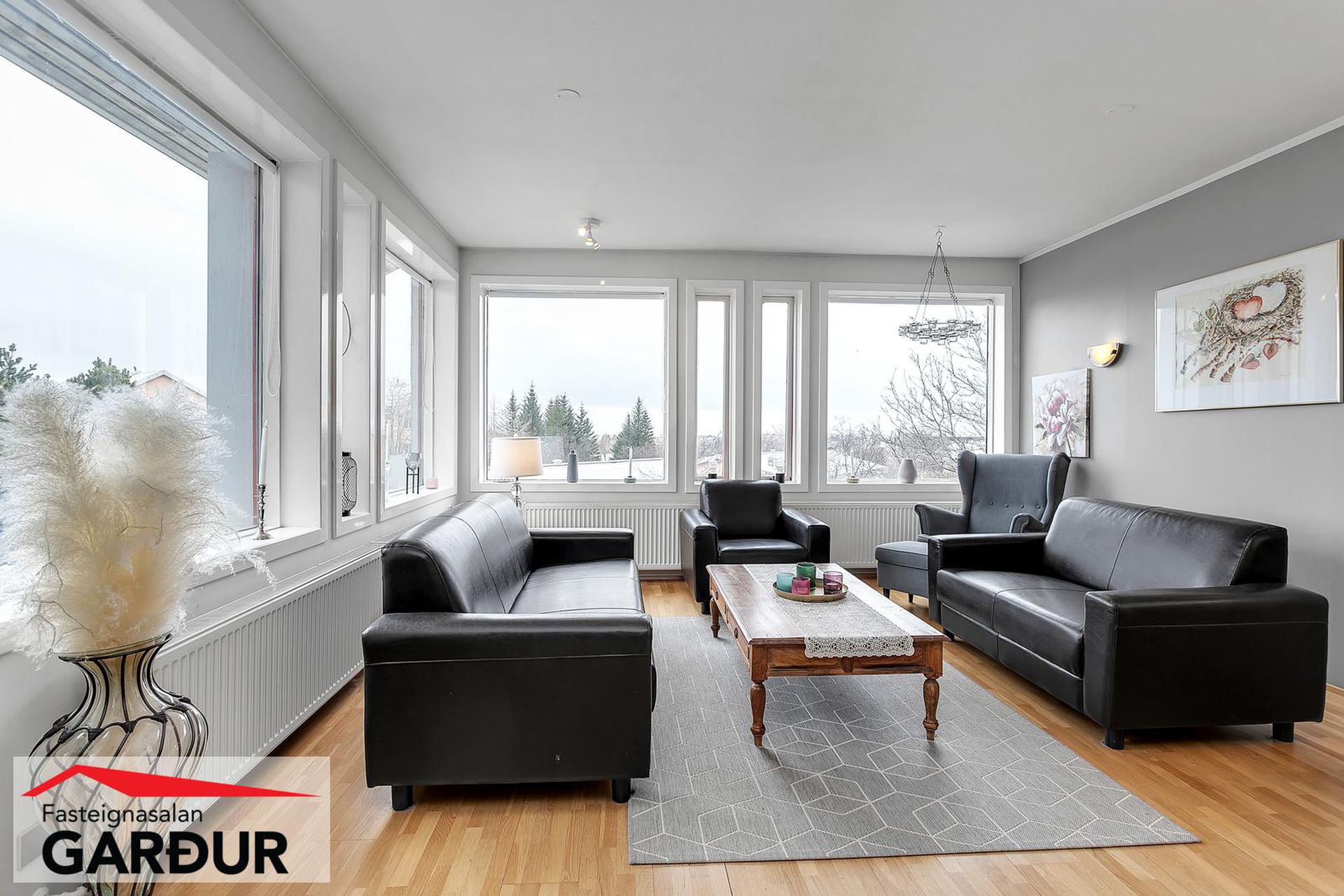 Bjartar rúmgóðar stofur með útsýni. Gengið út á svalir úr stofunni og þar er stigi niður í garðinn.