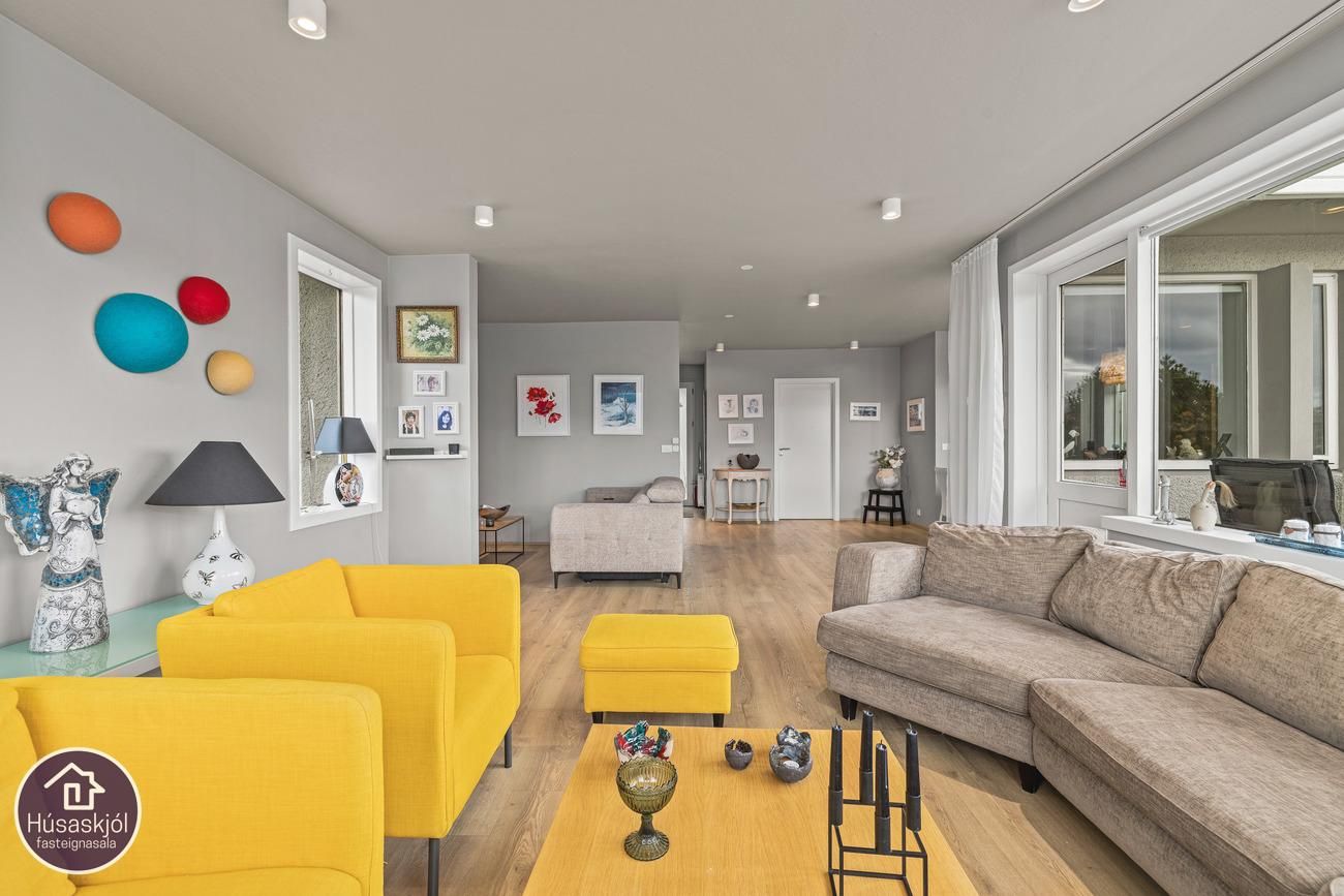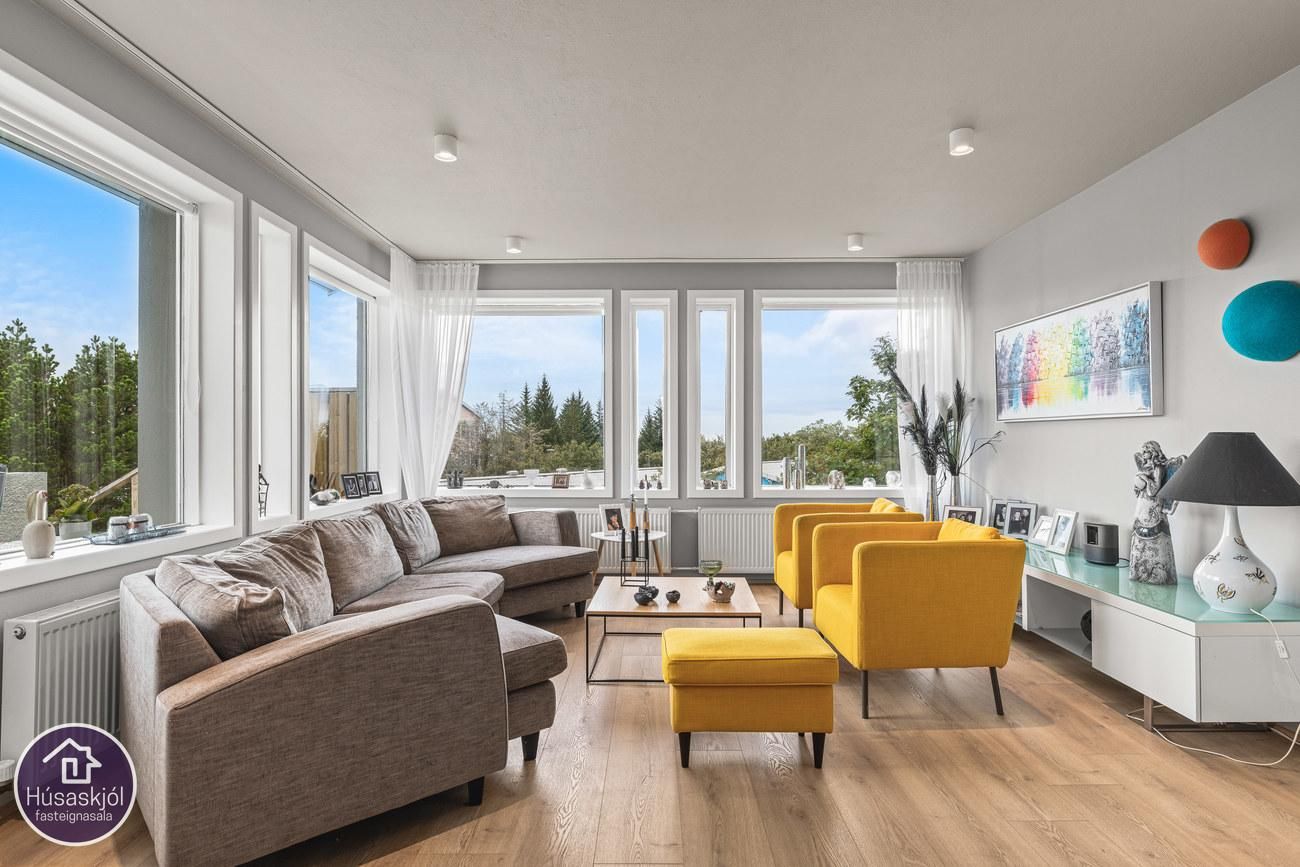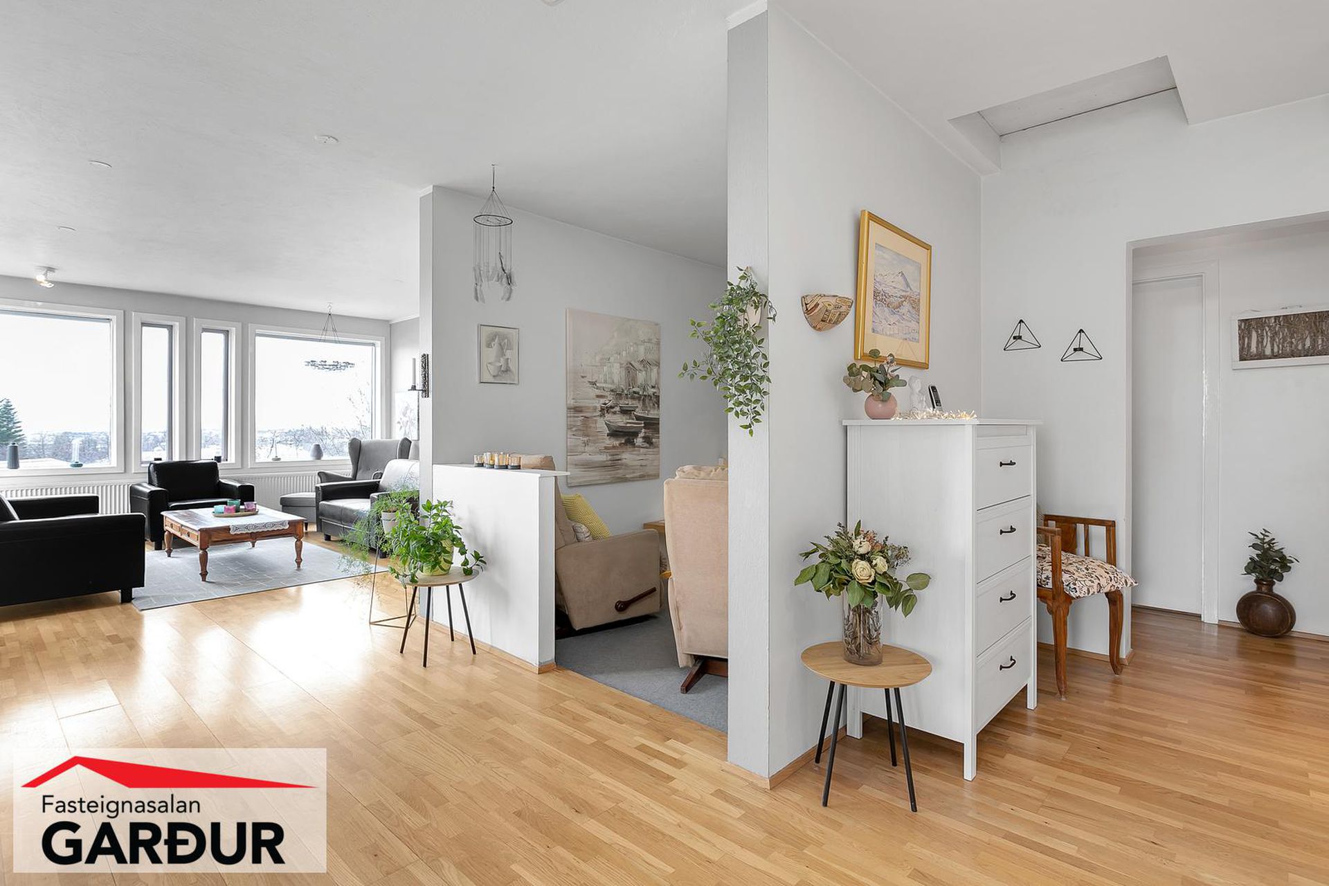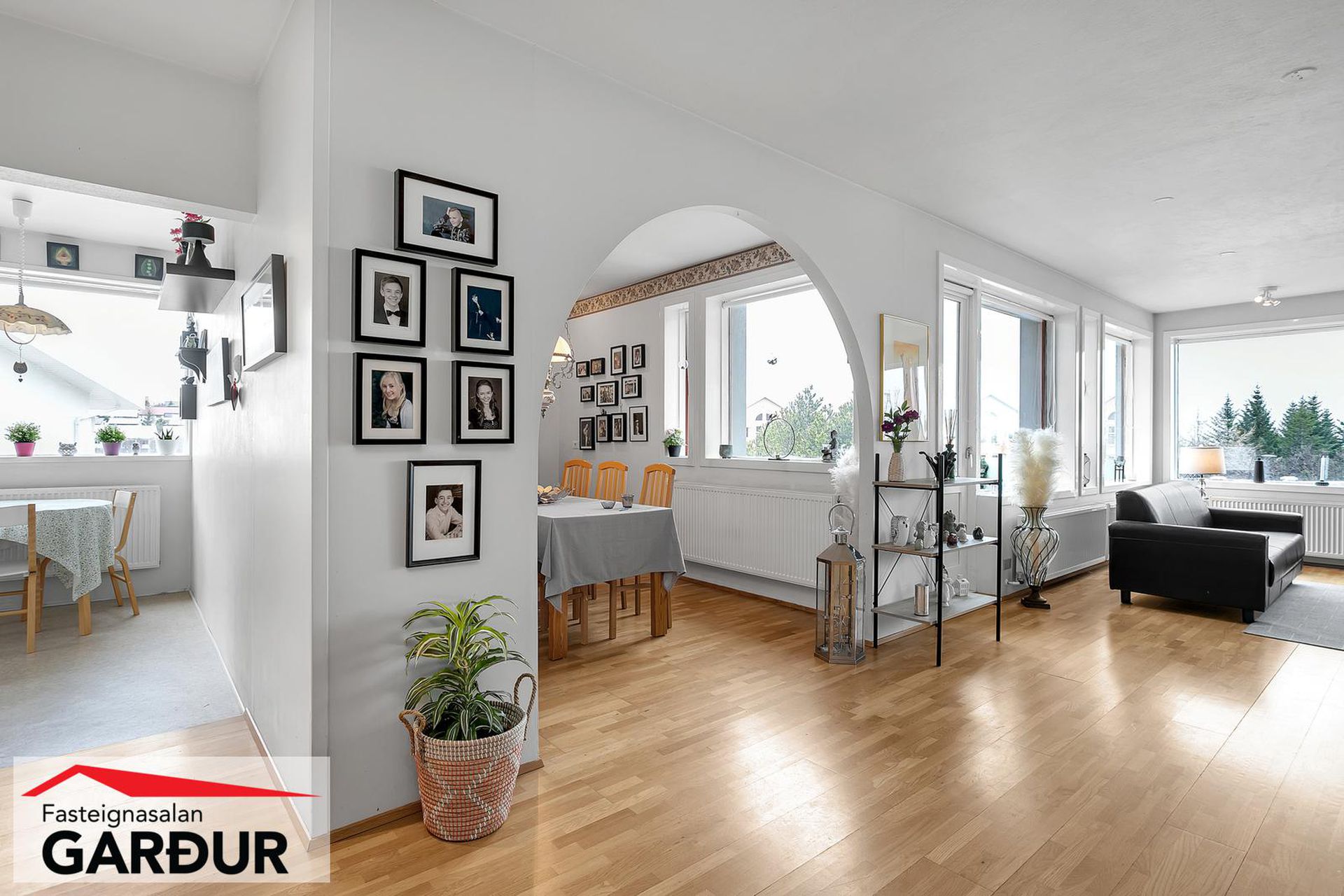 Bjartar rúmgóðar stofur með útsýni. Gengið út á svalir úr stofunni og þar er stigi niður í garðinn.