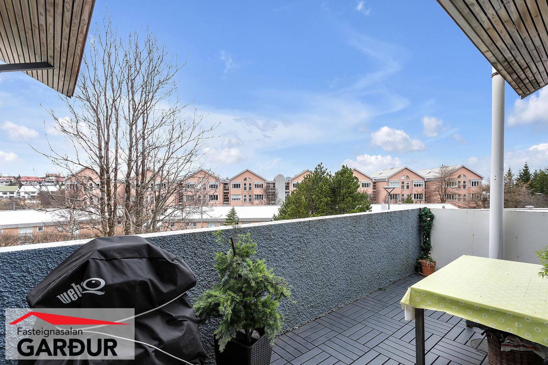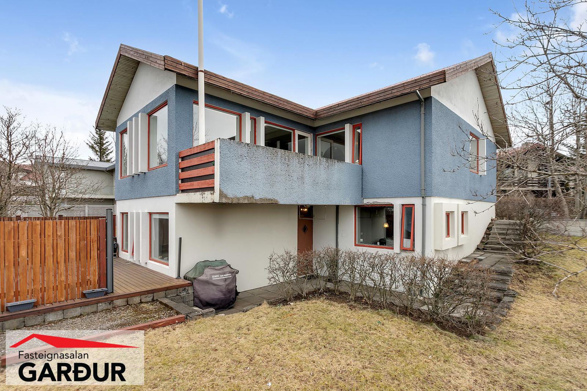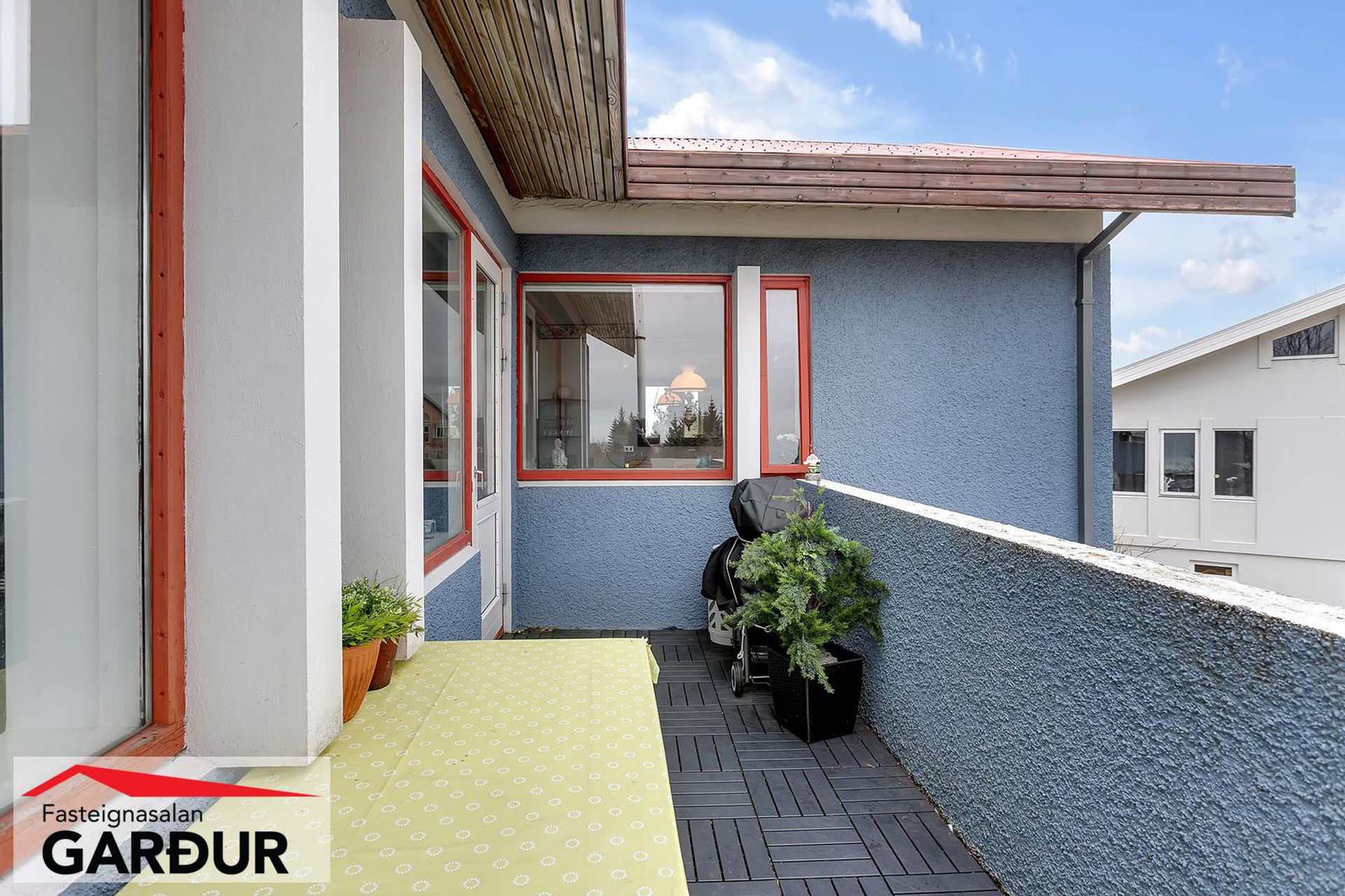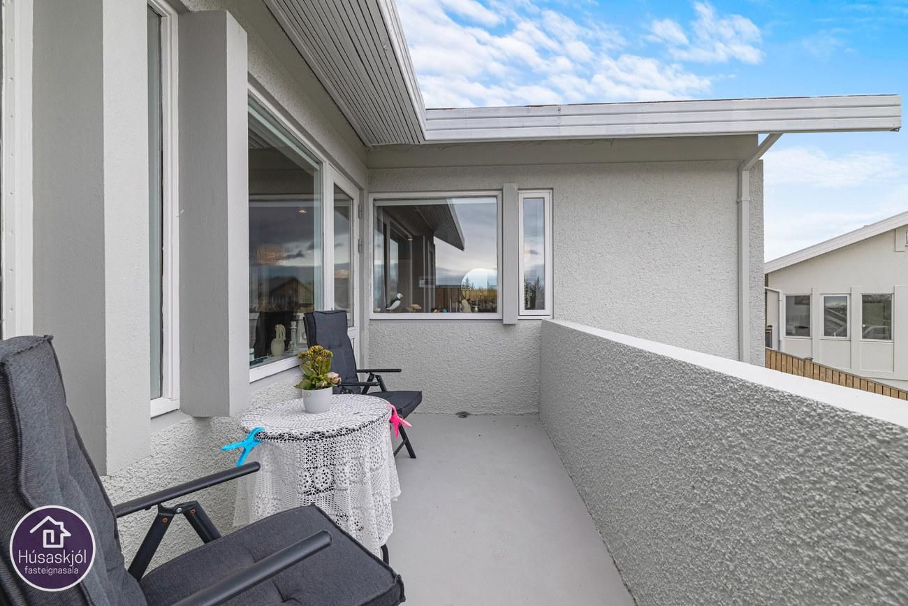 Bjartar rúmgóðar stofur með útsýni. Gengið út á svalir úr stofunni og þar er stigi niður í garðinn.