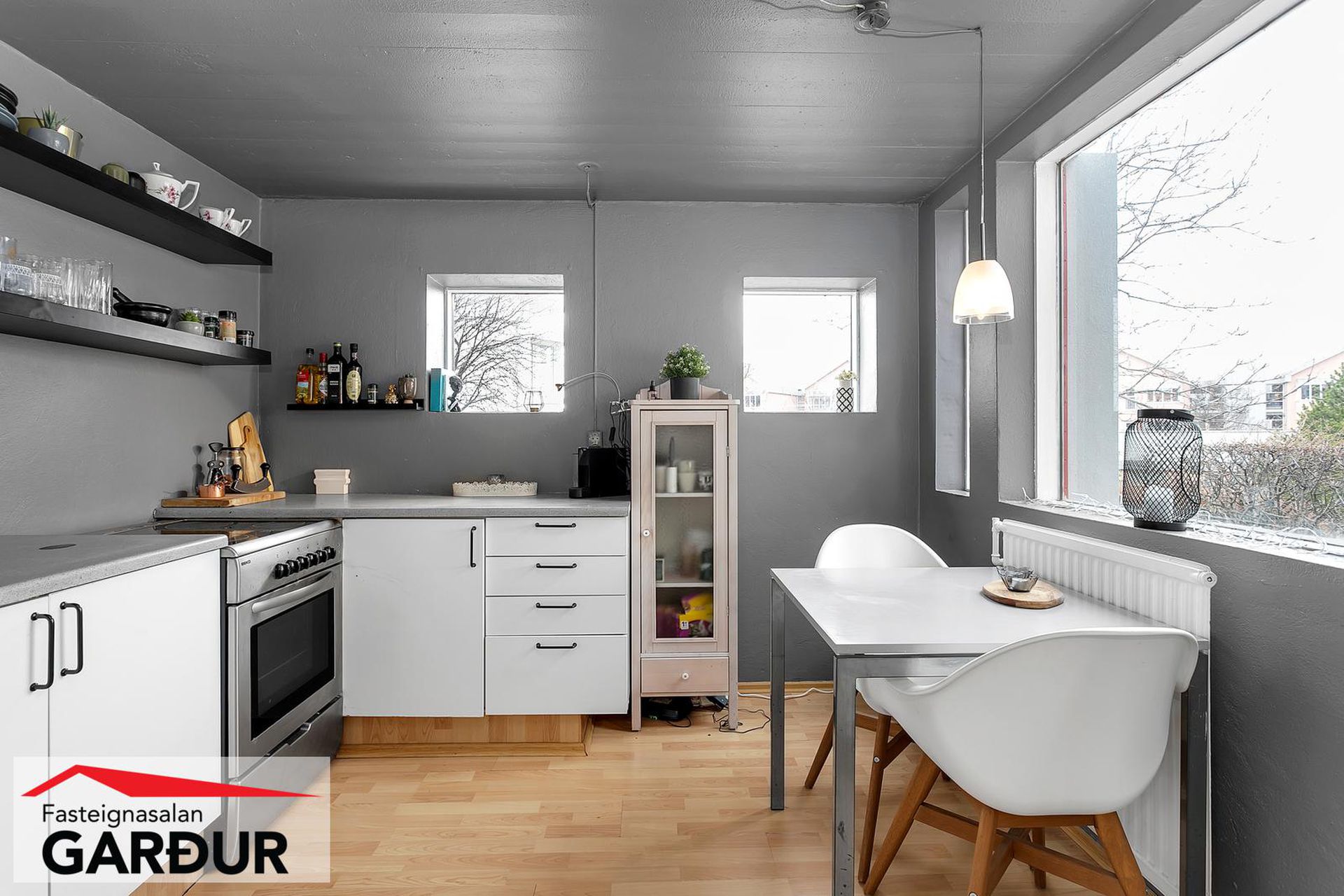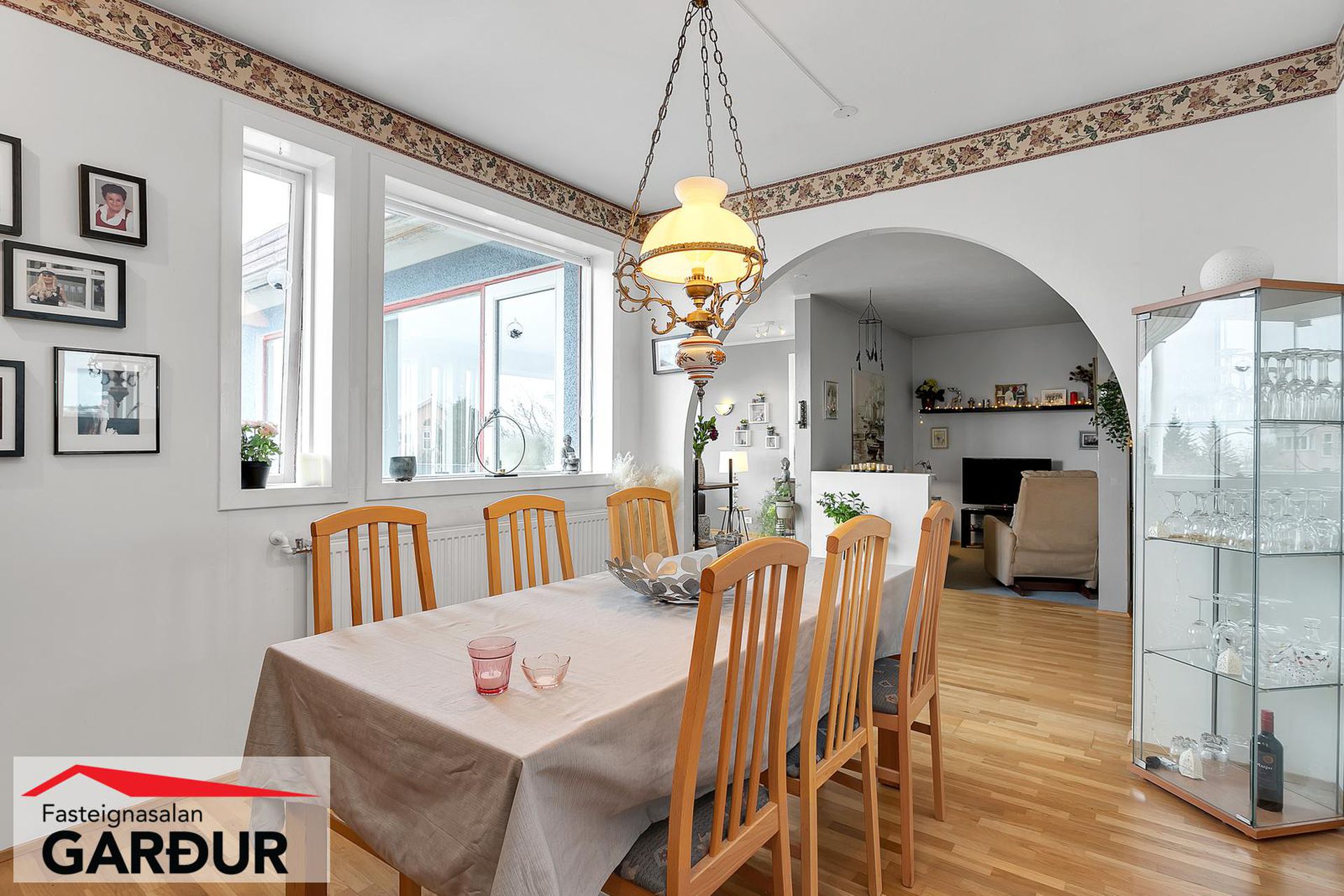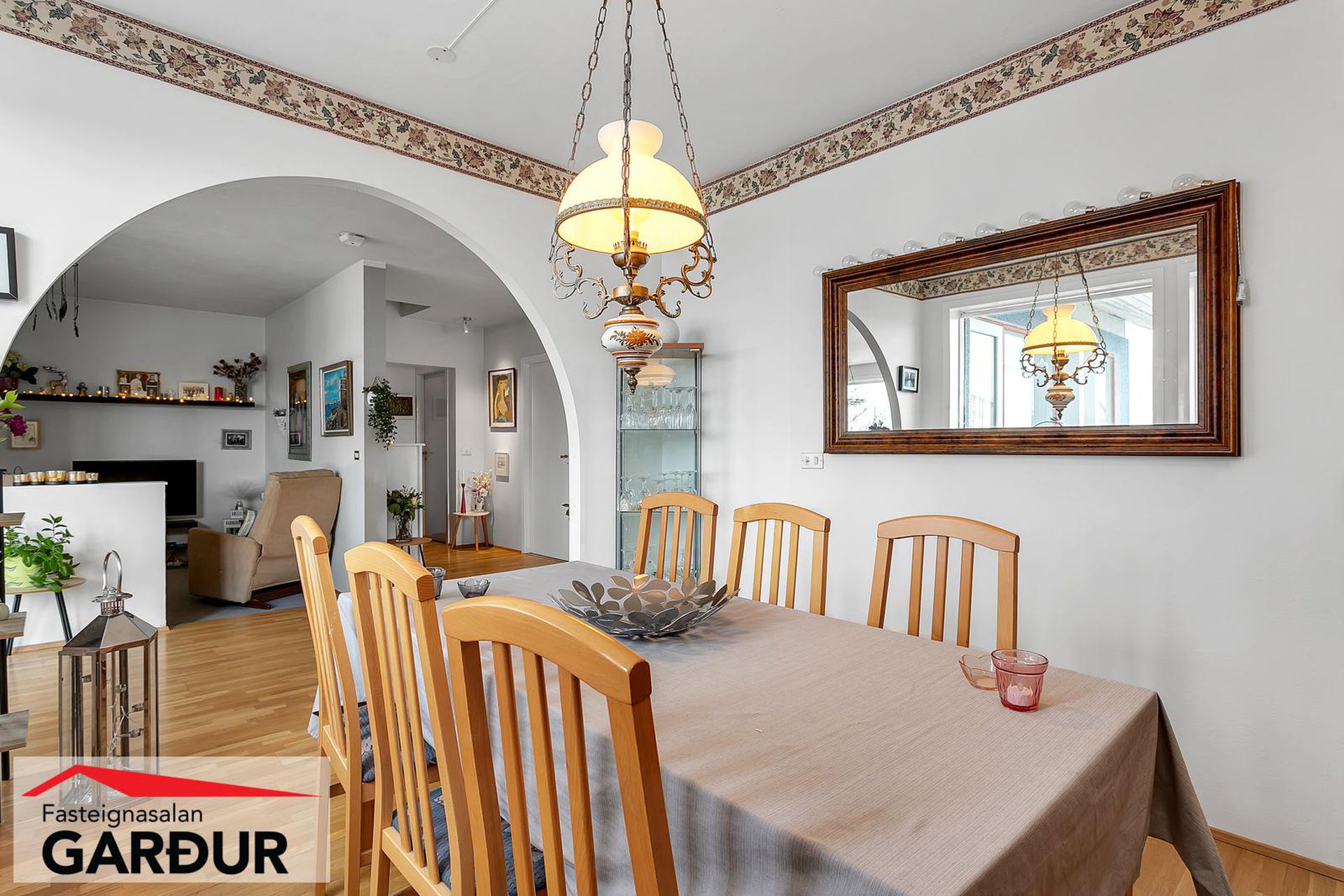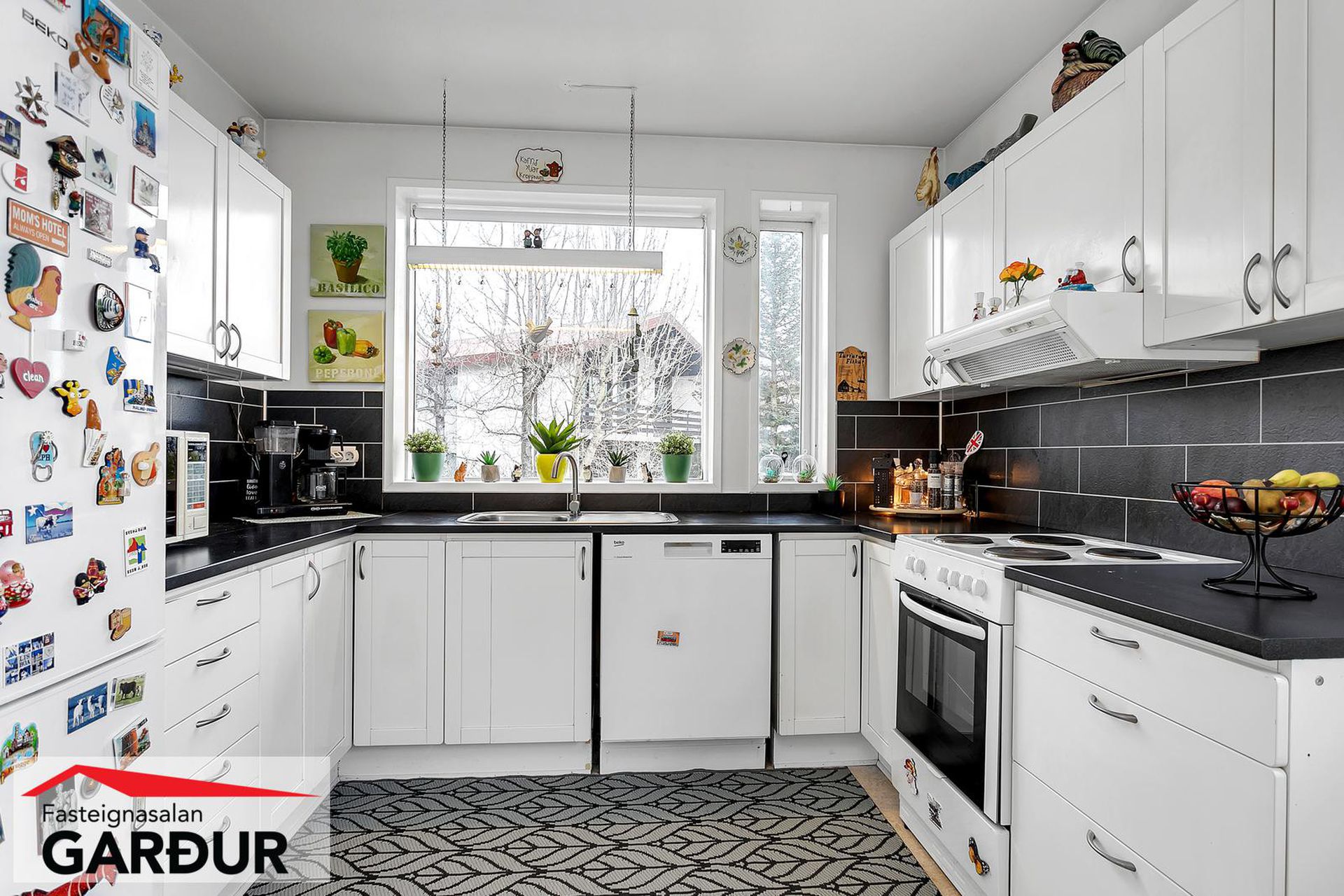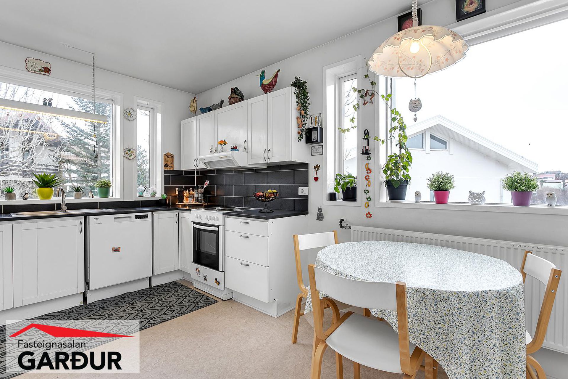 Eldhús er nýlegt með innréttingu í L og eyju. Gott vinnupláss og pláss fyrir stórt borðstofuborð við eldhúsið.