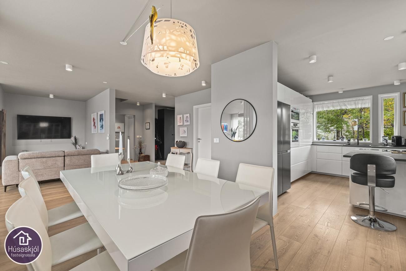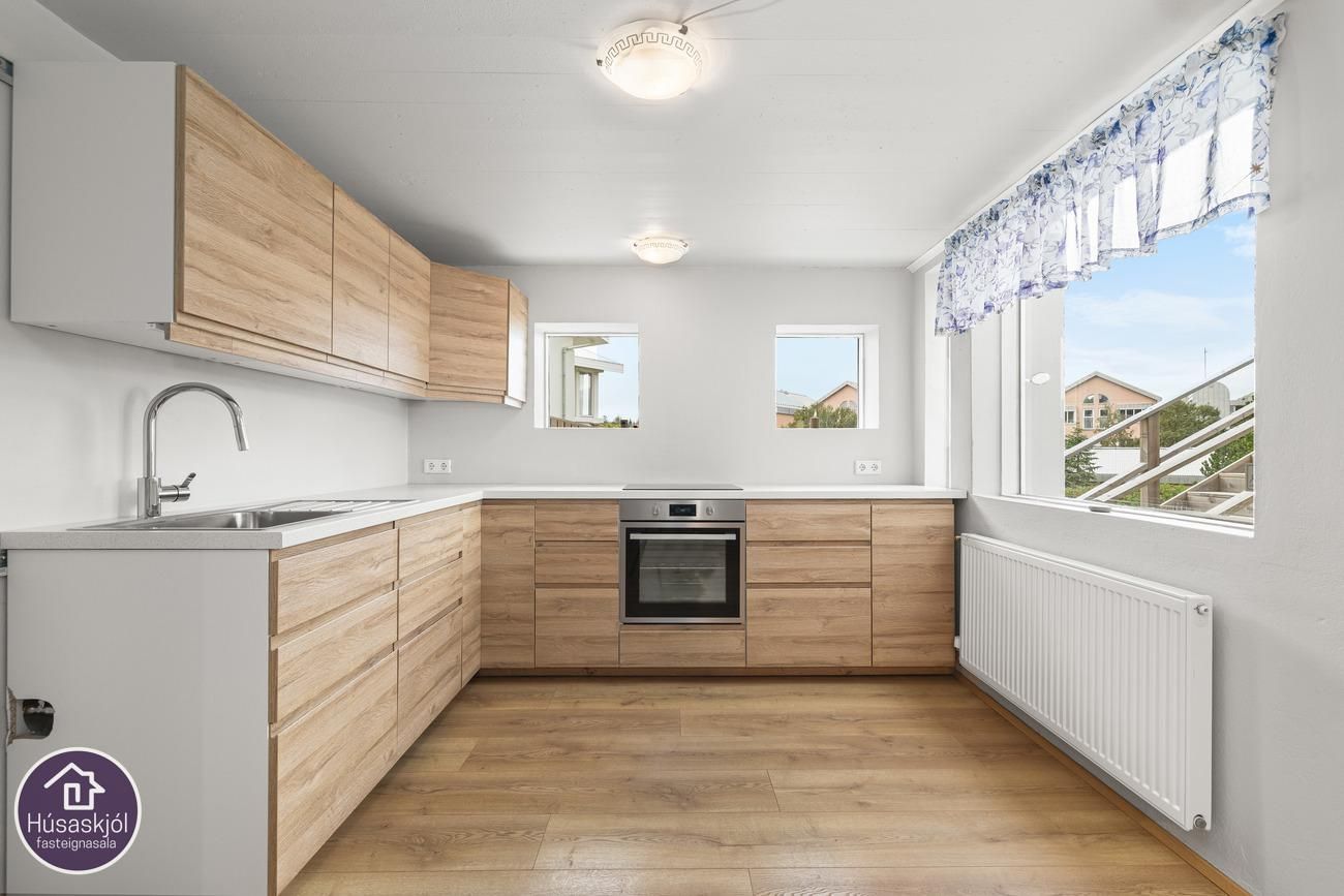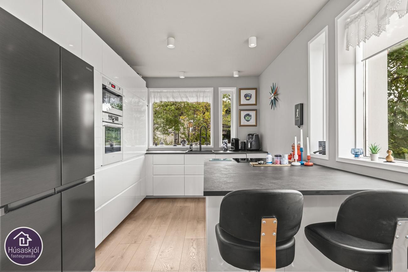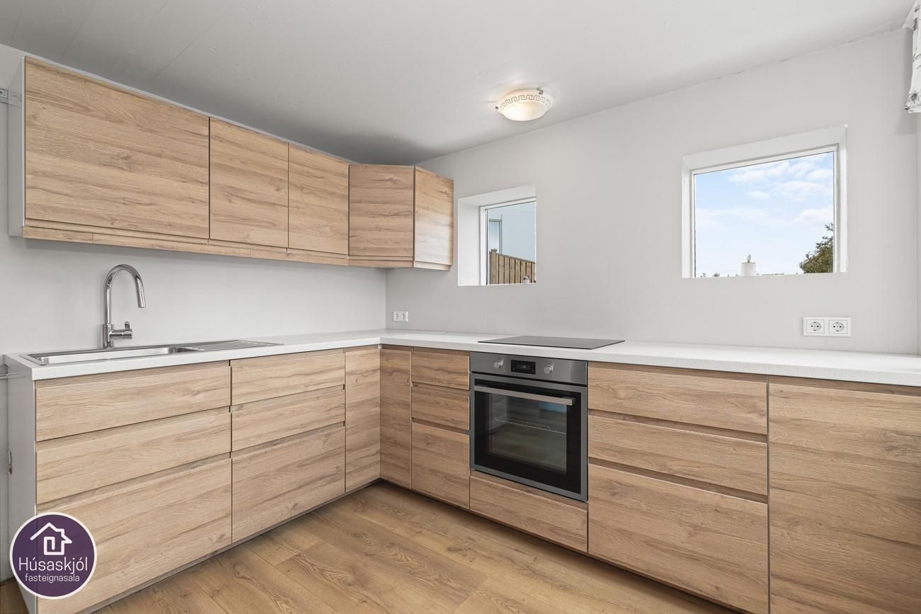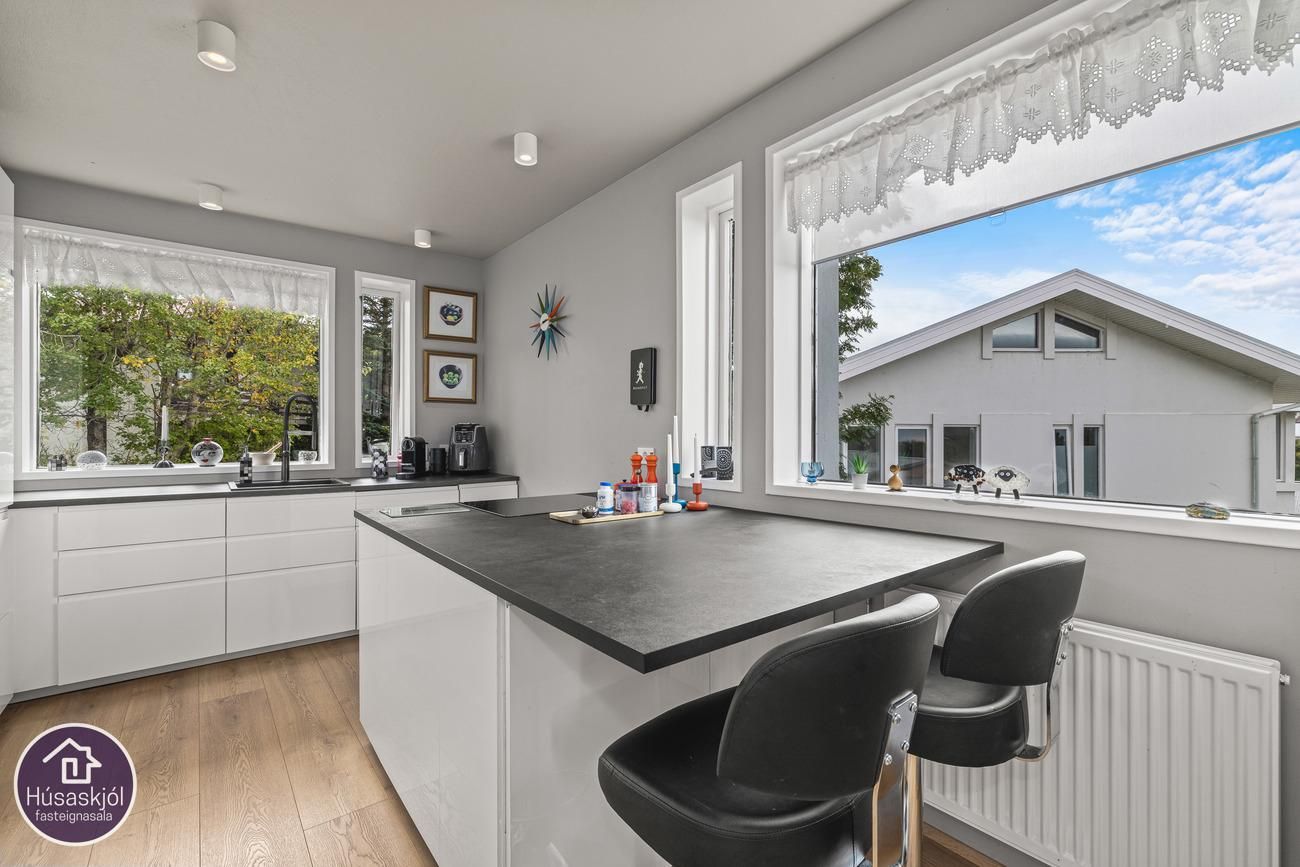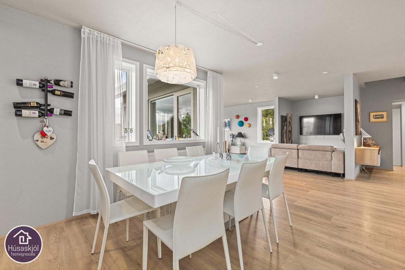 Eldhús er nýlegt með innréttingu í L og eyju. Gott vinnupláss og pláss fyrir stórt borðstofuborð við eldhúsið.