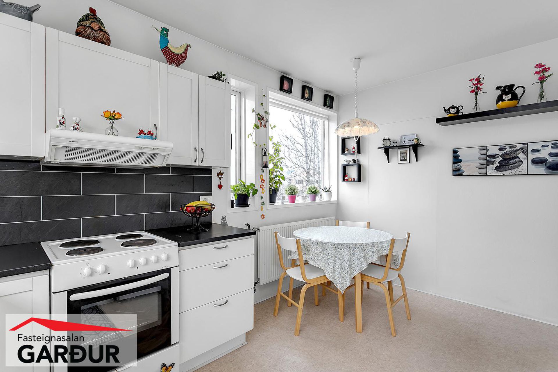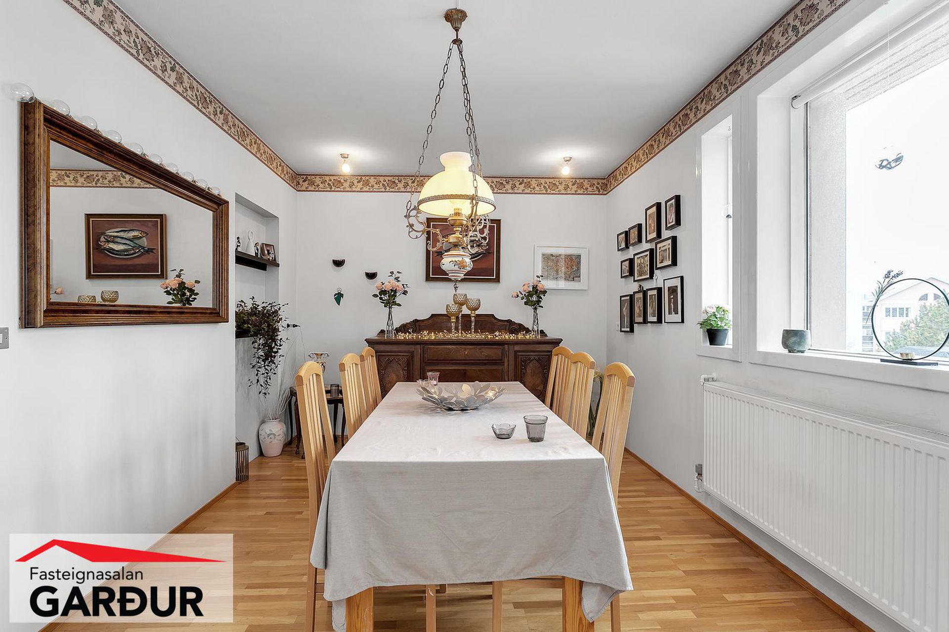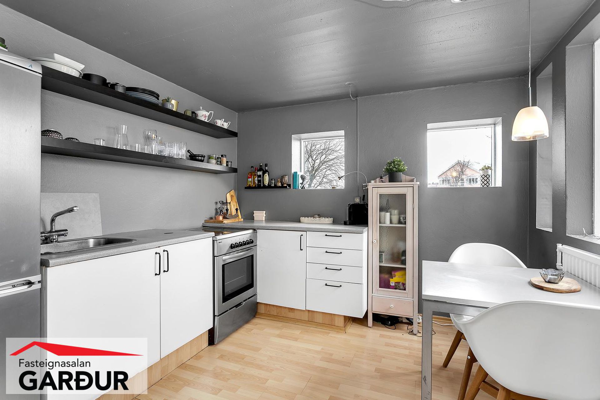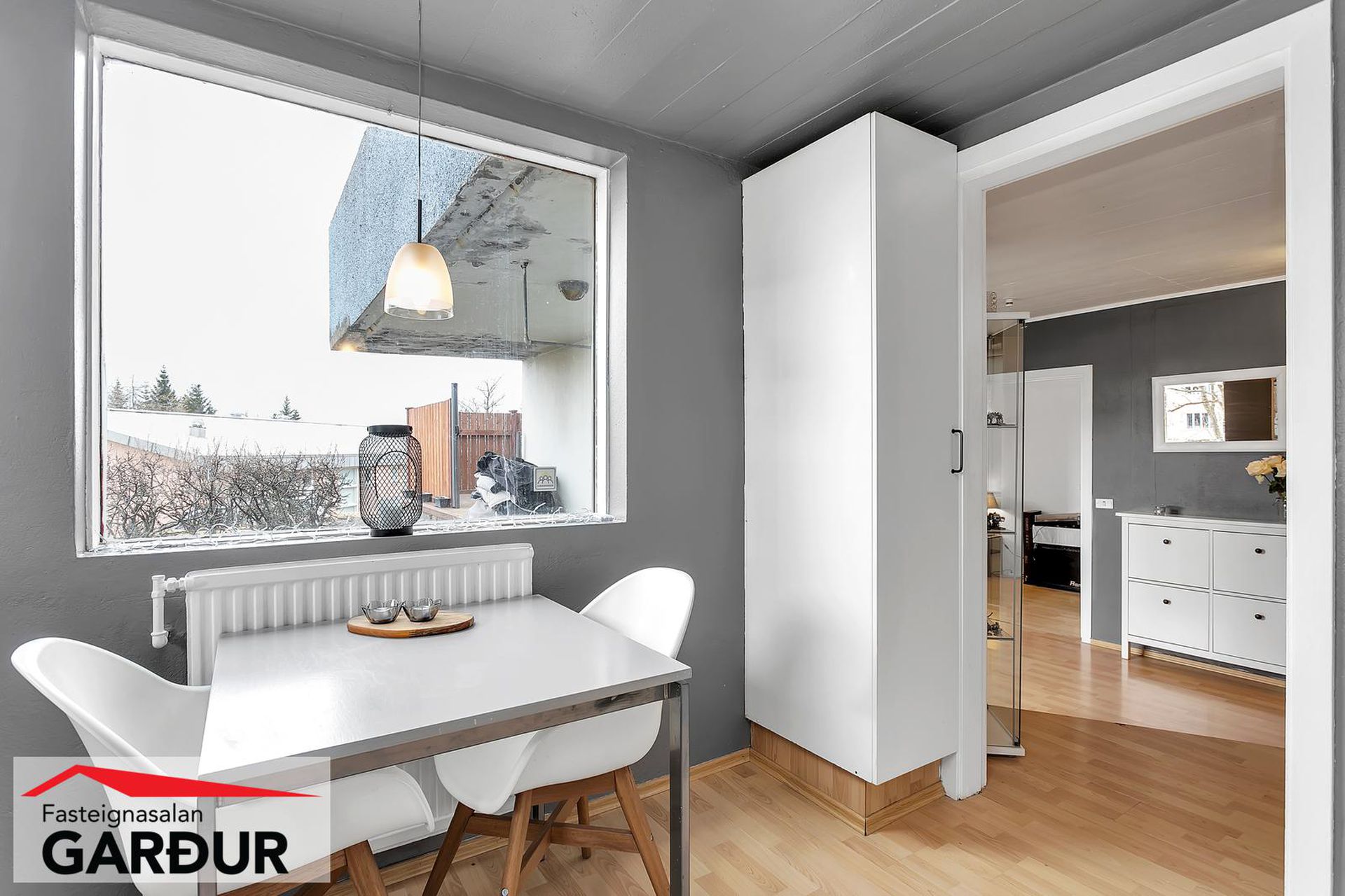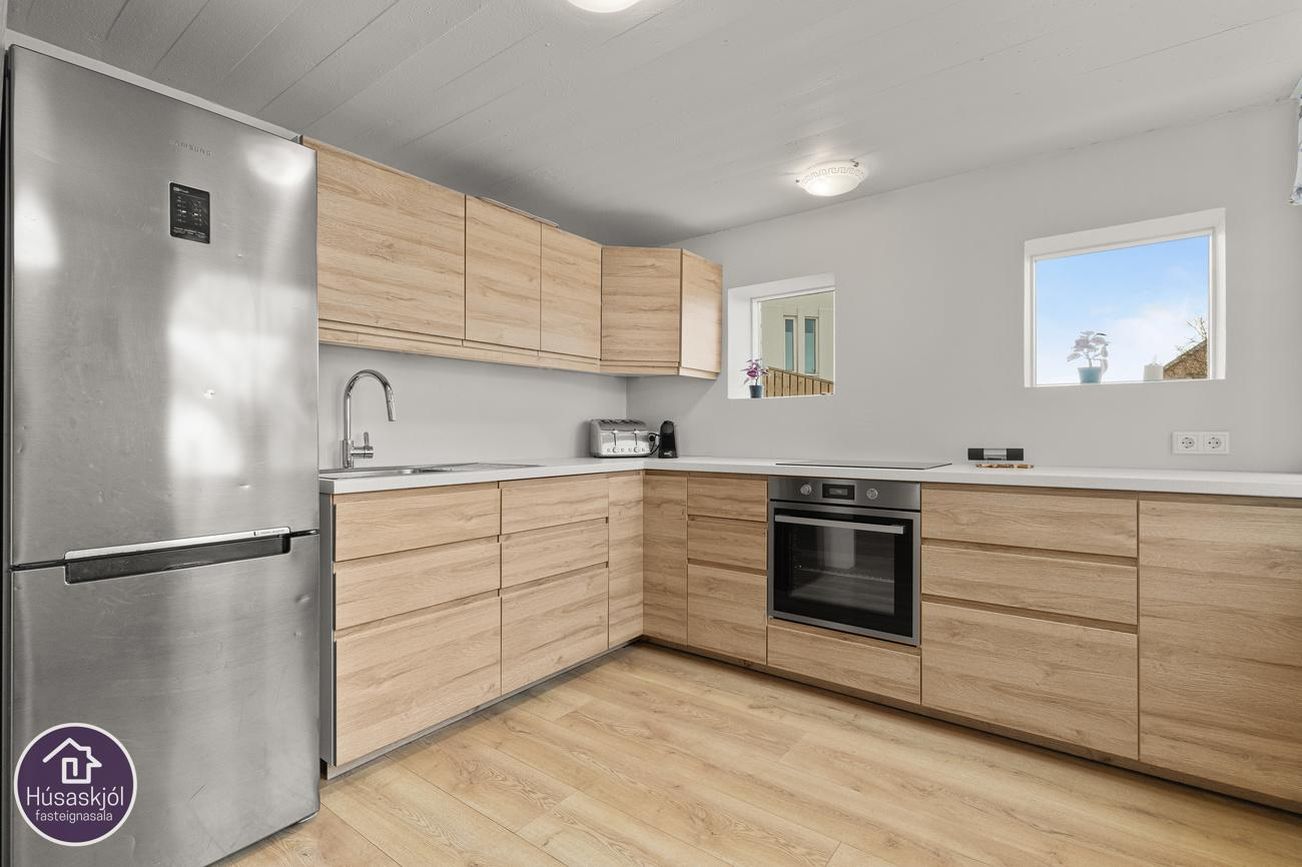 Eldhús er nýlegt með innréttingu í L og eyju. Gott vinnupláss og pláss fyrir stórt borðstofuborð við eldhúsið.