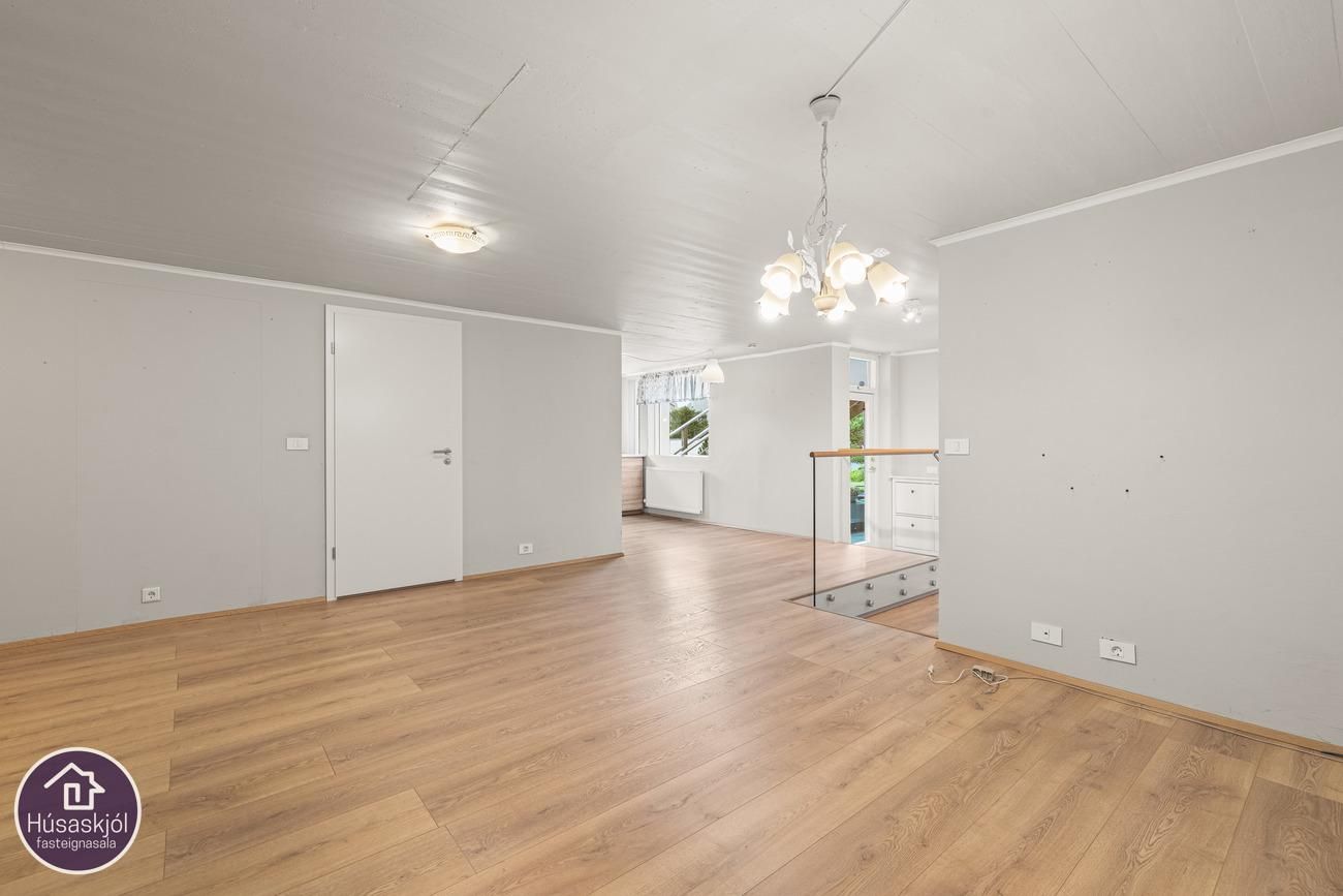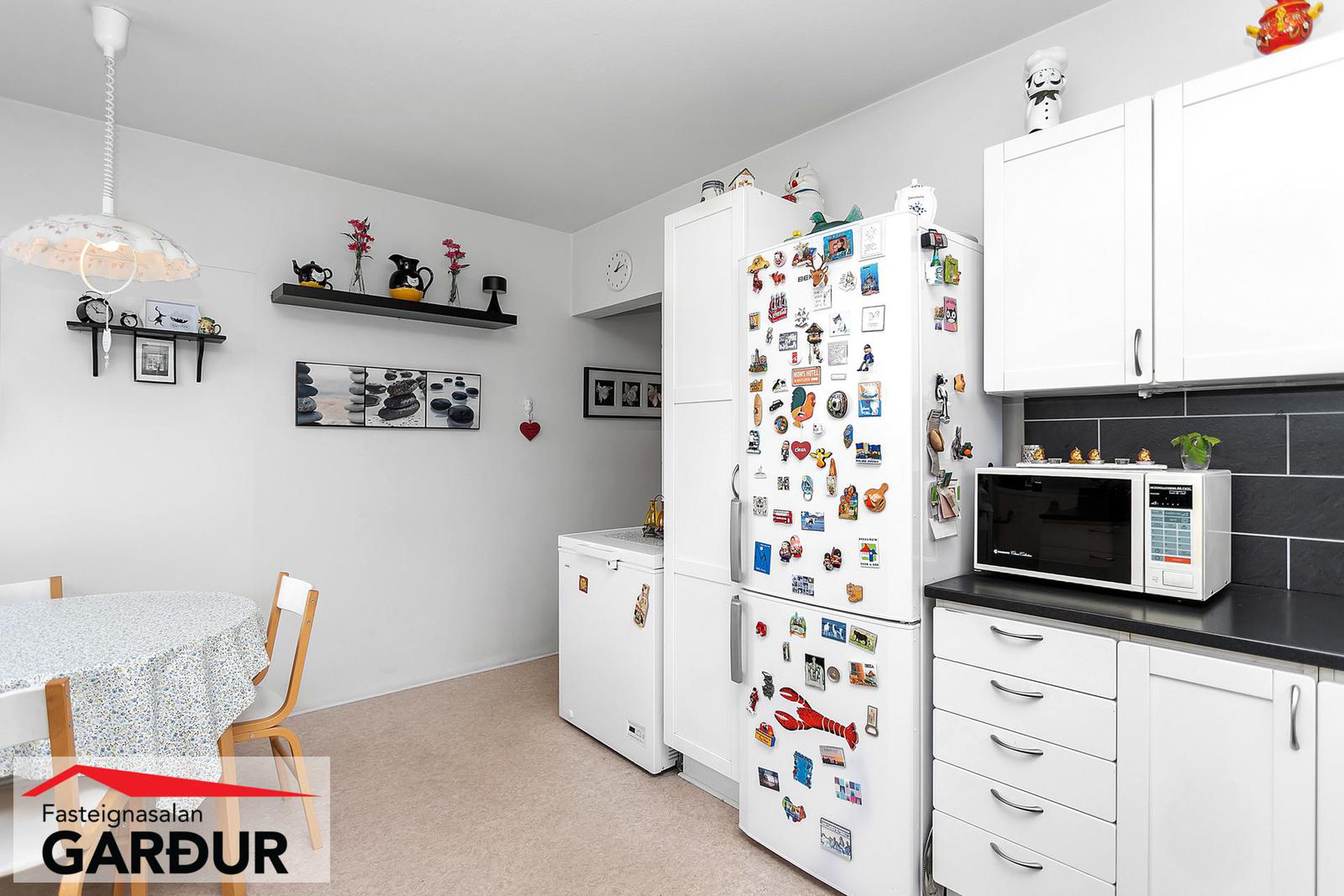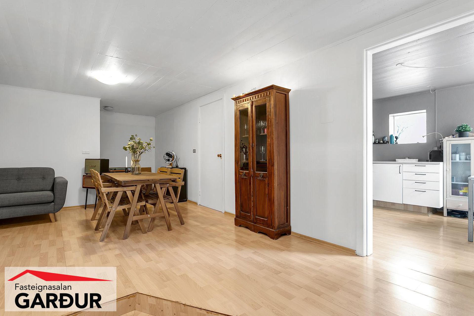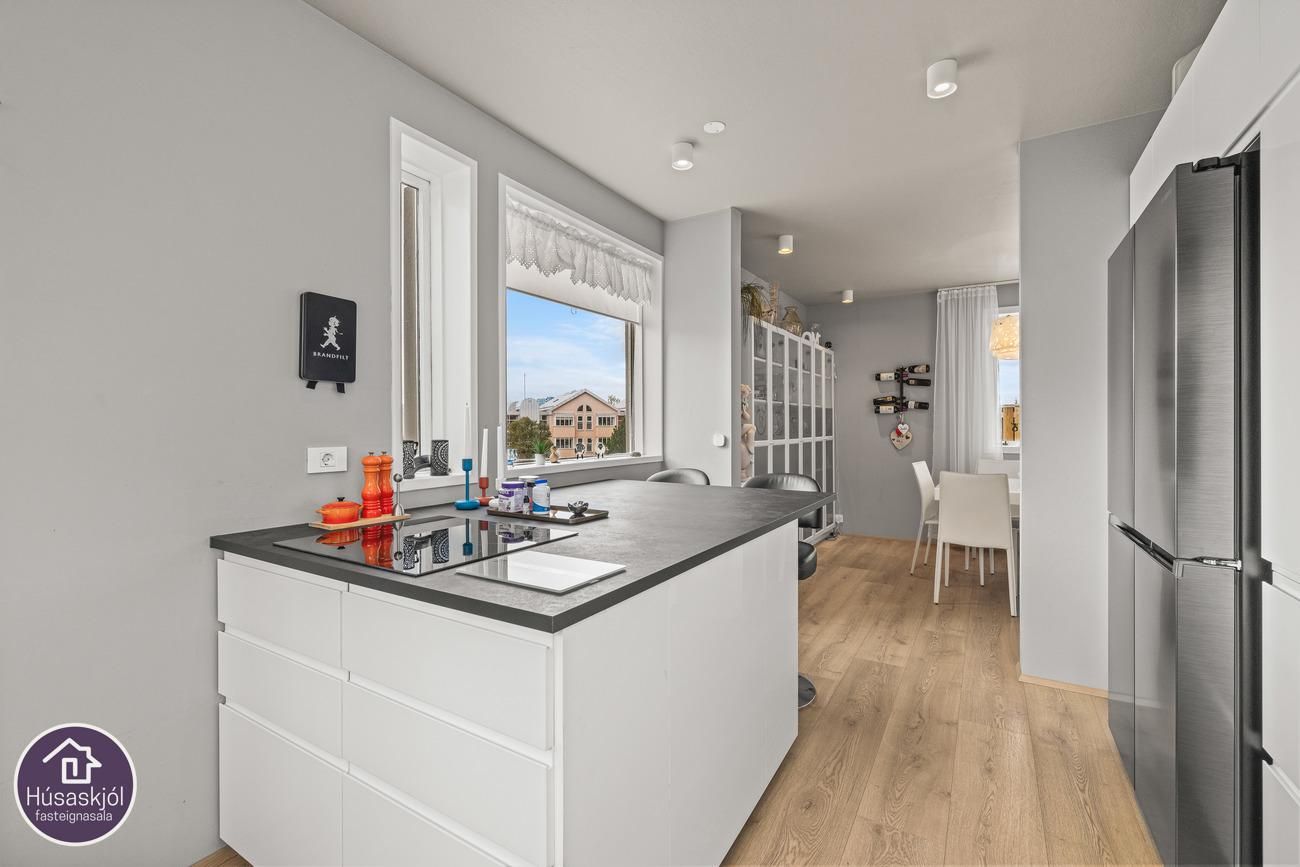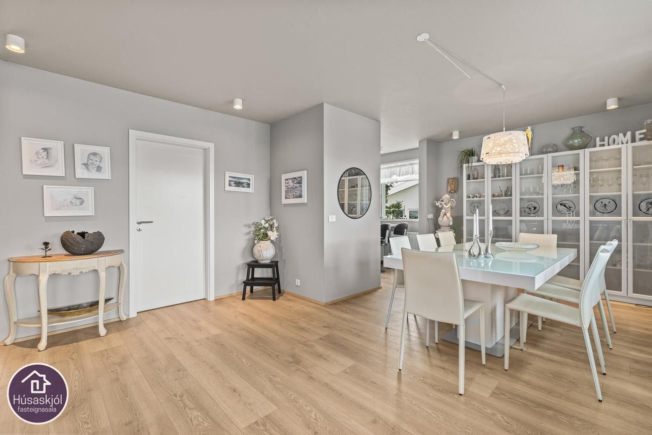 Eldhús er nýlegt með innréttingu í L og eyju. Gott vinnupláss og pláss fyrir stórt borðstofuborð við eldhúsið.