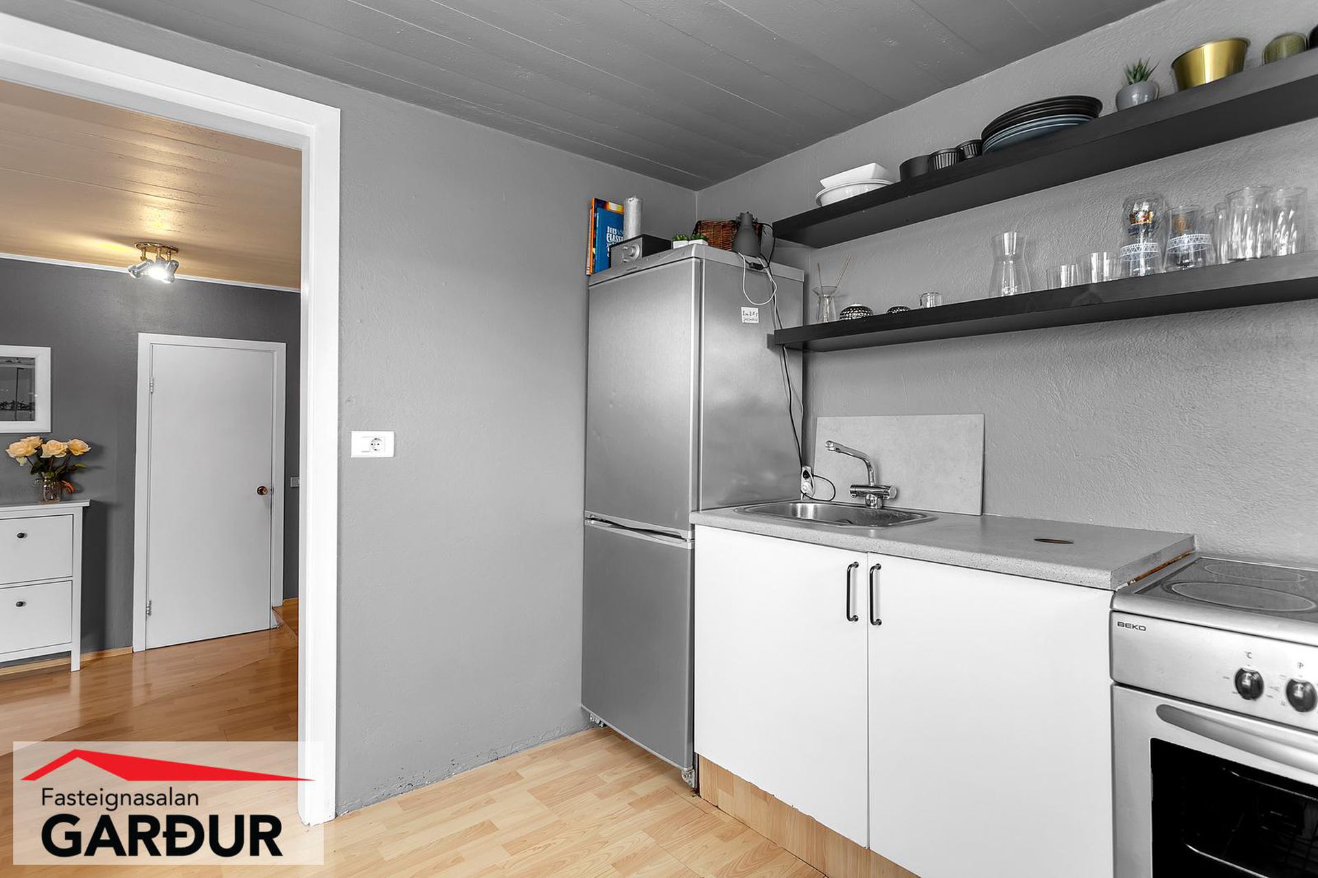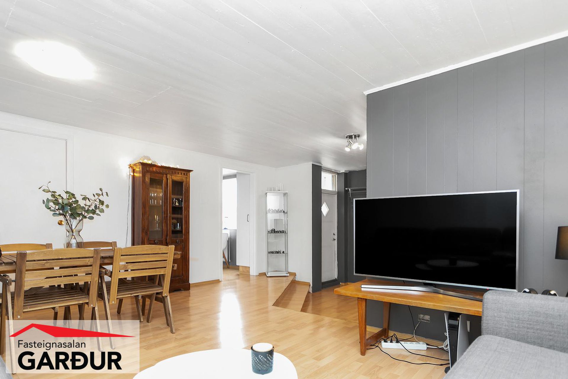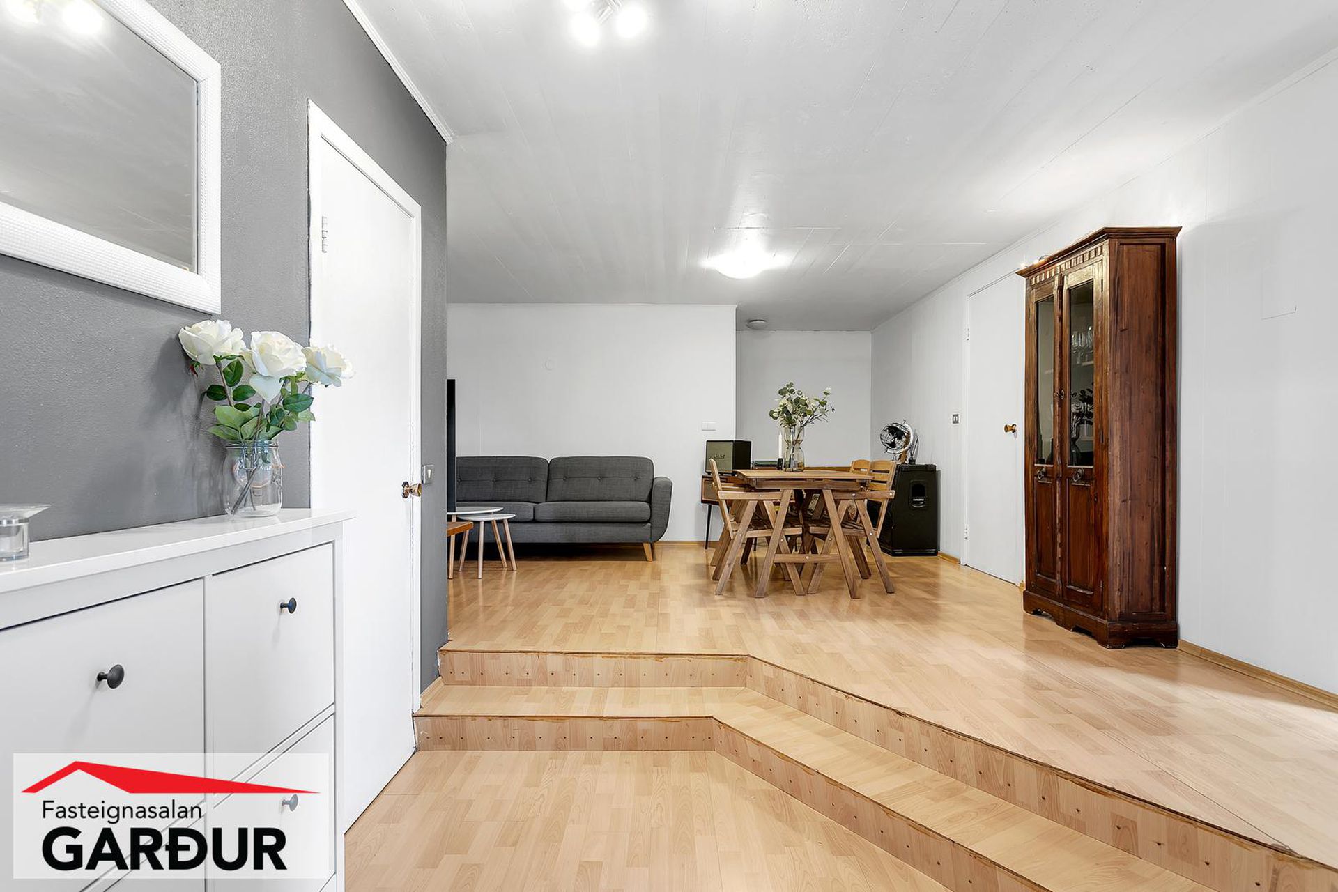 Gengið er upp 2 þrep í alrýmið sem er stofa og eldhús. Eldhús er nýlegt og bjart með 3 gluggum og innréttingu í L og borðkrók.