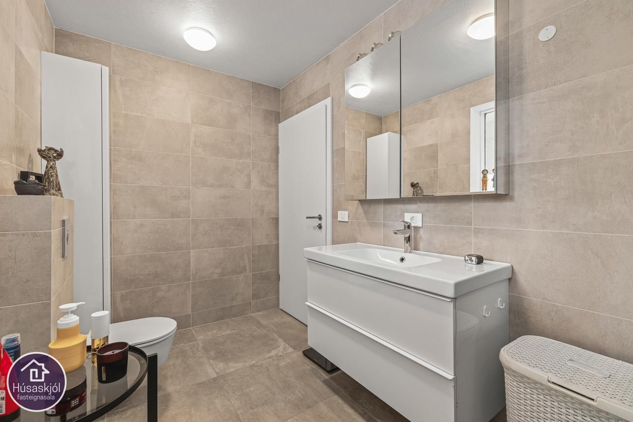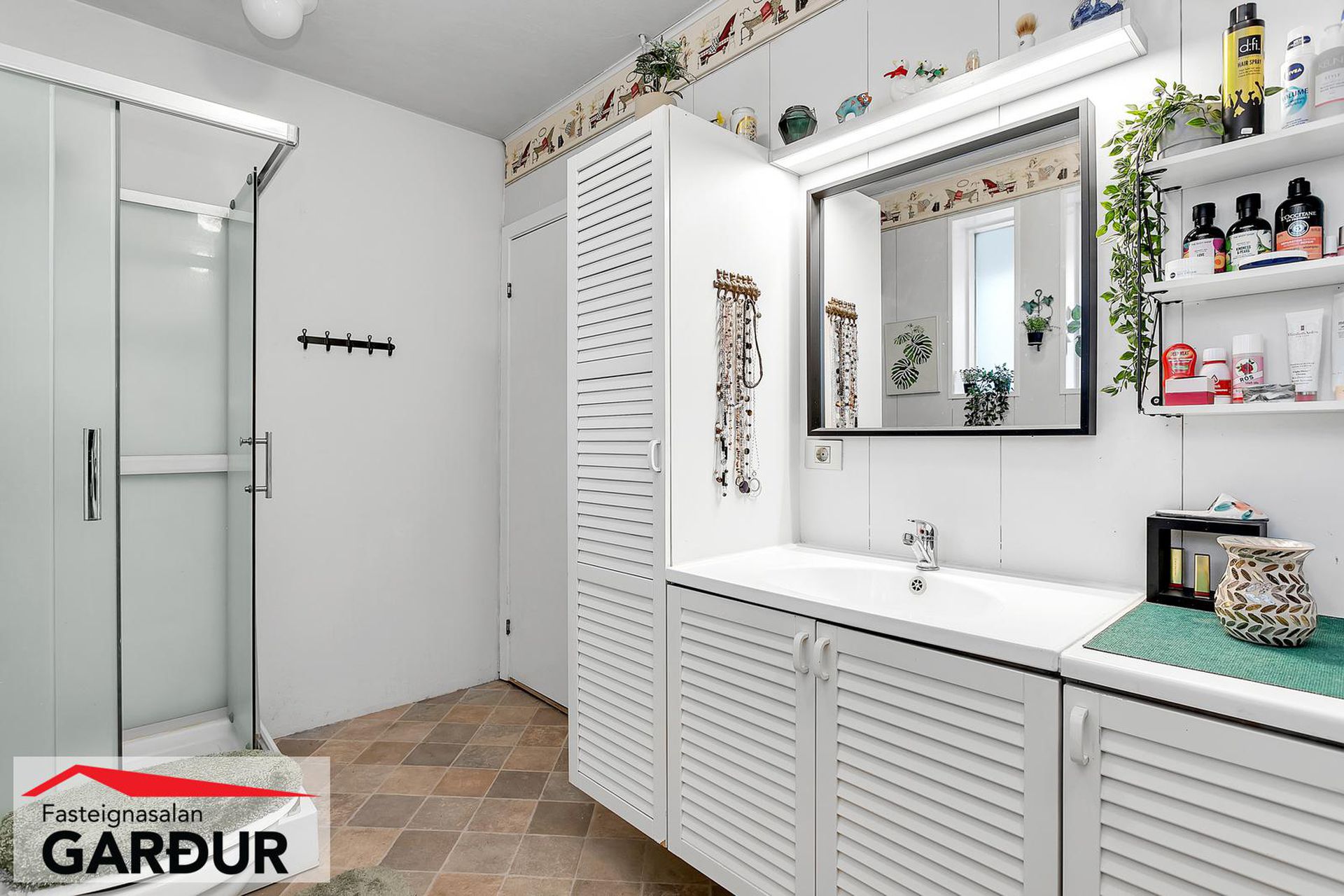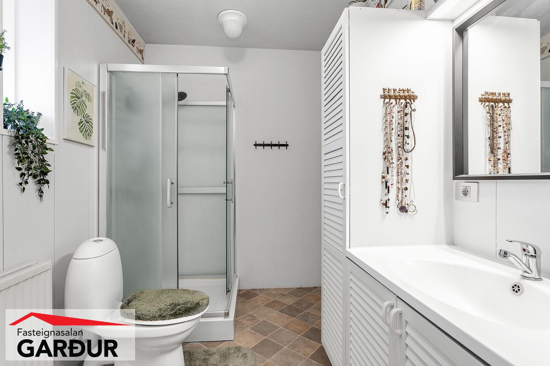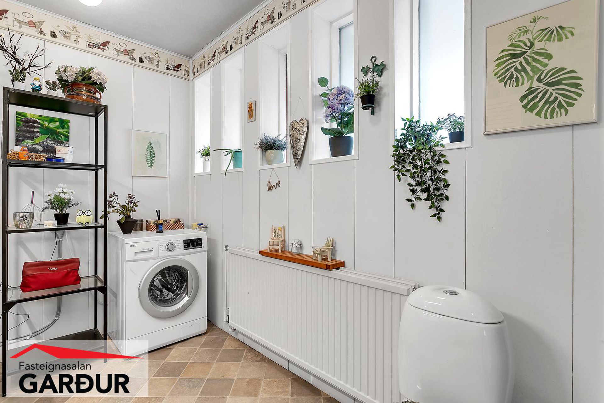 Baðherbergi er flísalagt í hólf og gólf. með walk in sturtu og glugga. Innaf baðherbergi er þvottahús/geymsla.