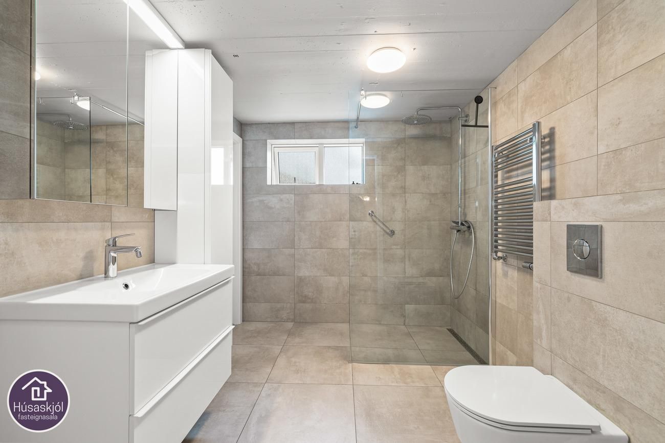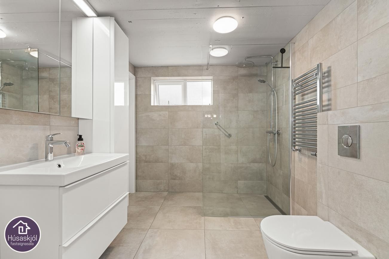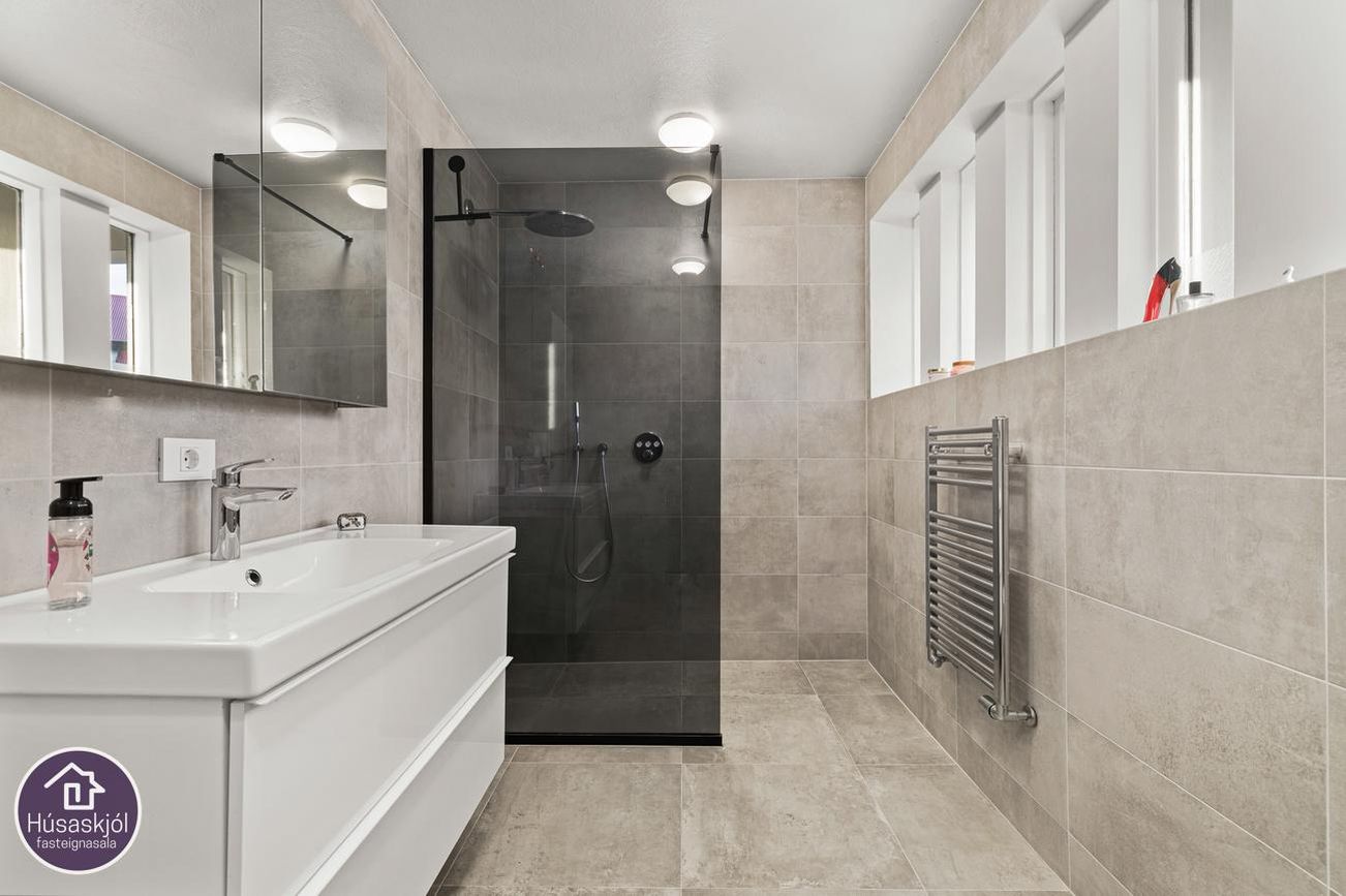 Baðherbergi er mjög rúmgott og flísalagt í hólf og gólf. Walk in sturta með kraftmikilli sturtu. Gluggar og handklæðaofn.
