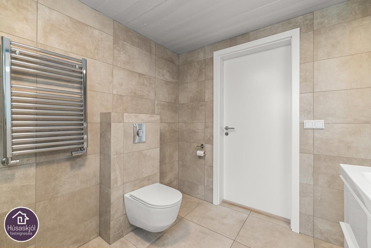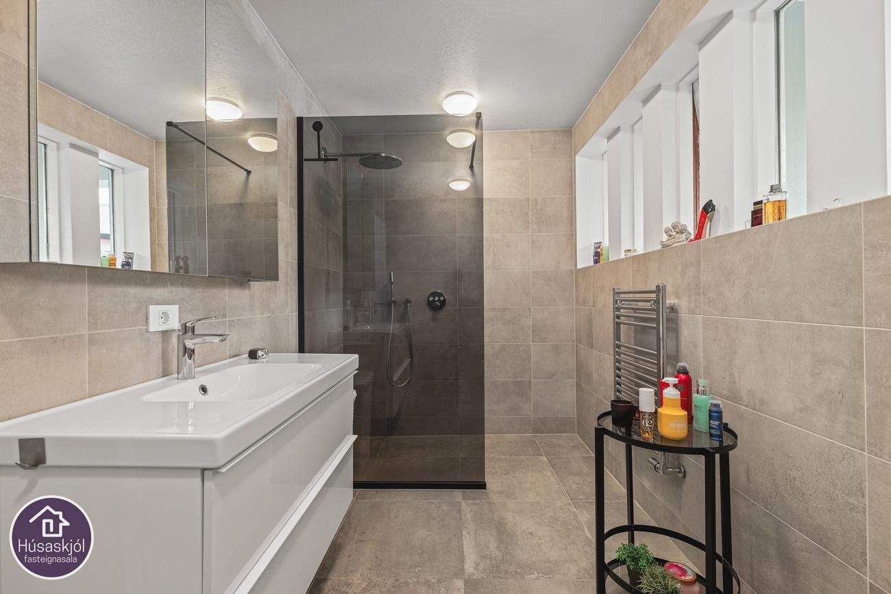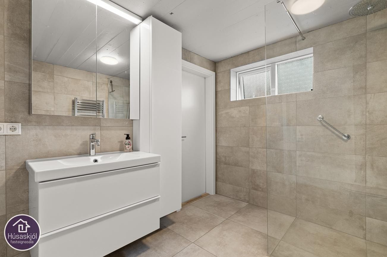 Baðherbergi er mjög rúmgott og flísalagt í hólf og gólf. Walk in sturta með kraftmikilli sturtu. Gluggar og handklæðaofn.