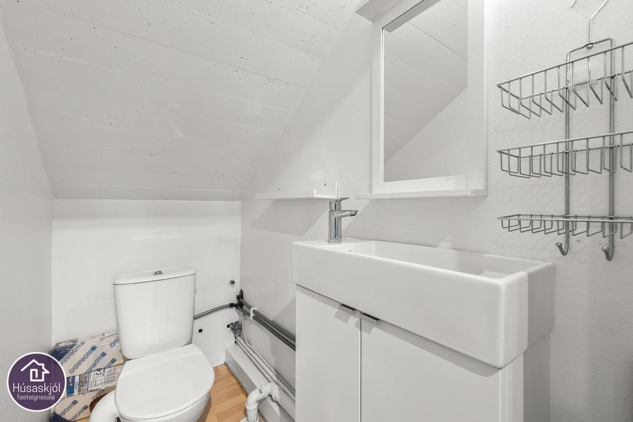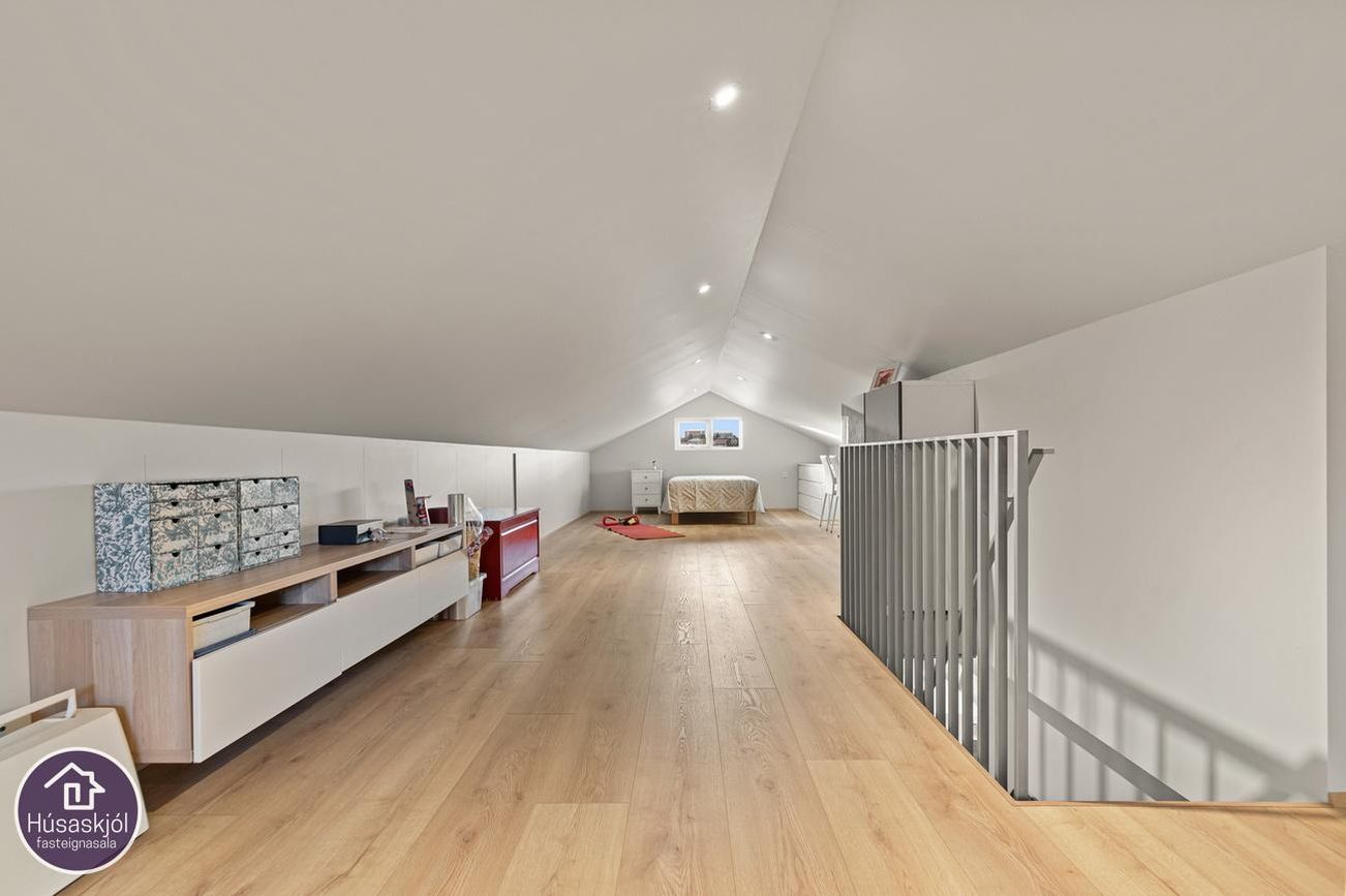 Úr holinu er farið upp á nýuppgert parketlagt rými á háalofti sem liggur yfir húsinu og er óskráð. Rýmið er ca 50 fm (að sögn seljenda) og býður uppá mikla möguleika. Gluggar eru á báðum göflum og auðvelt að skipta rýminu .Einnig er mikið geymslurými undir súðinni.