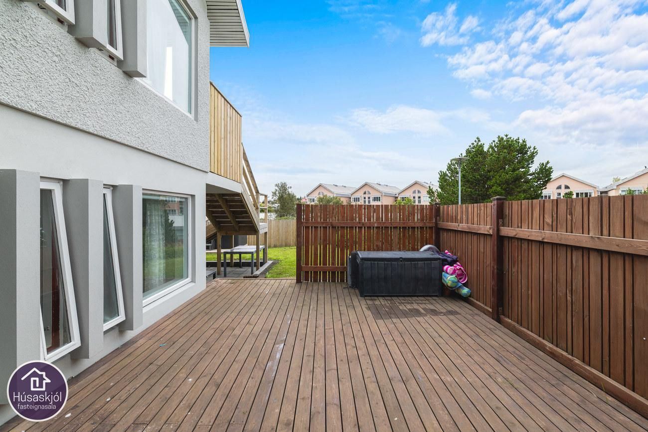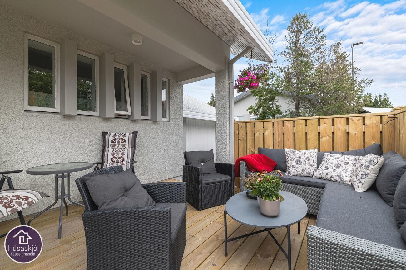 Fyrir framan neðri hæðina er sér sólpallur og gott útisvæði með hita í stéttum.