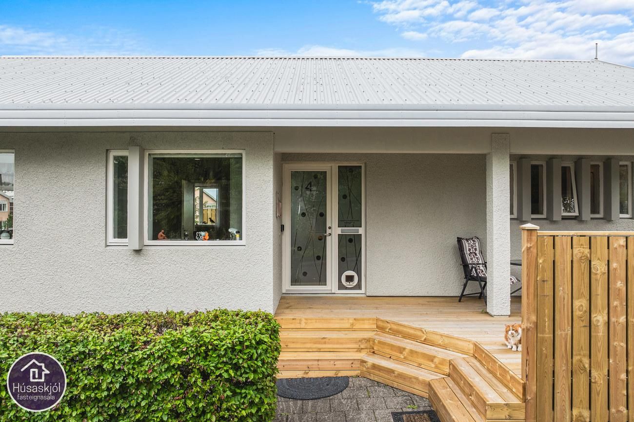 Gengið er niður stiga meðfram húsinu sem er með hitalögn og inn í íbúð á neðri hæðinni.