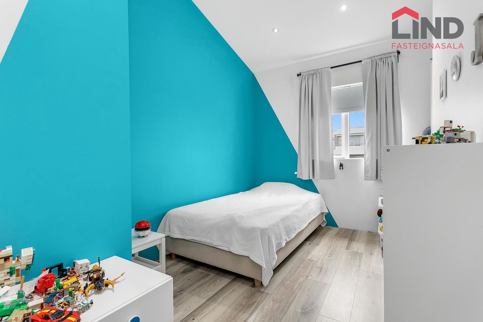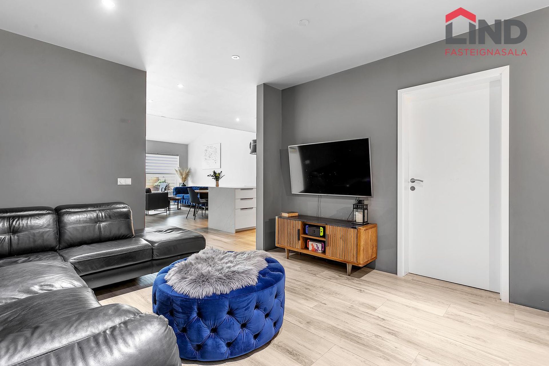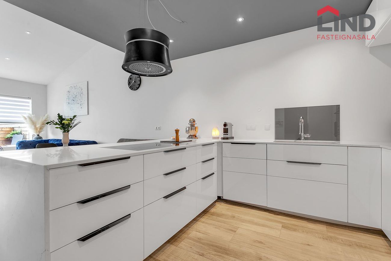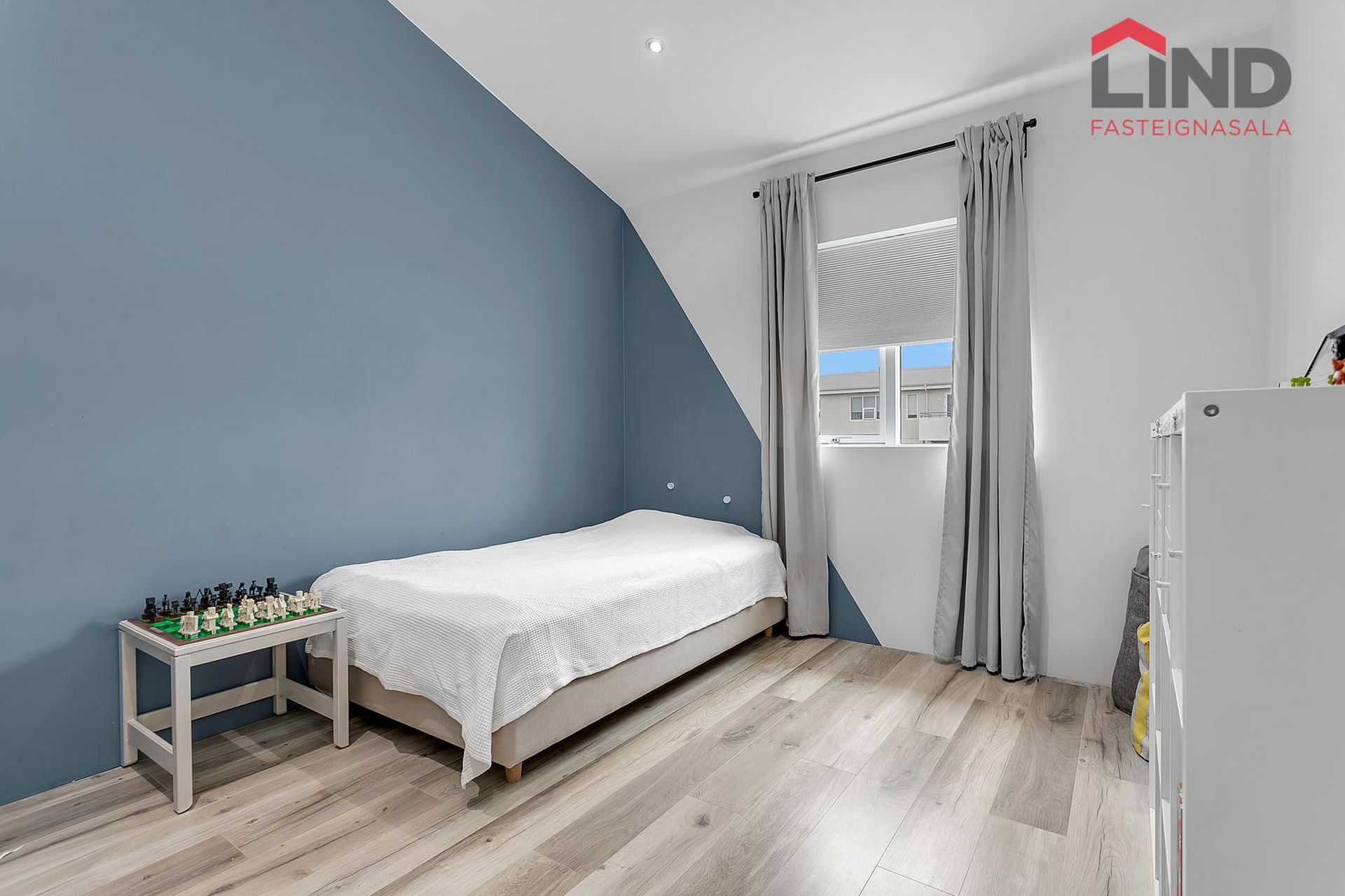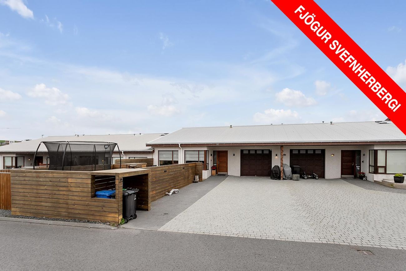 Lind fasteignasala og Elías Haraldsson löggiltur fasteignasali ( sími 777-5454), kynna : einstaklega fallegt 183,1 fermetra raðhús á einni hæð (byggt 2013). Um er að ræða mjög vel skipulagt og skemmtilegt hús með extra lofthæð. Óvenju góður flísalagður bílskúr (38 fermetrar ásamt 18,3 fermetra milliloft samtals 56,3 fermetrar). Fallegar vandaðar samstæðar innréttingar, parket og flísar á gólfum. Góður sólpallur og stórt upphitað hellulagt bílastæði fyrir framan bílskúr.Eignin skiptist : forstofa, þvotthús, baðherbergi, sjónvarpshol, hjónaherbergi, barnaherbergi l, barnaherbergi ll, eldhús, stofa og bílskúr.Nánari lýsing :Forstofa : flísalögð með tvöföldum fataskáp. innangengt í bílskúr.Þvottahús : flísalagt, góð innrétting með þvottavél og þurkara í vinnu hæð.Baðherbergi : flísalagt með fallegri innréttingu við handlaug, stór skápur, vegghengt salerni, baðkar og góð sturta.Hjónaherbergi : parketlagt með fataherbergi.Barnaherbergi l : parketlagt með fataskáp.Barnaherbergi ll : parketlagt með fatahengi.Sjónvarpshol : parket/flísarEldhús : parket/flísar, falleg hvít innrétting með eyju, steinborðplötum og borðkrók. innbyggður ísskápur og uppþvottavél.Stofa : parket/flísar með góðum suður gluggum.Lóð : mjög snyrtileg með góðum sólpalli og stóru hellulögðu bílaplani með sjóbræðslu fyrir framan bílskúr.Hús að utan : mjög snyrtilegt.