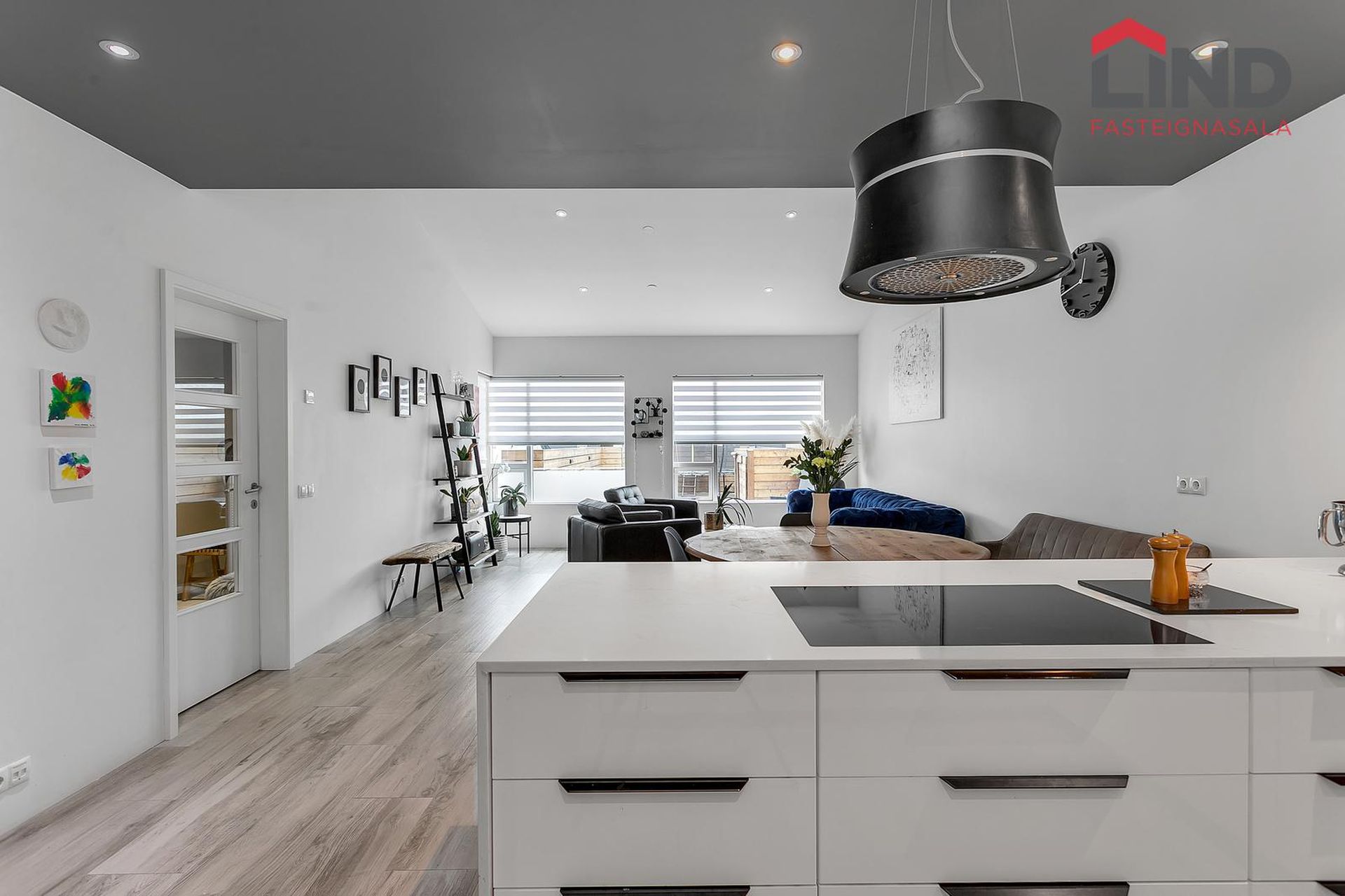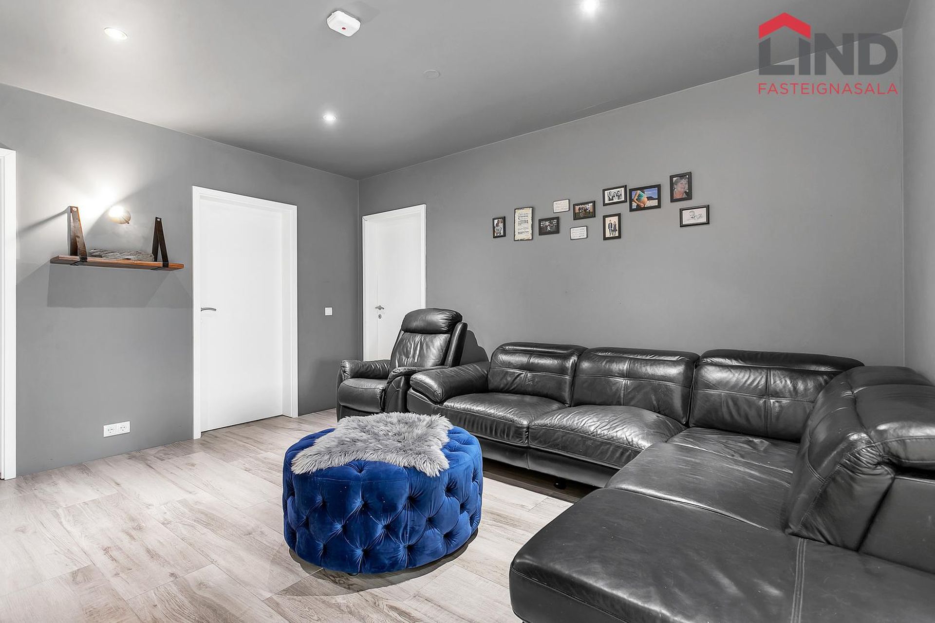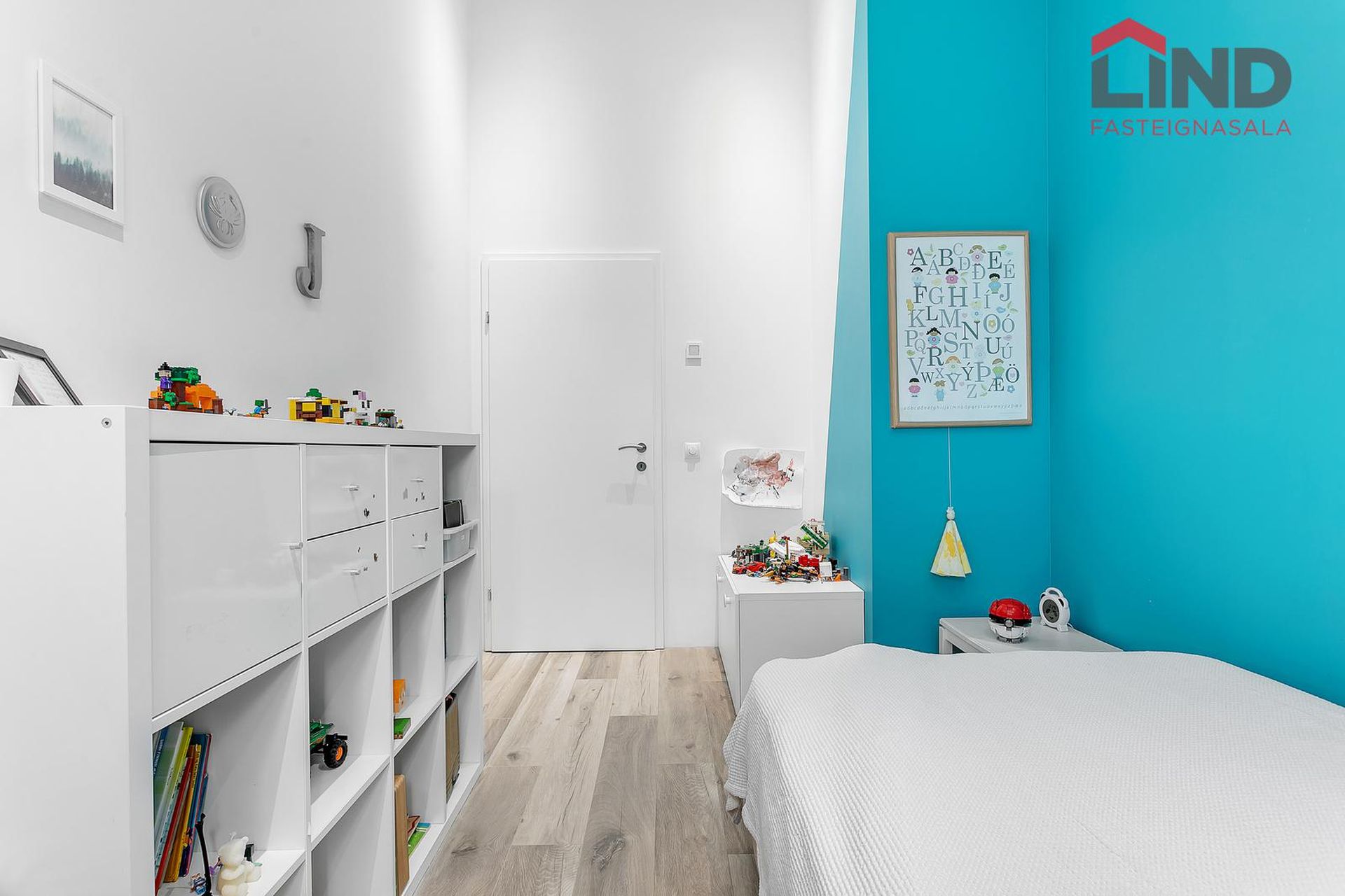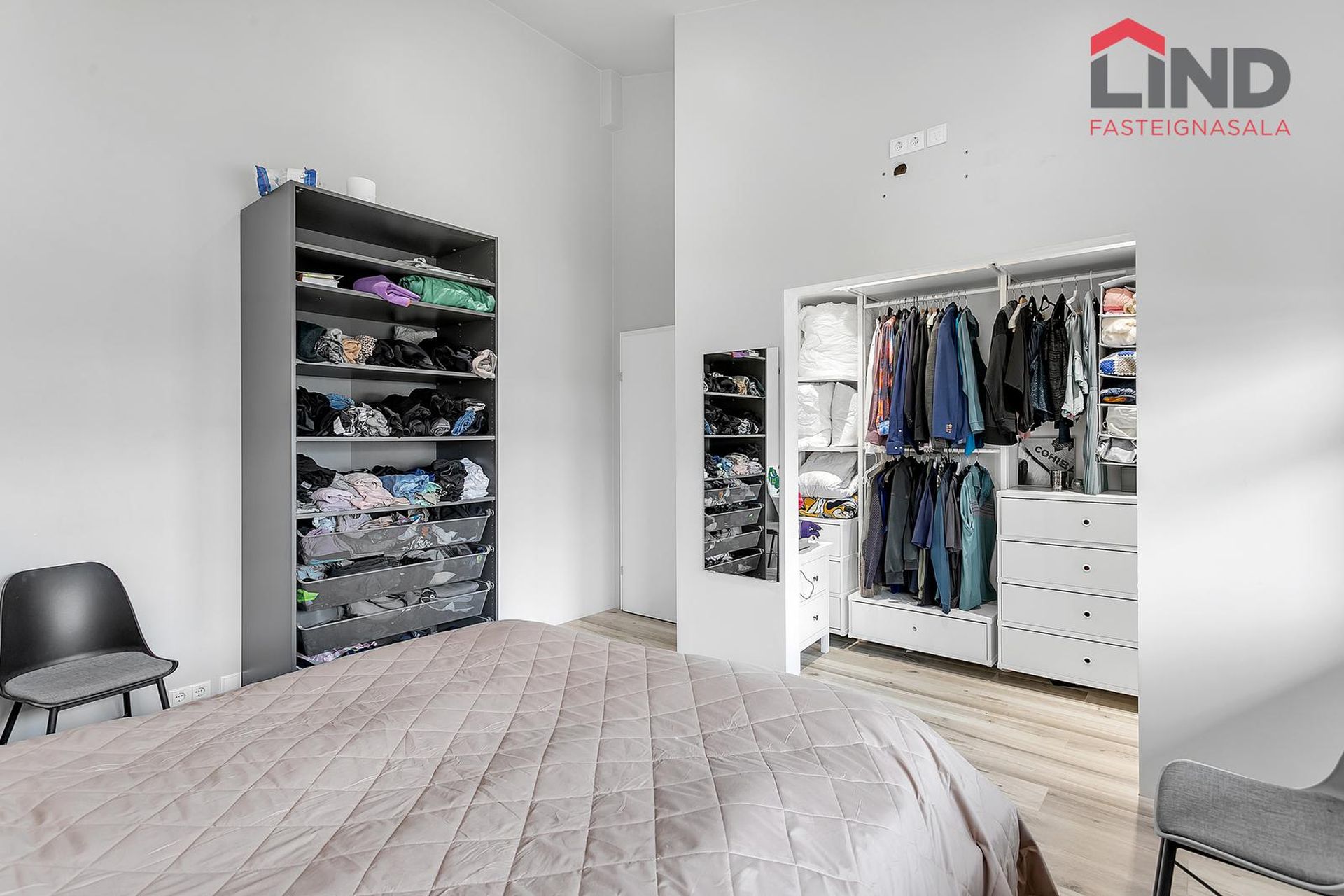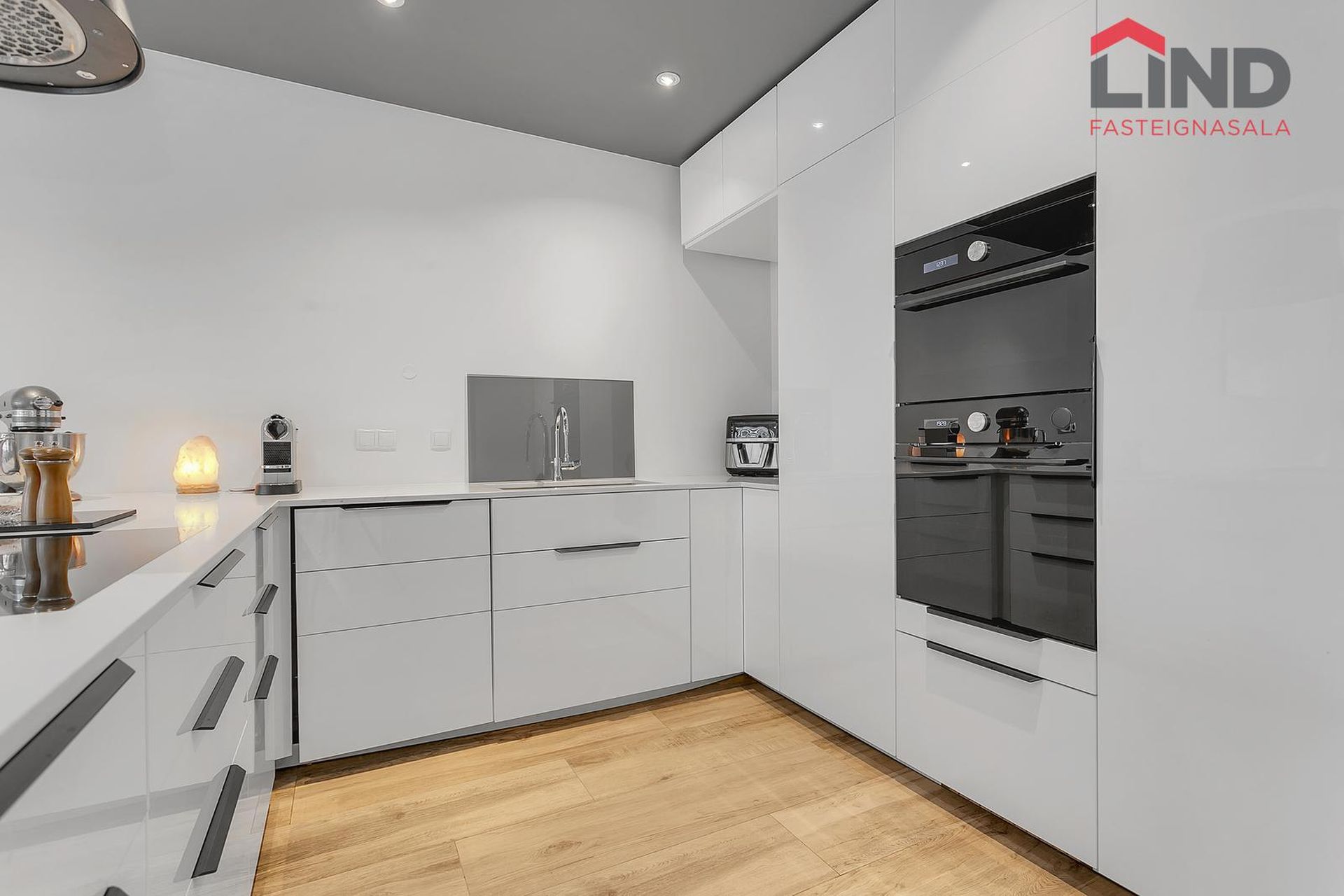 Lind fasteignasala og Elías Haraldsson löggiltur fasteignasali ( sími 777-5454), kynna : einstaklega fallegt 183,1 fermetra raðhús á einni hæð (byggt 2013). Um er að ræða mjög vel skipulagt og skemmtilegt hús með extra lofthæð. Óvenju góður flísalagður bílskúr (38 fermetrar ásamt 18,3 fermetra milliloft samtals 56,3 fermetrar). Fallegar vandaðar samstæðar innréttingar, parket og flísar á gólfum. Góður sólpallur og stórt upphitað hellulagt bílastæði fyrir framan bílskúr.Eignin skiptist : forstofa, þvotthús, baðherbergi, sjónvarpshol, hjónaherbergi, barnaherbergi l, barnaherbergi ll, eldhús, stofa og bílskúr.Nánari lýsing :Forstofa : flísalögð með tvöföldum fataskáp. innangengt í bílskúr.Þvottahús : flísalagt, góð innrétting með þvottavél og þurkara í vinnu hæð.Baðherbergi : flísalagt með fallegri innréttingu við handlaug, stór skápur, vegghengt salerni, baðkar og góð sturta.Hjónaherbergi : parketlagt með fataherbergi.Barnaherbergi l : parketlagt með fataskáp.Barnaherbergi ll : parketlagt með fatahengi.Sjónvarpshol : parket/flísarEldhús : parket/flísar, falleg hvít innrétting með eyju, steinborðplötum og borðkrók. innbyggður ísskápur og uppþvottavél.Stofa : parket/flísar með góðum suður gluggum.Lóð : mjög snyrtileg með góðum sólpalli og stóru hellulögðu bílaplani með sjóbræðslu fyrir framan bílskúr.Hús að utan : mjög snyrtilegt.