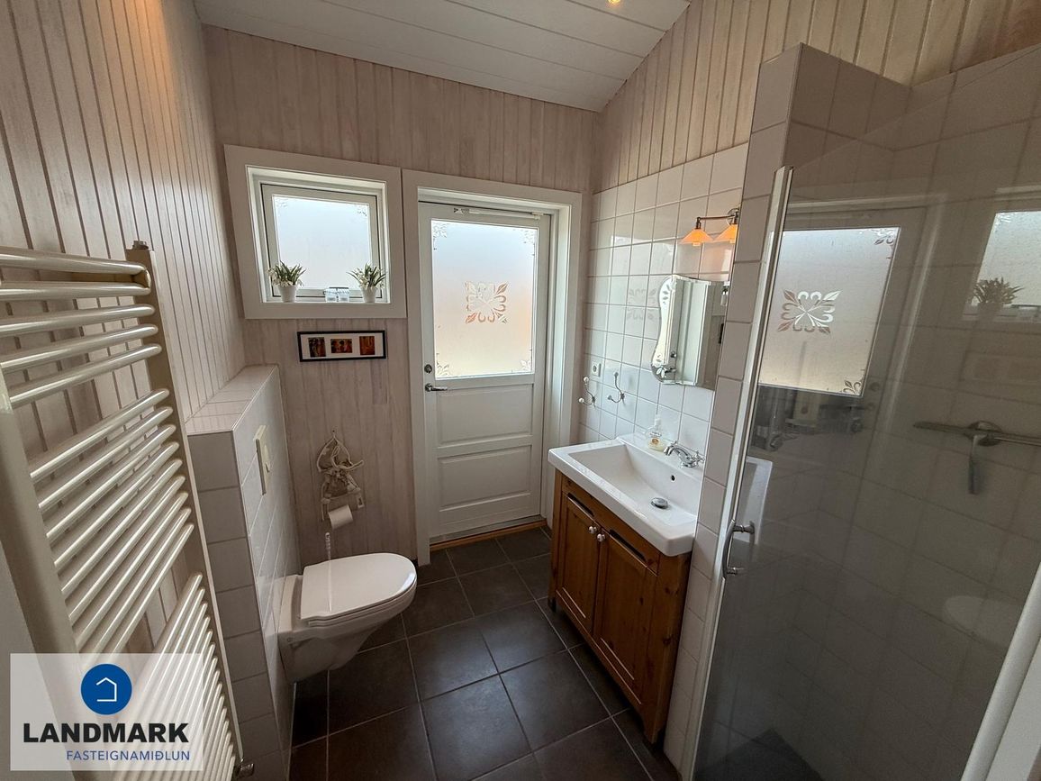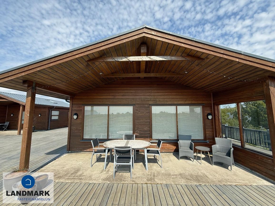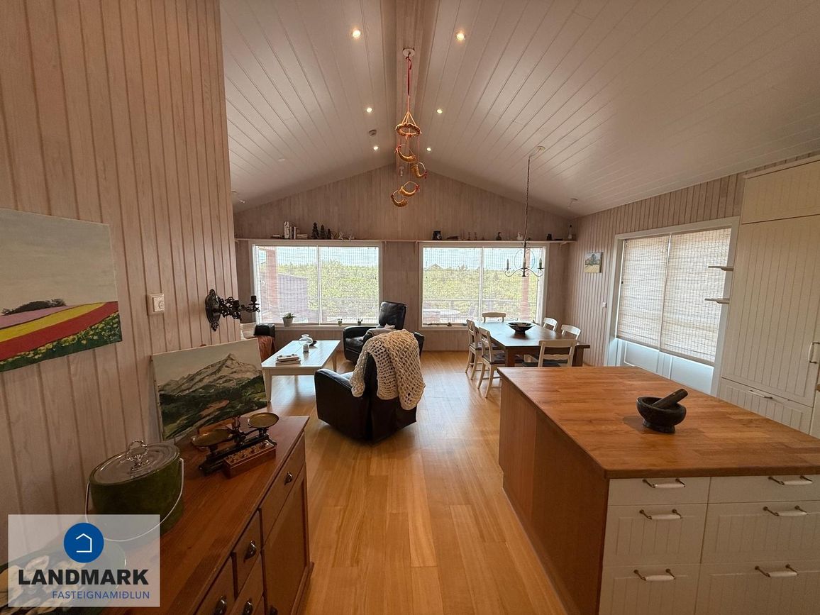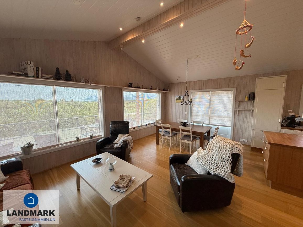 Aðalhúsið skiptist í forstofu, eldhús með eyju, rúmgóða stofu/borðstofu þaðan sem er útgengt út á verönd, 3 svefnherbergi, baðherbergi og geymslu sem er einnig nýtt sem þvottahús. Gestahúsið skiptist í alrými, baðherbergi og geymslu. Húsin eru hituð með gólfhita.
