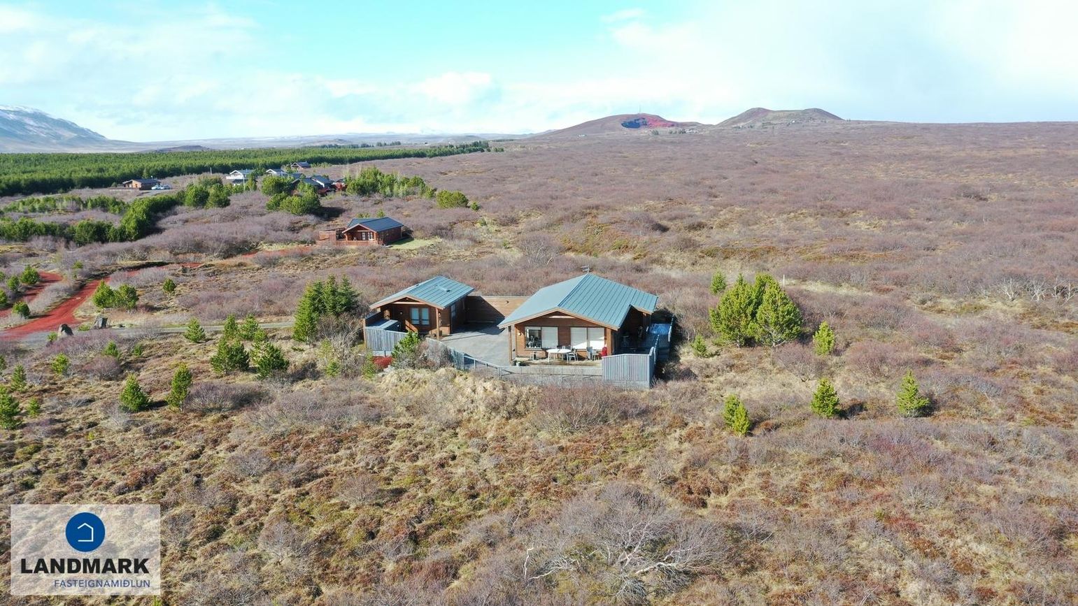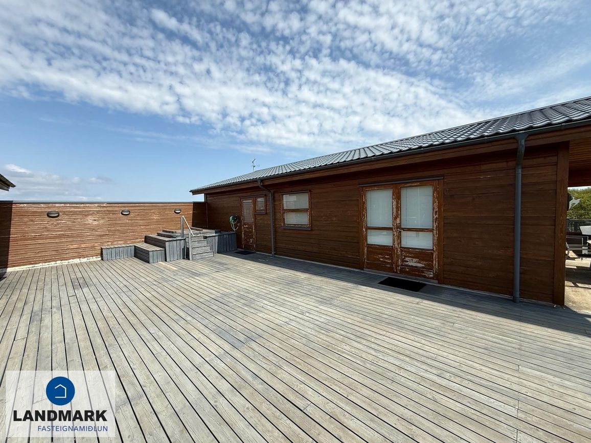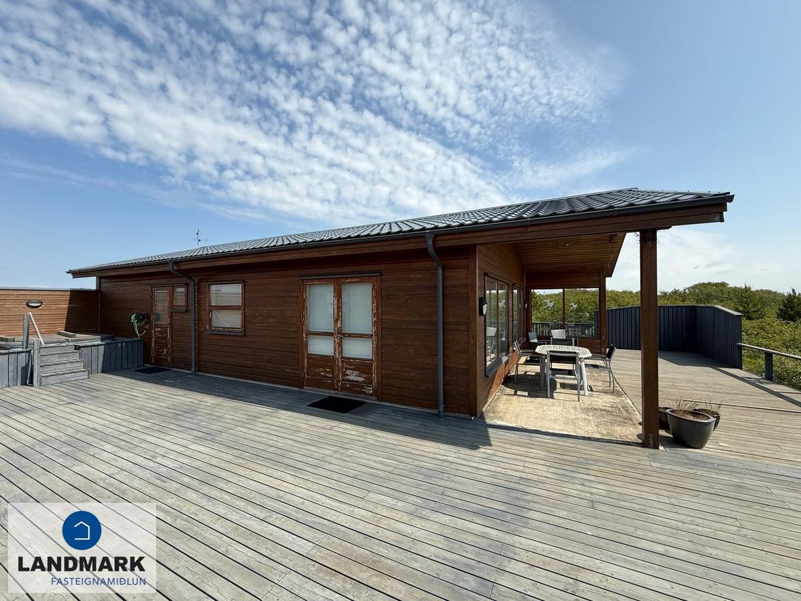 Bæði húsin eru með steypta plötu utan húshlutanna sem gefa möguleika á því að stækka húsin. Stór verönd og á milli húshlutanna er samfelldur skjólveggur og heitur pottur. Góð aðkoma er að húsinu og stórt bílastæði er aftan við húsið.