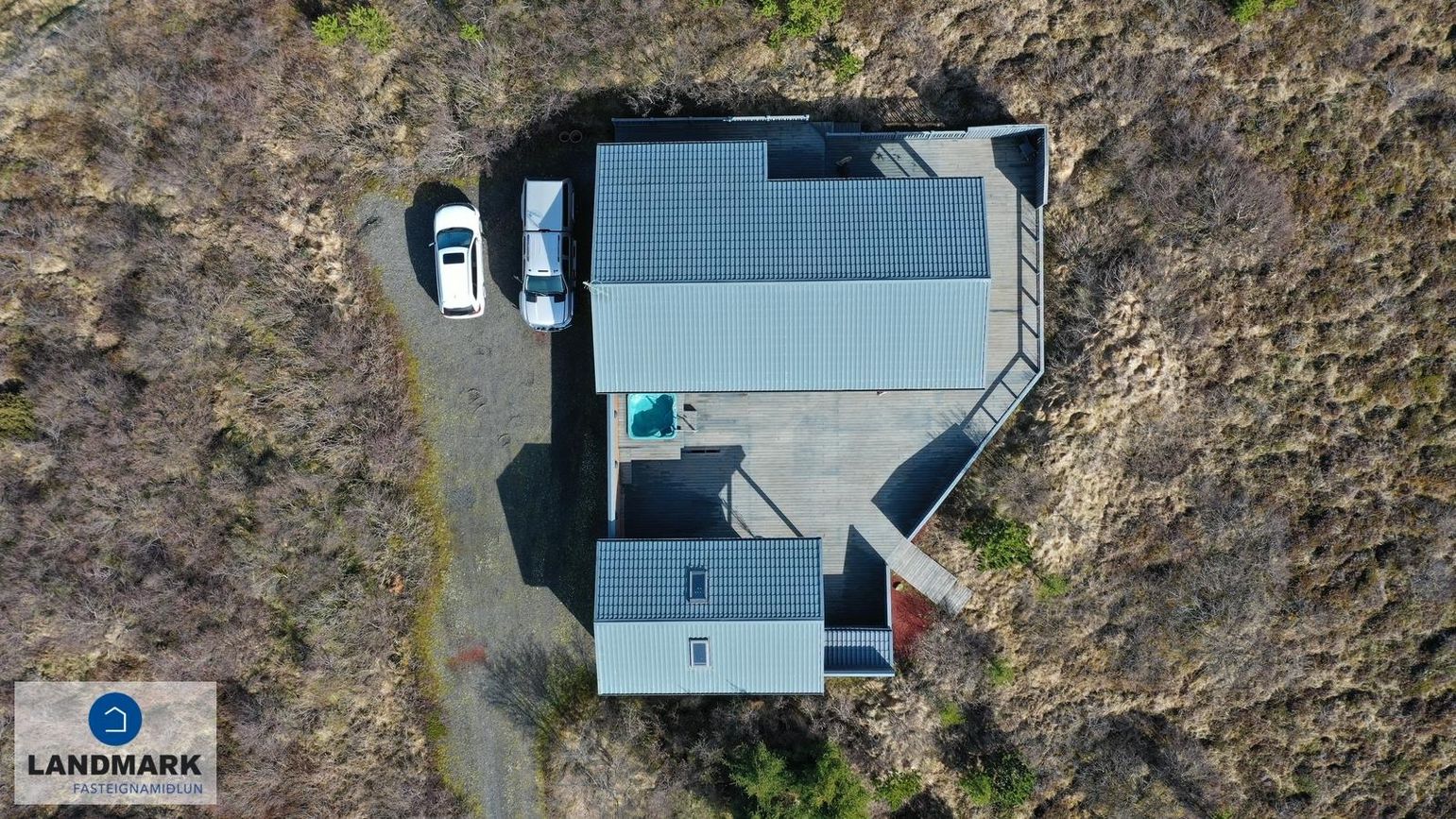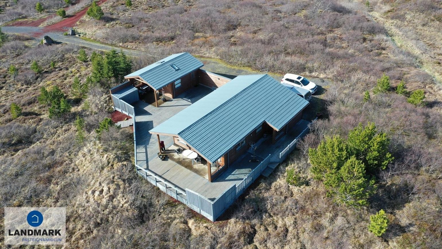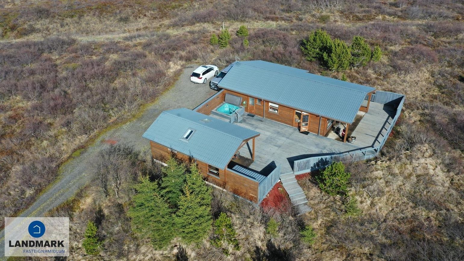 Bæði húsin eru með steypta plötu utan húshlutanna sem gefa möguleika á því að stækka húsin. Stór verönd og á milli húshlutanna er samfelldur skjólveggur og heitur pottur. Góð aðkoma er að húsinu og stórt bílastæði er aftan við húsið.