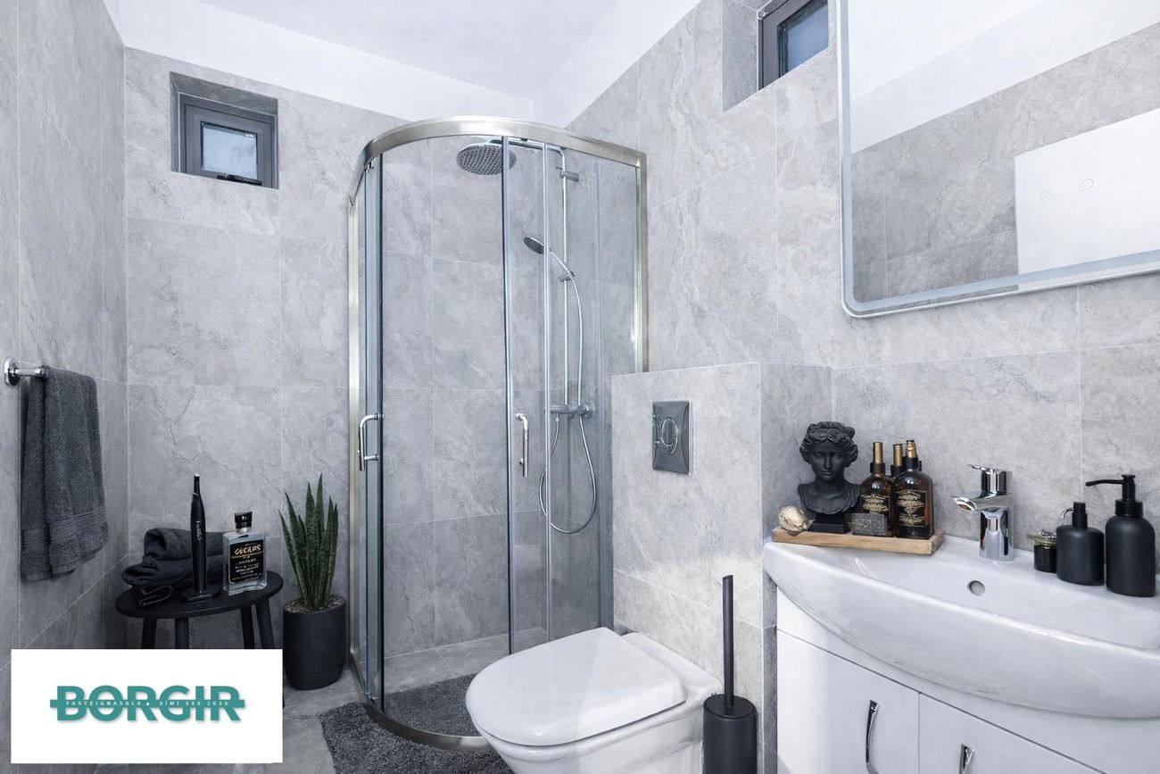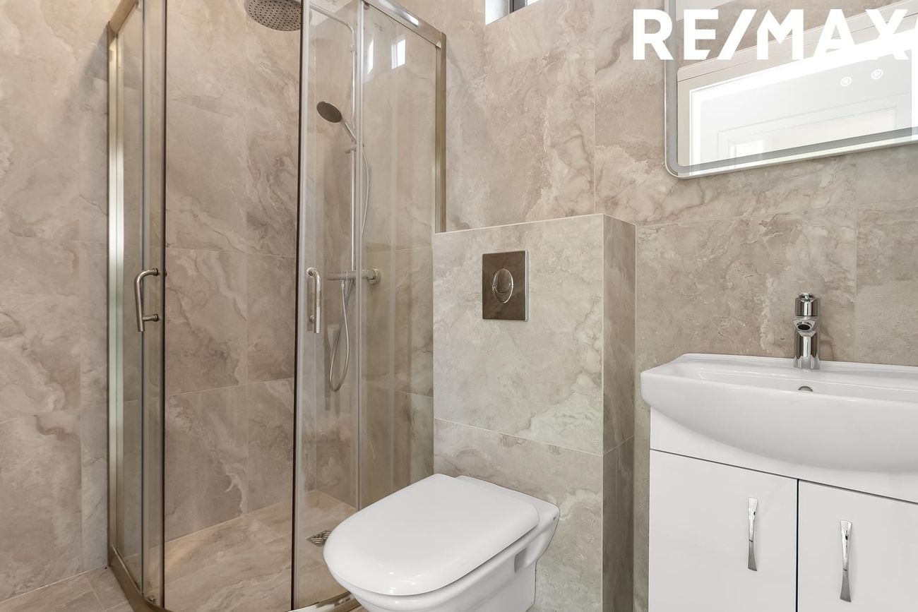 Baðherbergi: Baðinnrétting, Salernið er upphengt. Gólfið er flísalagt og veggir upp í loft, sturtuklefi.