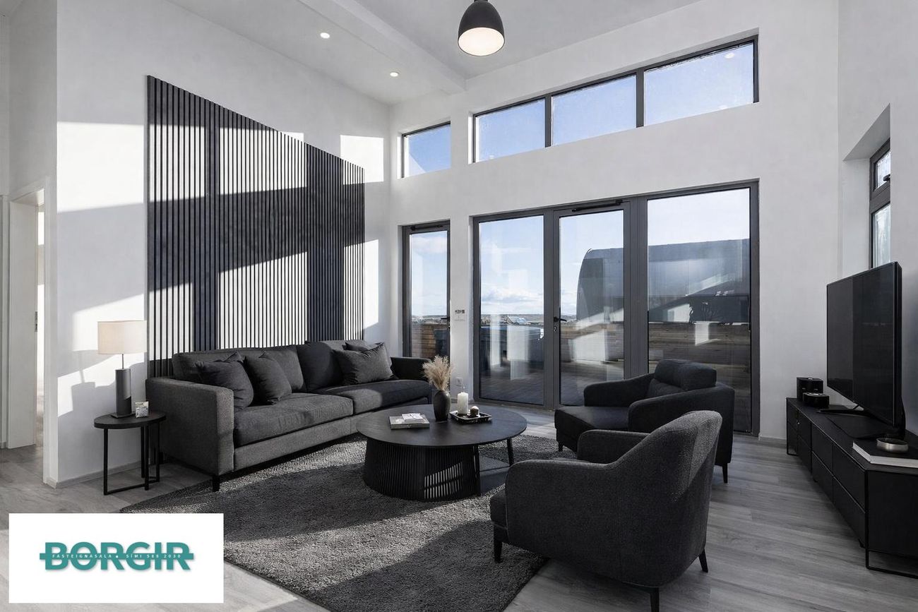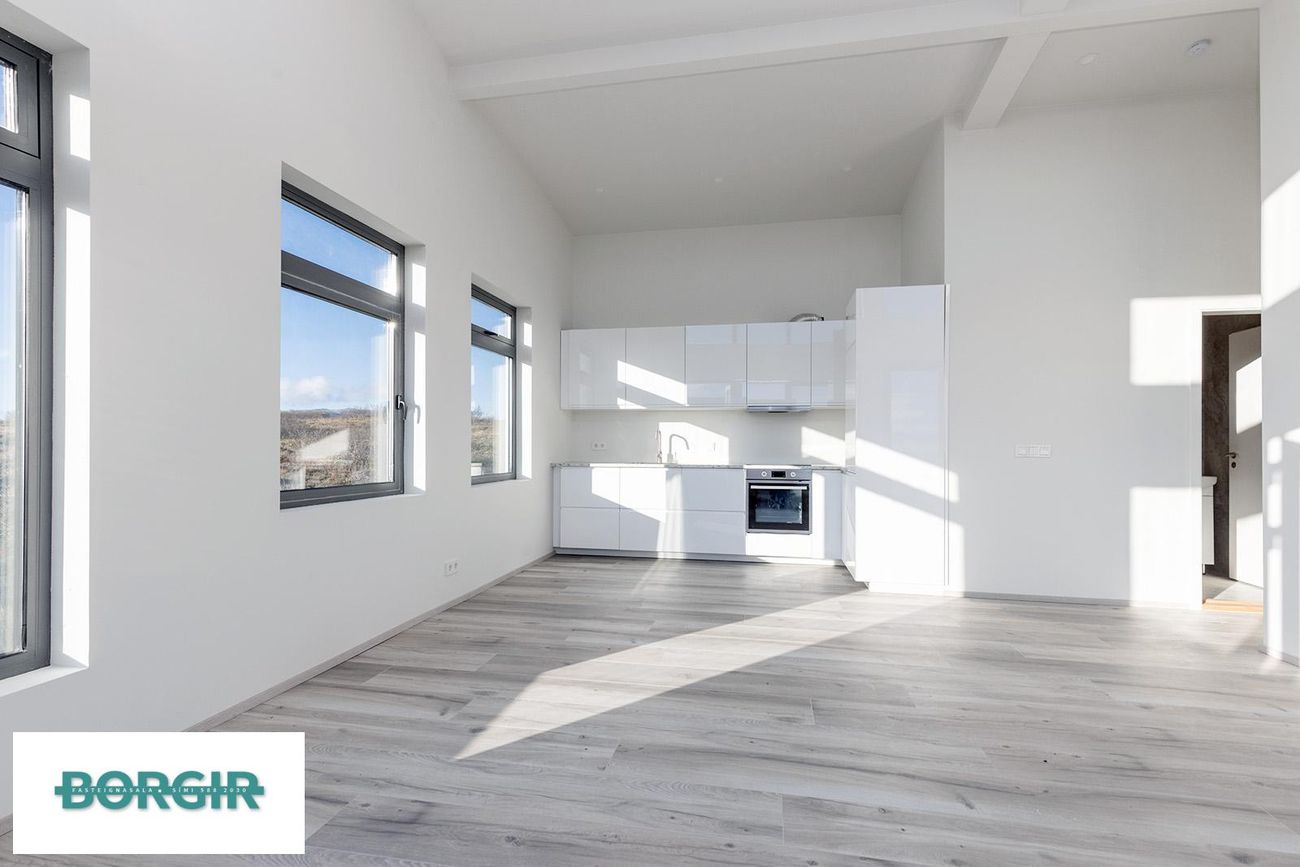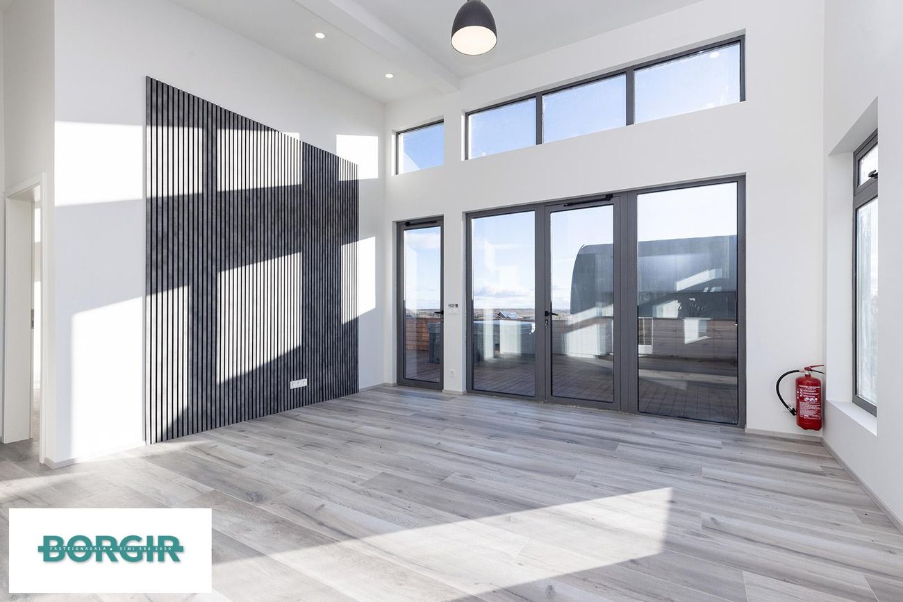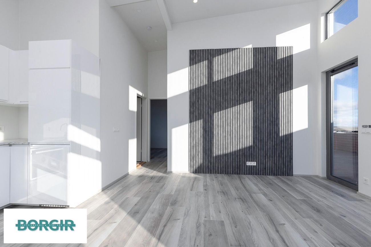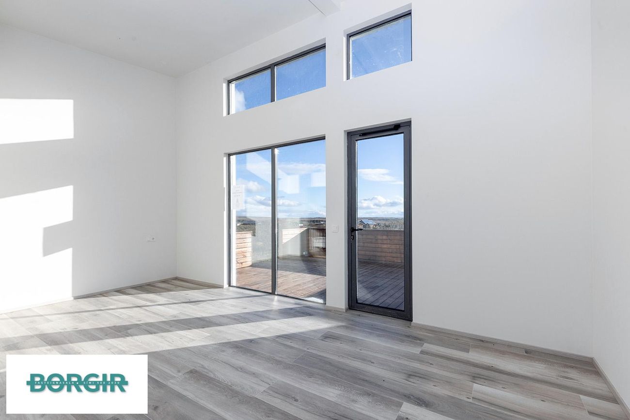 Nánari lýsing: Inngangur: Gengið beint inní stofu/borðstofu með harð parketi á gólfi og gólfsíðum gluggum sem snúa til suðurs, mikilli lofthæð og fallegu útsýni.
