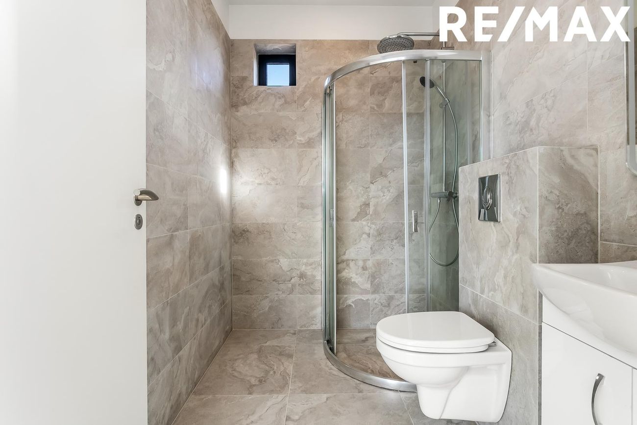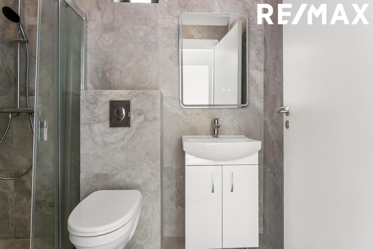 Baðherbergi: Baðinnrétting, Salernið er upphengt. Gólfið er flísalagt og veggir upp í loft, sturtuklefi.