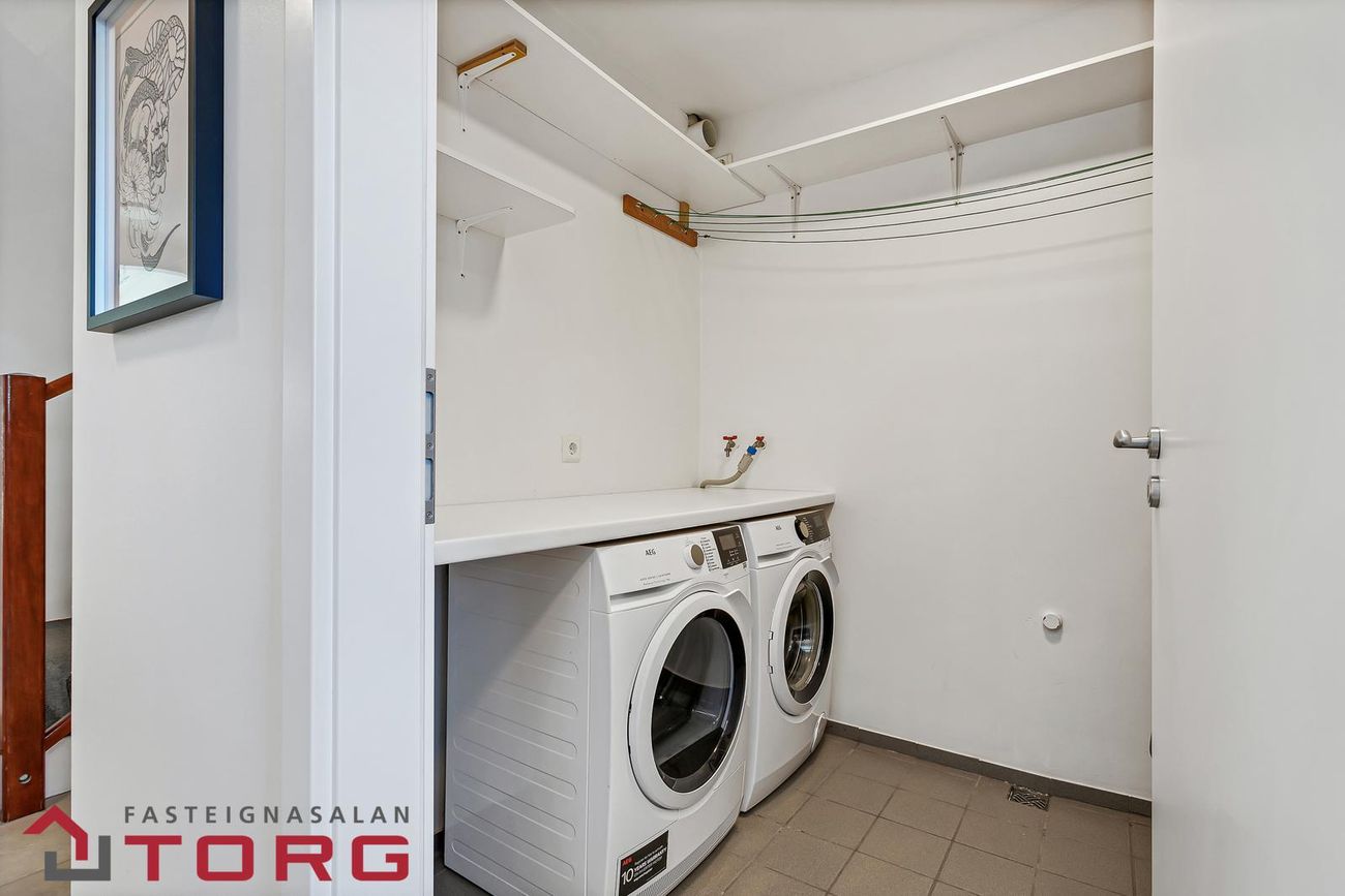 Þvottahús: Snyrtilegt með vaski og borði. Tengi fyrir þvottavél og þurrkara.