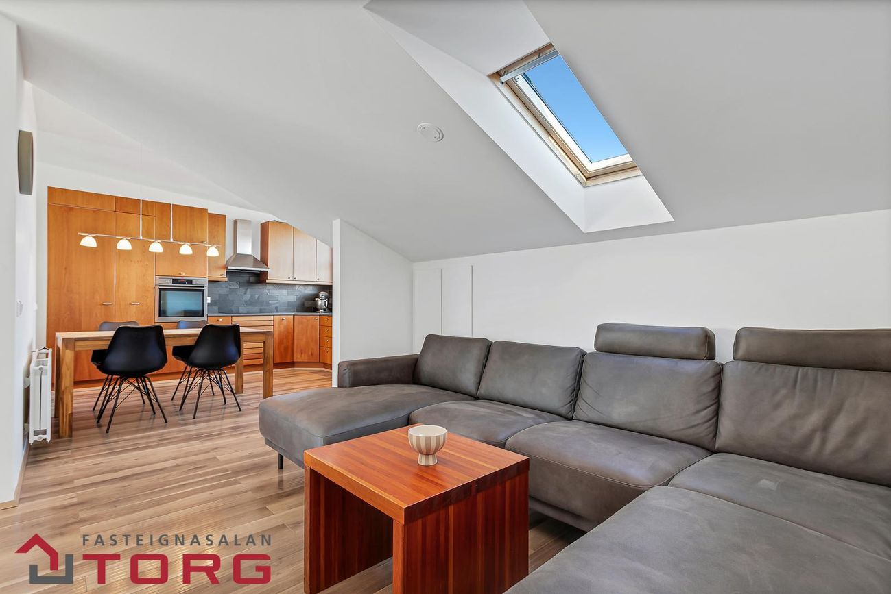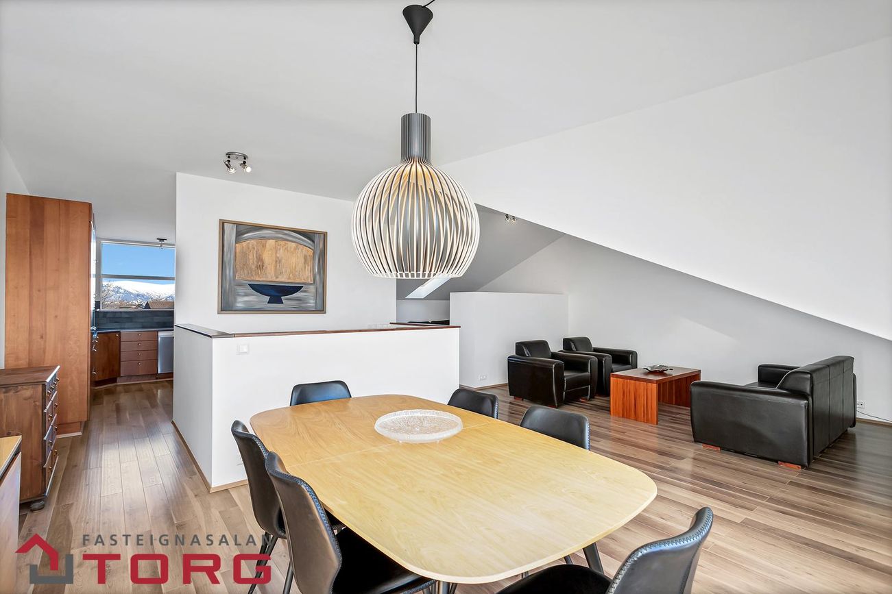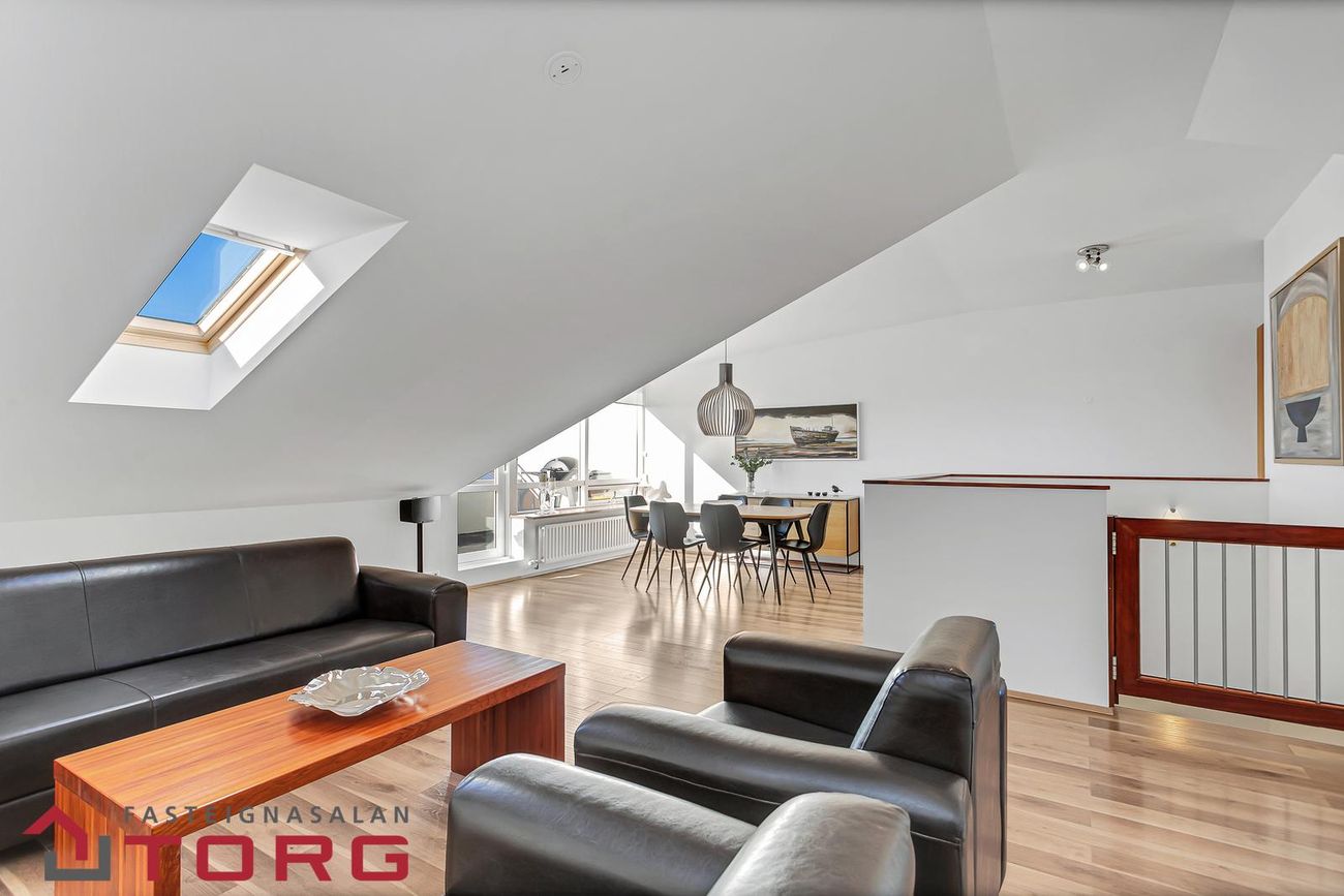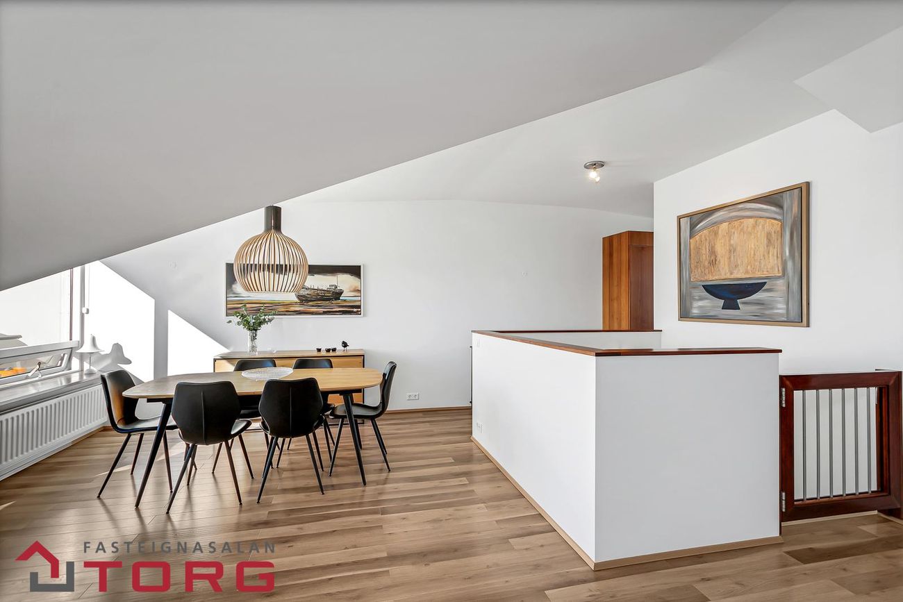 Efri hæðAlrými tengir saman eldhús, sjónvarpshol og rúmgóða, bjarta stofu og borðstofu. Útgengt úr stofu út svalir sem snúa til suðurs með frábæru útsýni.