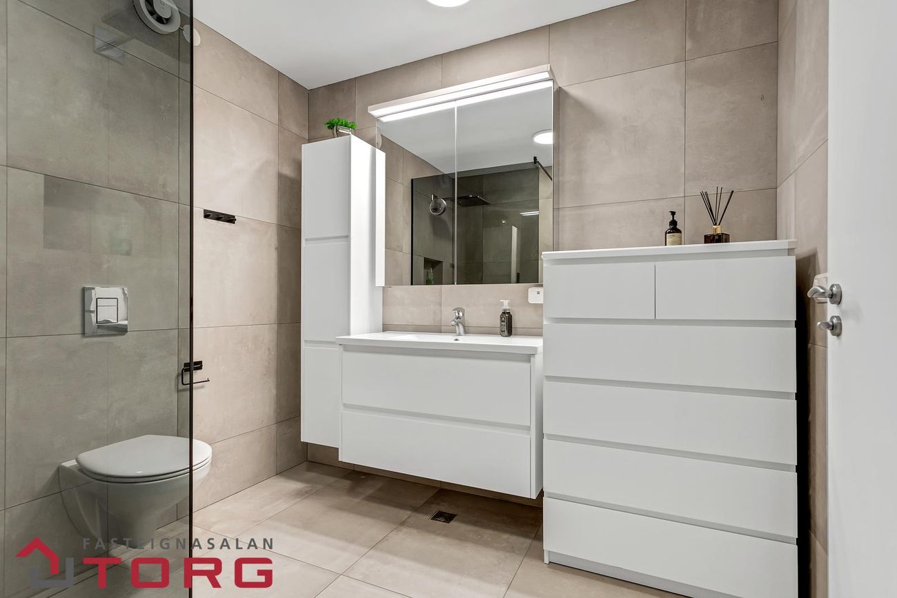 Baðherbergi: Glæsilegt, nýlega endurnýjað, flísalagt í hólf og gólf. Walk-in sturta, vegghengt salerni, innrétting, speglaskápur og handlaug.