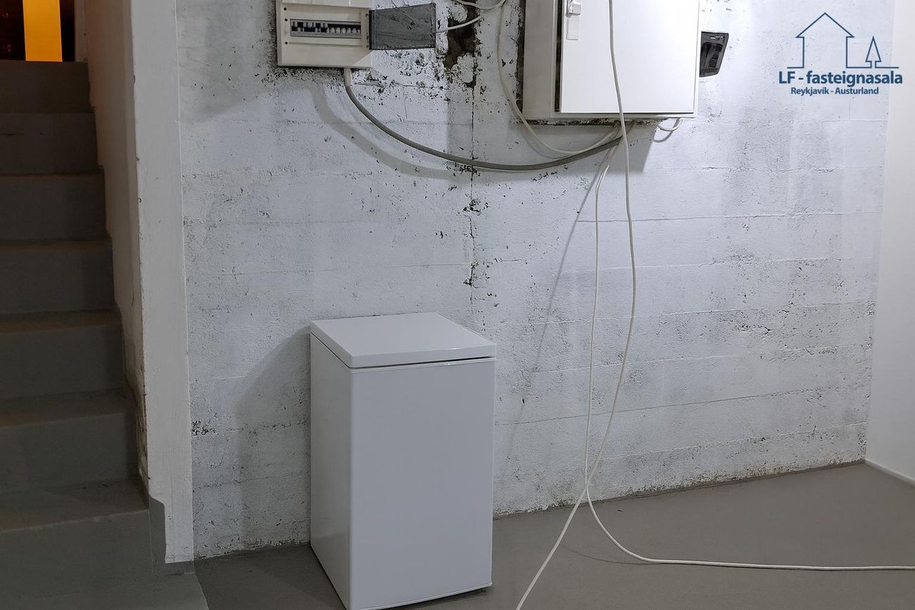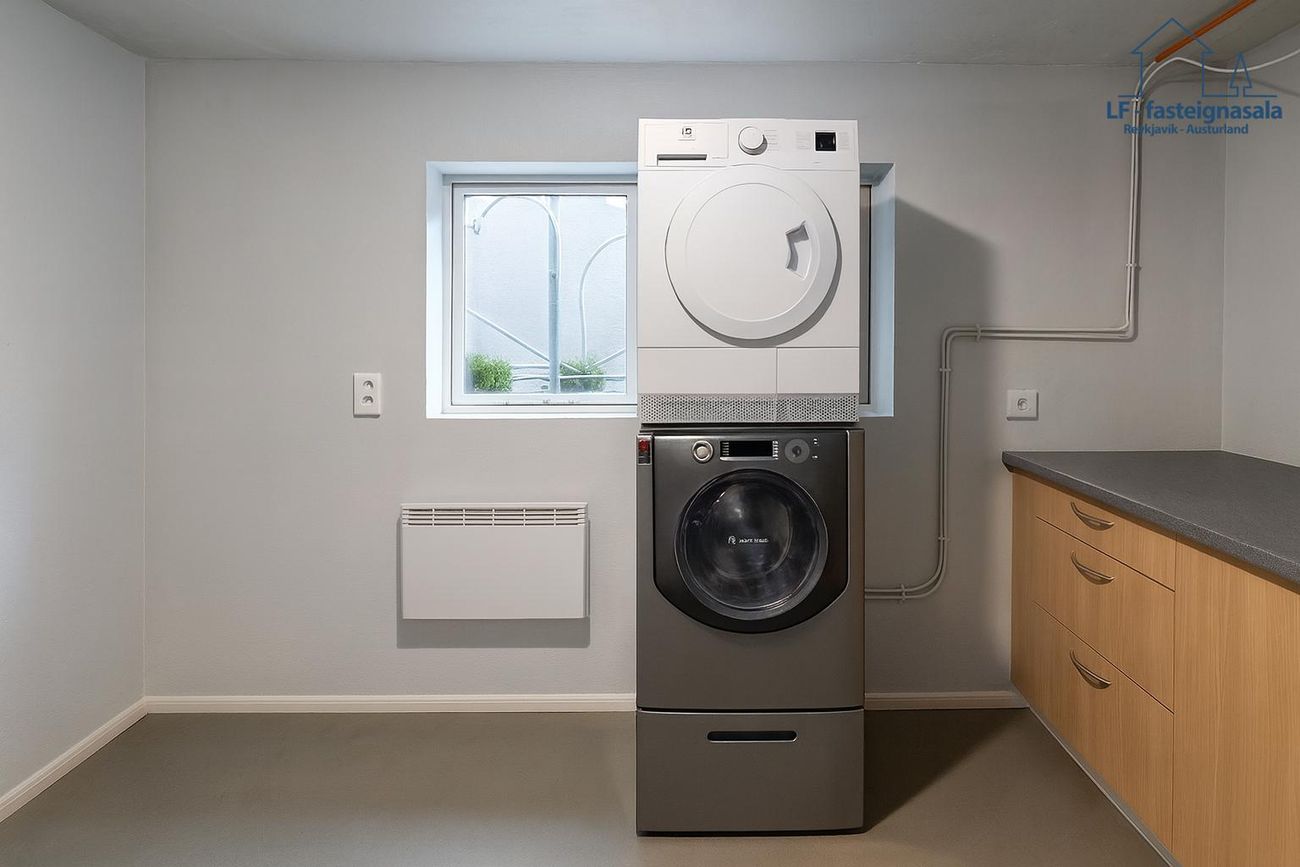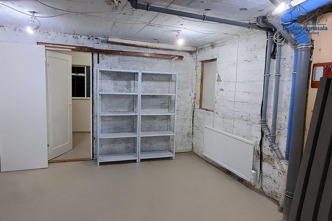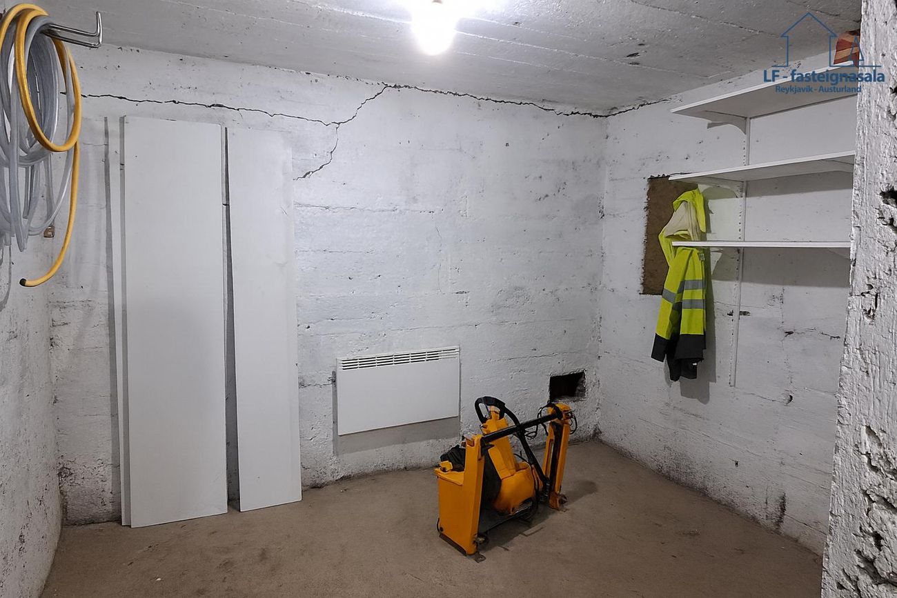 Gengið er niður nokkrar tröppur í kjallarann þar sem geta verið 2 góð herbergi, þvottahús, baðherbergi og geymsla og útgengt í garðinn. Möguleiki að að gera þessi rými að aukaíbúð. Rýmið nýtist í dag sem geymslur og þvottahús.