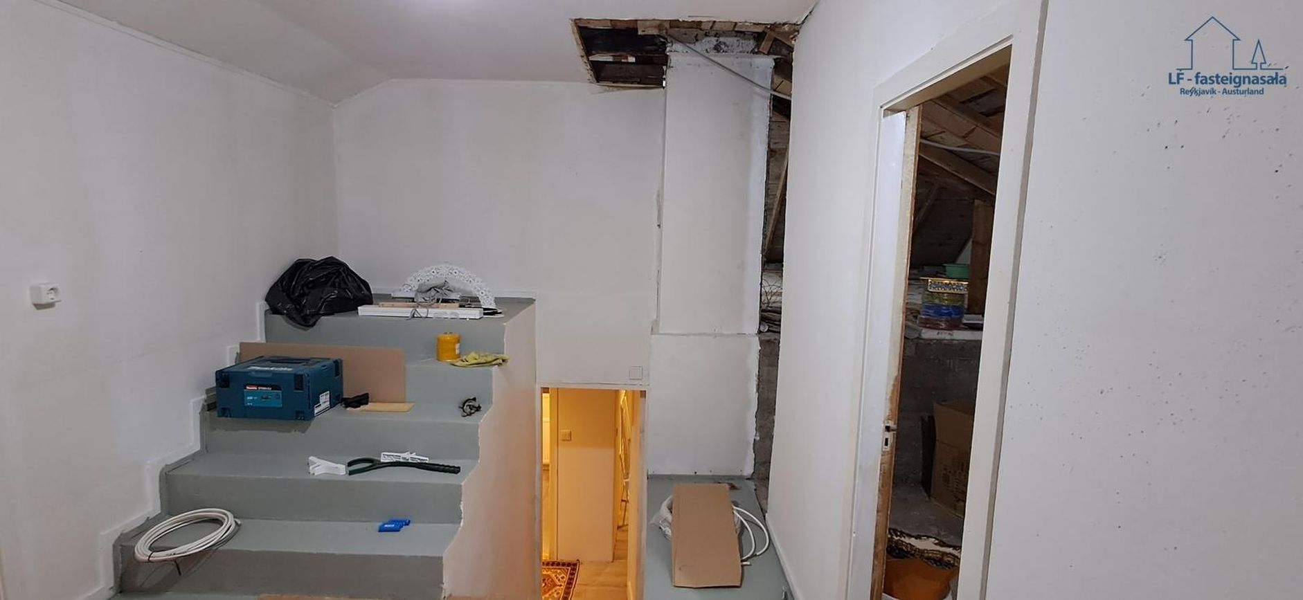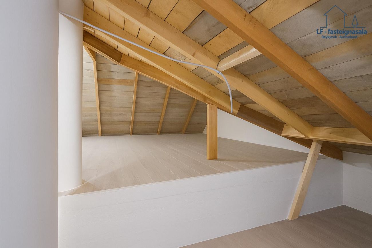 Einnig er af aðalpallinum gengið upp á næstu hæð, þar er baðherbergi með góðri innréttingu og sturtuklefa möguleiki að setja stóran aflangan sturtubotn. 2 rúmgóð herbergi eru á hæðinni og útgengi á svalir. Á næsta palli er eitt rúmgott herbergi og 3 rými undir súðinni sem hafa verið nýtt sem geymslur. Unnið er að breytingu á þessum rýmum.