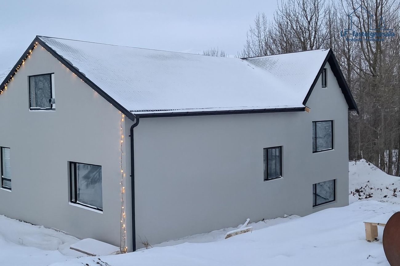 Það er búið að múrviðgera og fullmála húsið að utan og lagfæra þakið og setja nýtt járn, pappa, þakrennur og niðurföll ásamt þakköntum.