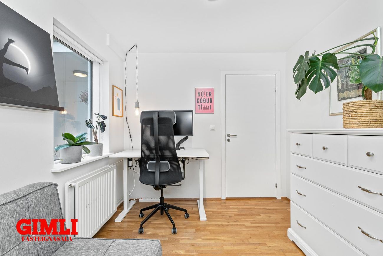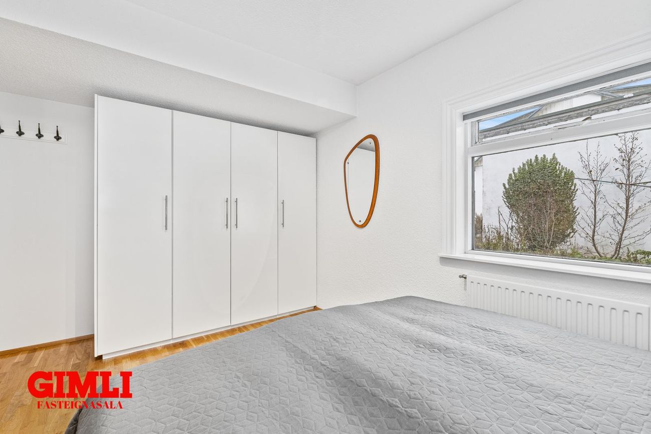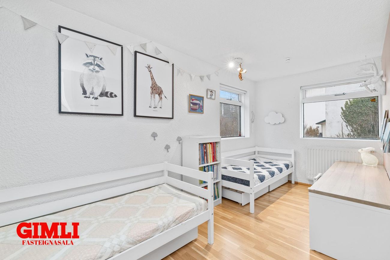 Hjónaherbergi rúmgott með skáp og parket á gólfi. Svefnherbergi I bjart með tveimur gluggum og parket á gólfi. Svefnherbergi II (upphaflega geymsla) gott barnaherbergi með tveimur gluggum og parketi á gólfi.