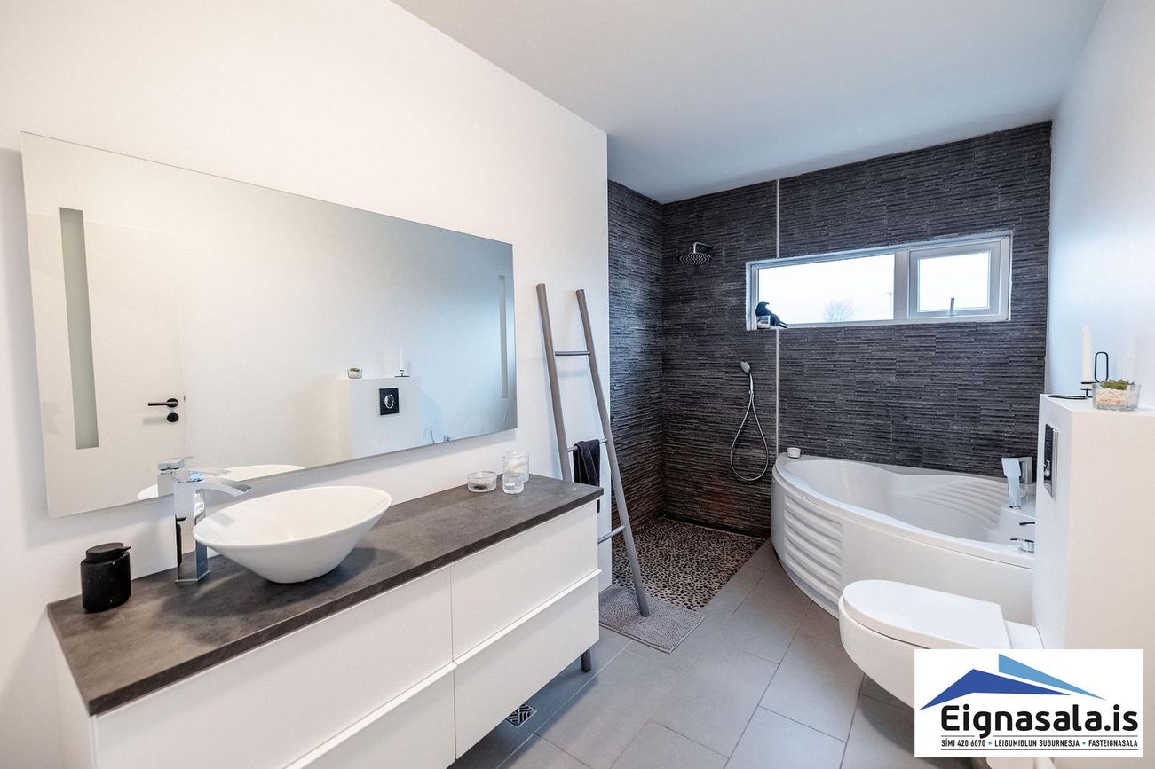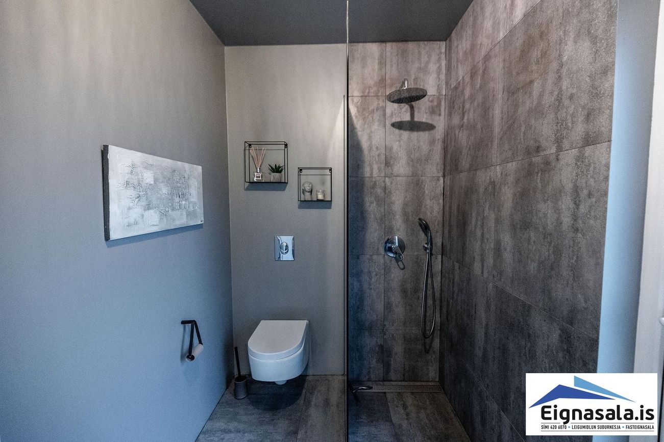 Baðherbergi á efri hæð með flísalagt gólf, upphengt salerni, sturtu og hornbaðkar. Forstofu baðherbergi með upphengt salerni og sturtu.