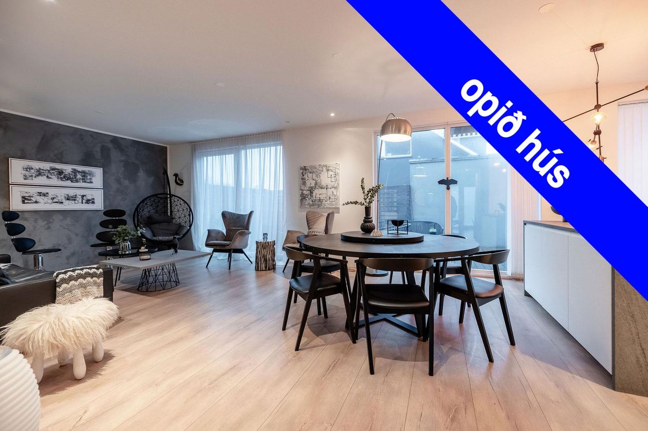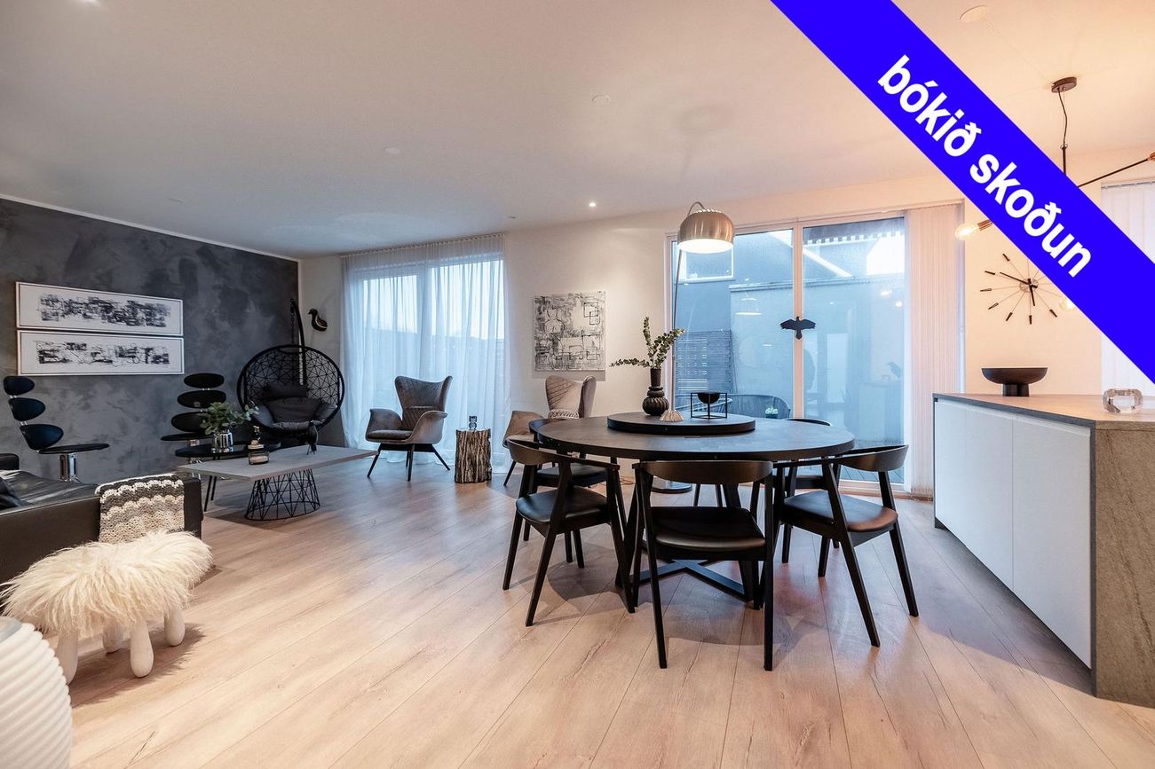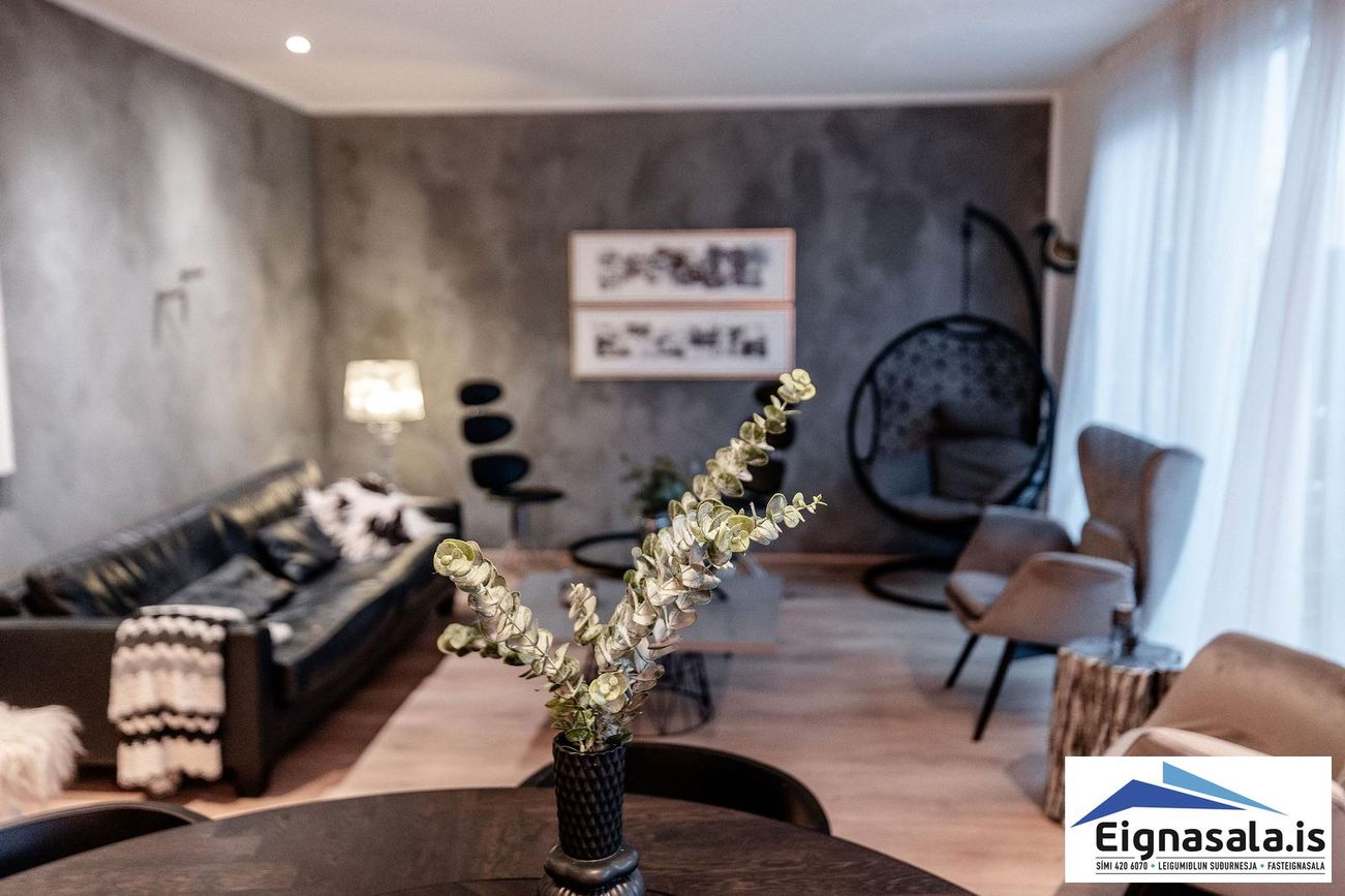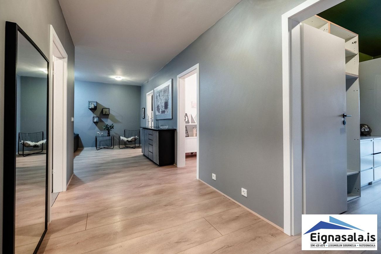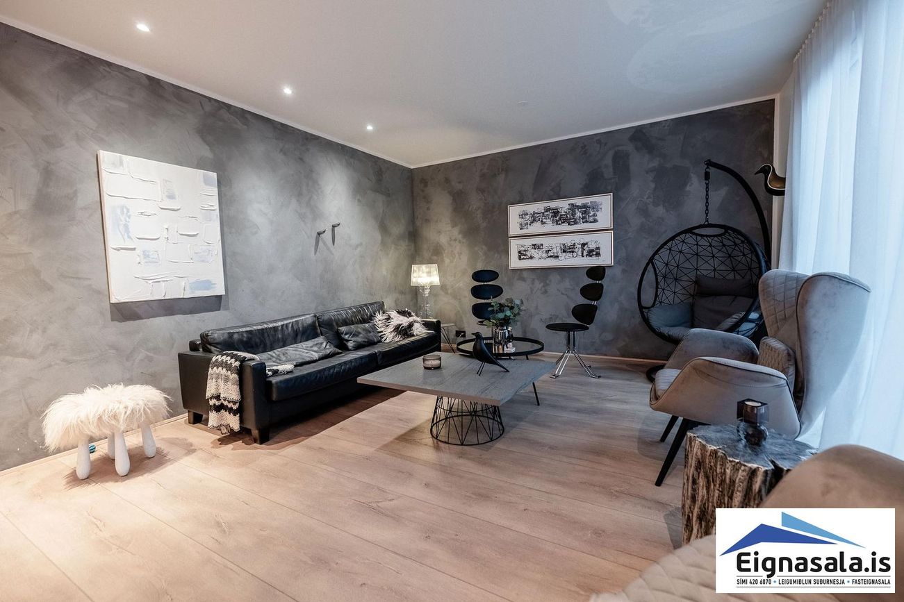Parketgólf í stofu, eldhúsi og svefnherbergjum. Flísaleg gólf í baðherbergjum og bílskúr.