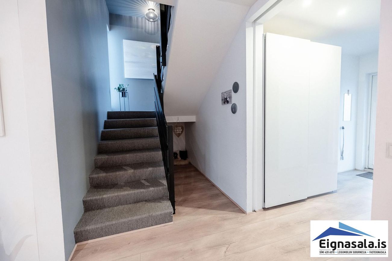 Tveggja hæða parhús með opnu rými í stofu og eldhúsi, fjögur svefnherbergi á efri hæð, stórt sjónvapshol og tveimur baðherbergjum.