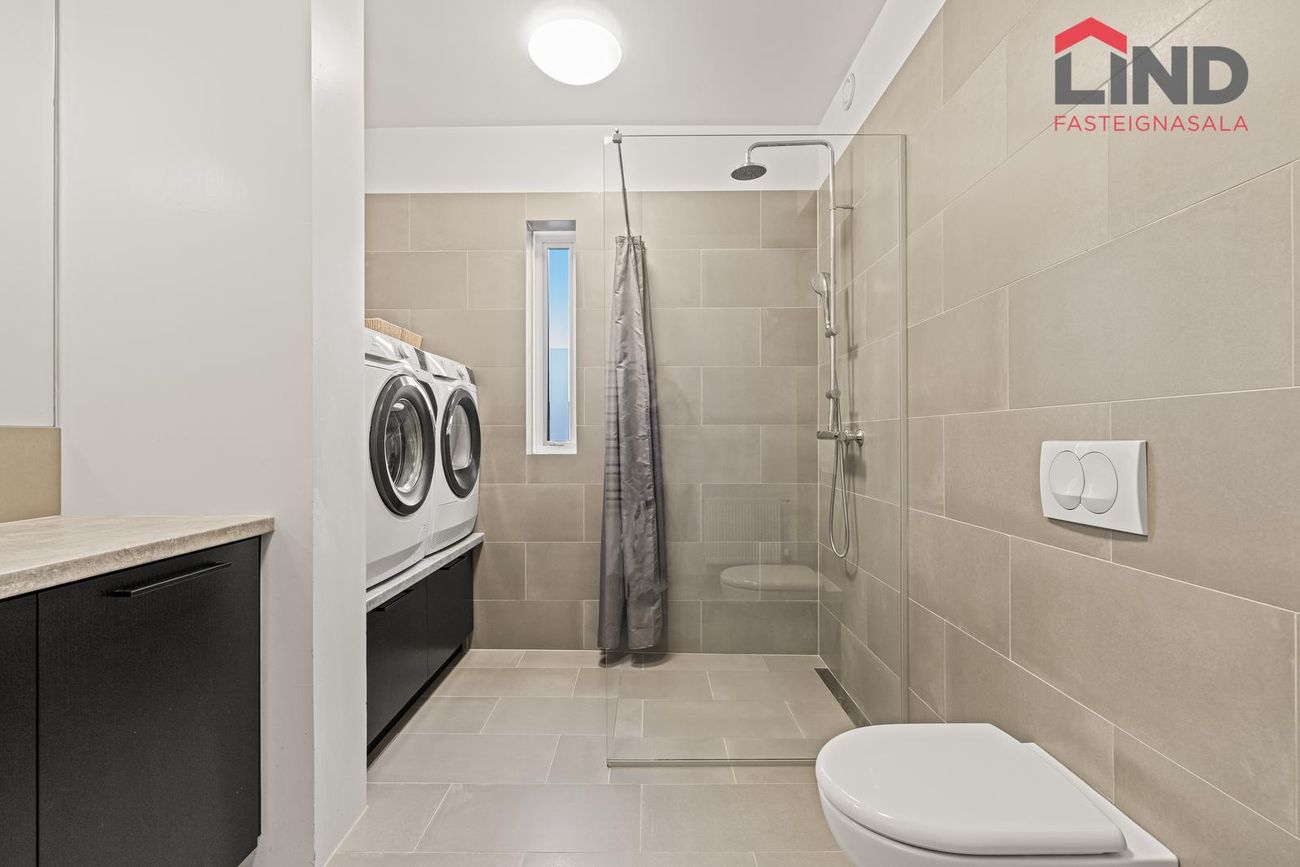 Flísalagt baðherbergi með sturtu og glerþili, upphengt salerni og tengi fyrir þvottavél og þurrkara.
