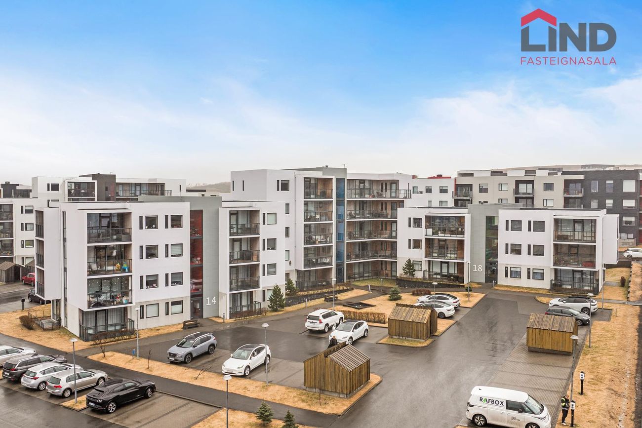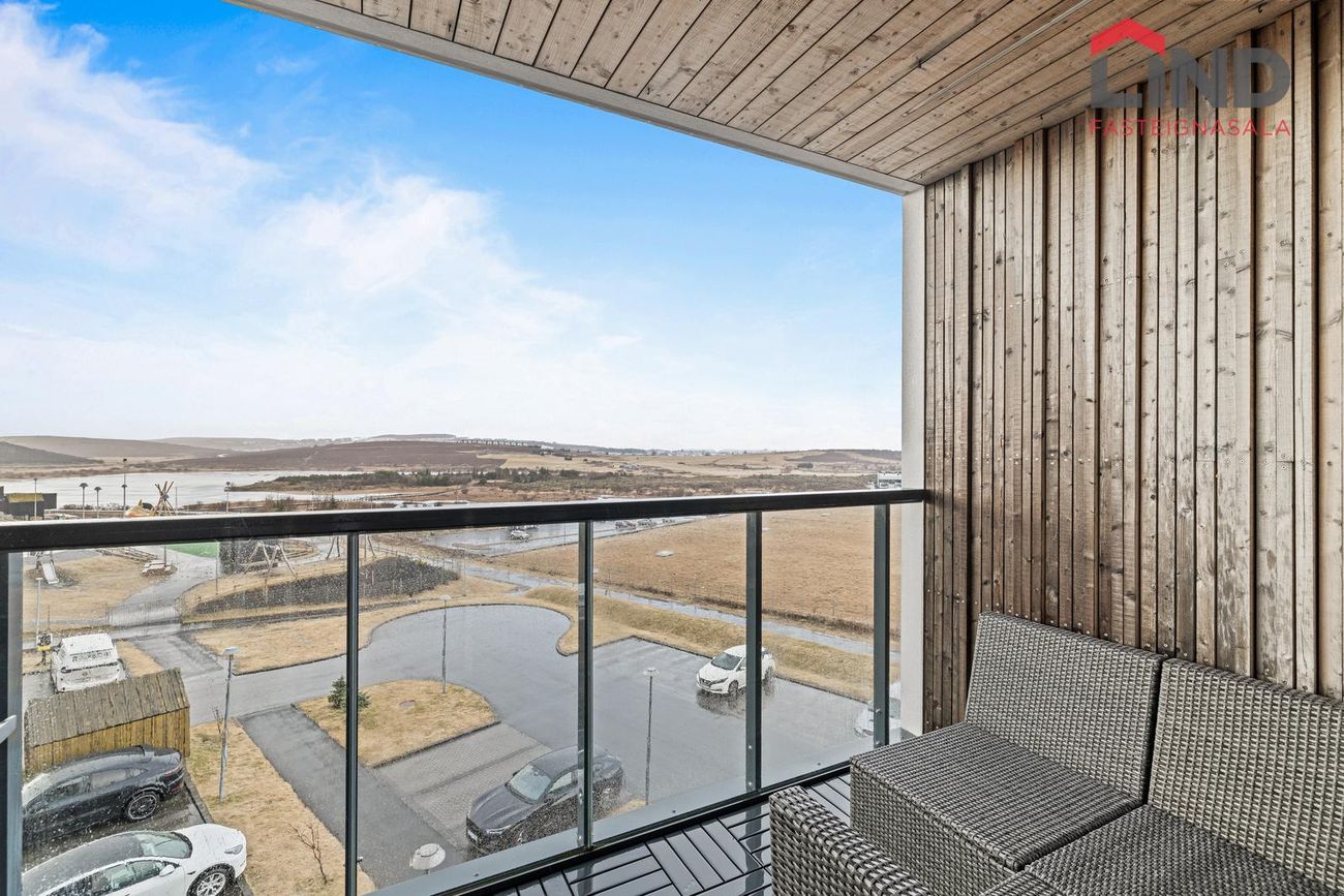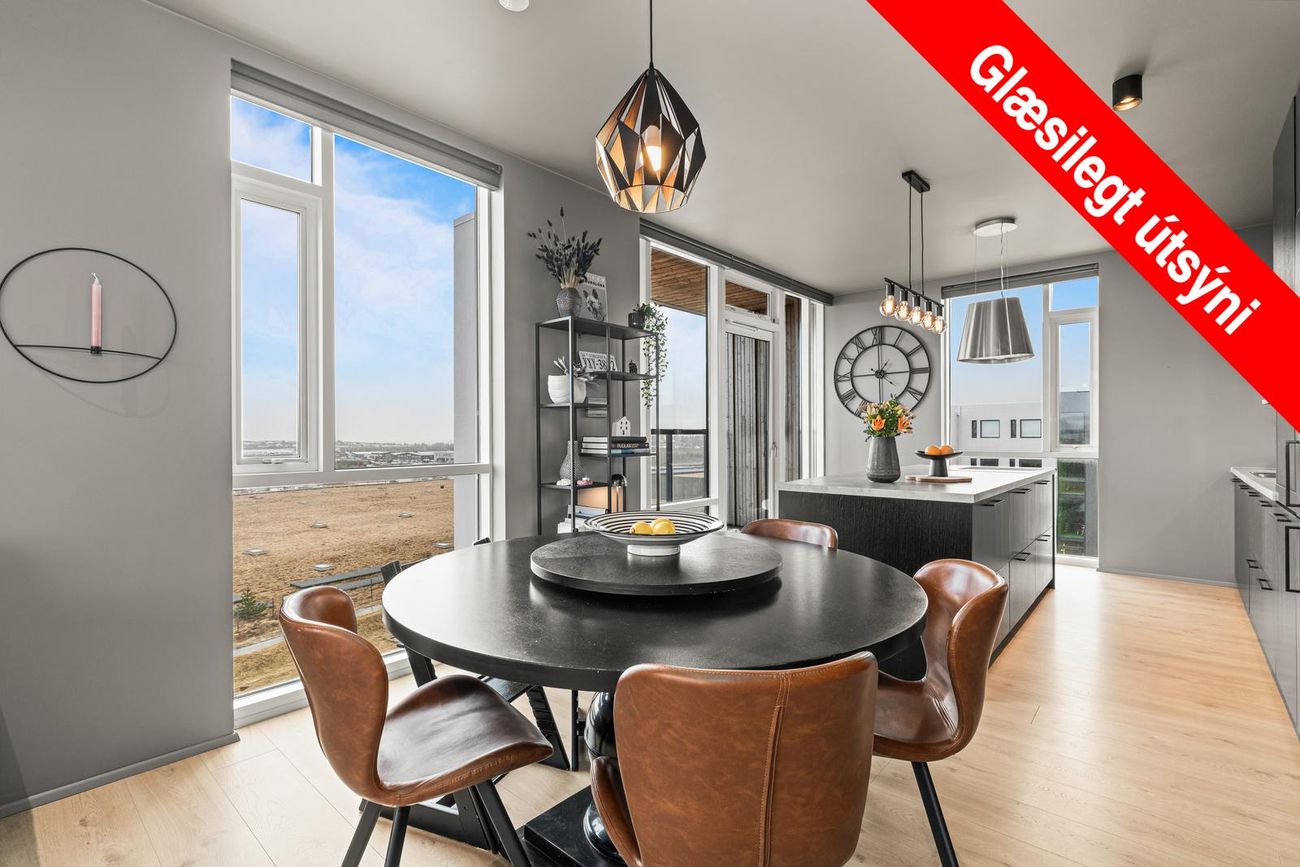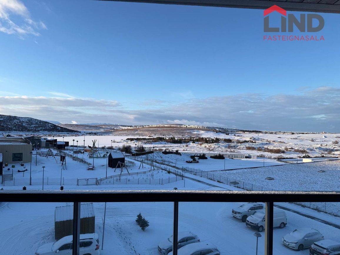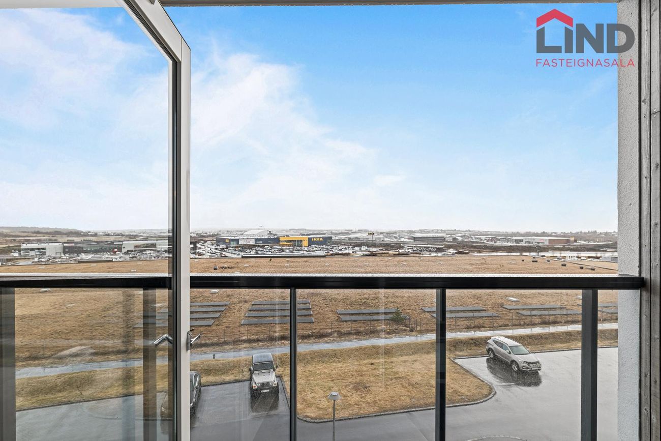 Íbúðin á 4. hæð í húsnæði byggðu 2016. Björt með stórum gólfsíðum gluggum til suðurs, vesturs og norðurs. Opinn rými milli eldhúss og stofu.