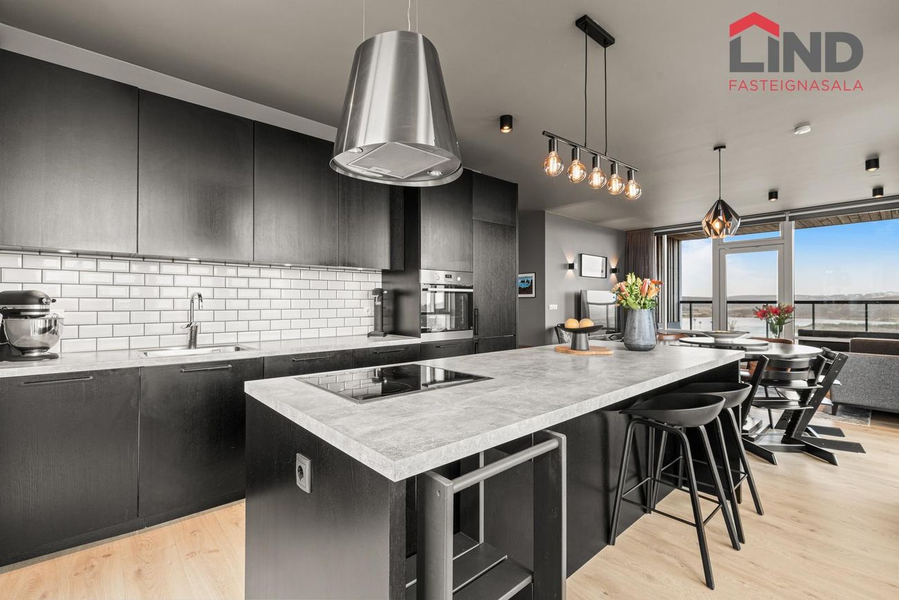 Vandað eldhús með harðparketi, dökkri innréttingu og stórri eldhúseyju. Með Electrolux bakaraofni, helluborði, innbyggðri Siemens uppþvottavél og kæliskápi með frysti. Gluggar til vesturs og norðurs með útsýni.