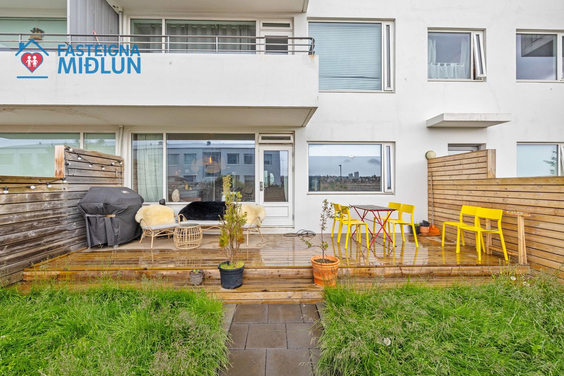 Fasteignamiðlun og Hreiðar Levý kynna fallega, vel skipulagða og mikið uppgerða 52,8fm, 2ja herbergja íbúð á jarðhæð að Hörðalandi 4, 108 Reykjavík, nánar tiltekið eign merkt 01-02, fastanúmer 203-7375 ásamt öllu því sem eigninni fylgir, þar með talið tilheyrandi lóðar og sameignarréttindi. Eigning skiptist í forstofu, alrými með samliggjandi eldhúsi og stofu ásamt svefnherbergi. Útgengt út á stóran sérafnotareit til suðurs úr stofu. Sérafnotareitur er aflokaður, að hluta til með viðarpalli og að hluta til tyrfður. Falleg, mikið uppgerð eign í Fossvoginum.Bókið skoðun hjá Hreiðari Levý lögg. fasteignasala í síma 661-6021 eða Eignin Hörðaland 4 er skráð sem hér segir hjá FMR: Eign 203-7375, birt stærð 52.8 fm.Nýlegar Framkvæmdir:* Skipt um frárennslislagnir. Öll tæki og gólf flísar á baði endurnýjaðar (2024)* Ný gólfefni á allri íbúð. * Eldhús flutt í alrými, ný innrétting, nýjar lagnir í eldhús og sér rafmagnstafla fyrir tæki í eldhúsi. * Girðing fyrir sérafnotareit, garður og pallur. * Veggfóður á svefnherbergi og frönsk tvöföld hurð. * Hljóðdemprandi korkur á stofuvegg. * Í húsinu er verið að klára að setja nýtt dren og nýjar frárennslislagnir fyrir allt húsið. (búið að greiða fyrir þá framkvæmd)Nánari lýsing: Forstofa: Forstofa með innbyggðum opnum fataskáp.Alrými: Samliggjandi eldhús og stofa. Eldhús: Innrétting með neðri skápum og efri string hillum ásamt færanlegri eyju. Innbyggð tæki í inréttingu.Sjónvarpsstofa: Innaf alrými. Er upprunalega teiknað sem eldhús.Stofa: Samliggjandi eldhúsi, opin og björt. Útgengt út á rúmgóðan aflokaðan sérafnotareit.Svefnherbergi: Svefnherbergi með opnum fataskáp með hillum og fatahengi.Baðherbergi: Flísar á gólfi og veggjum. Upphengt klósett, sturta, vaskur og spegill fyrir ekki ofan vask.Þvottahús: Þvottahús er i sameign.Falleg, björt og mikið uppgerð eign á þessum vinsæla stað í Fossvogsdalnum. Stutt er í alla helstu þjónustu eins og leikskóla og grunnskóla ásamt íþróttasvæði Víkings. Um skoðunar- og aðgæsluskyldu:Í lögum um fasteignakaup nr. 40/2002 er kveðið á um ríka skoðunarskyldu kaupenda á fasteignum. DOMUSNOVA fasteignasala bendir væntanlegum kaupendum á að kynna sér vel ástand fasteigna við skoðun og fyrir tilboðsgerð og ef þurfa þykir að leita til sérfræðinga um nánari ástandsskoðun.Forsendur söluyfirlits:Söluyfirlit er samið af fasteignasala í samræmi við ákvæði laga nr. 70/2015. Þær upplýsingar sem fram koma í söluyfirliti þessu eru sóttar í opinberar skrár, til seljanda sjálfs og eftir atvikum til húsfélags. Seljandi veitir upplýsingar um eign í samræmi við upplýsingaskyldu laga um fasteignakaup nr. 40/2002, og ábyrgist að þær séu réttar. Fasteignasali sannreynir að þær upplýsingar séu réttar með sjónskoðun á eigninni. Fasteignasali getur ekki fullyrt um ástand og eiginleika þeirra hluta fasteigna sem ekki eru aðgengilegir og sjást ekki berum augum, t.d. lagnir, dren, skólp og þak. Það sama á við um staðhæfingar seljanda eignar um viðhald og einstaka framkvæmdir.Nánari upplýsingar veitir Hreiðar Levý Guðmundsson Löggiltur fasteignasali, í síma 6616021, tölvupóstur .Um skoðunar- og aðgæsluskyldu: Í lögum um fasteignakaup nr. 40/2002 er kveðið á um ríka skoðunarskyldu kaupenda á fasteignum. Fasteignamiðlun fasteignasala bendir væntanlegum kaupendum á að kynna sér vel ástand fasteigna við skoðun og fyrir tilboðsgerð og ef þurfa þykir að leita til sérfræðinga um nánari ástandsskoðun.Forsendur söluyfirlits: Söluyfirlit er samið af fasteignasala í samræmi við ákvæði laga nr. 70/2015. Þær upplýsingar sem fram koma í söluyfirliti þessu eru sóttar í opinberar skrár, til seljanda sjálfs og eftir atvikum til húsfélags. Seljandi veitir upplýsingar um eign í samræmi við upplýsingaskyldu laga um fasteignakaup nr. 40/2002, og ábyrgist að þær séu réttar. Fasteignasali sannreynir að þær upplýsingar séu réttar með sjónskoðun á eigninni. Fasteignasali getur ekki fullyrt um ástand og eiginleika þeirra hluta fasteigna sem ekki eru aðgengilegir og sjást ekki berum augum, t.d. lagnir, dren, skólp og þak. Það sama á við um staðhæfingar seljanda eignar um viðhald og einstaka framkvæmdir.Gjöld sem kaupandi þarf að standa straum af vegna kaupanna: Stimpilgjald af kaupsamningi sem er hlutfall af fasteignamati. Stimpilgjald er 0,8% fyrir einstaklinga (0,4% við fyrstu kaup) og 1,6% fyrir lögaðila.Þinglýsingargjald af kaupsamningi, veðskuldabréfum, veðleyfum o.fl. Þinglýsingargjald er kr. 2.700,- fyrir hvert skjal.Lántökugjald lánastofnunar. Um lántökugjald vísast í gjaldskrá viðkomandi lánveitanda.Umsýsluþóknun fasteignasölu skv. gjaldskrá. Ef um nýbyggingu er að ræða greiðir kaupandi skipulagsgjald, 0,3% af brunabótamáti, þegar það er lagt á.