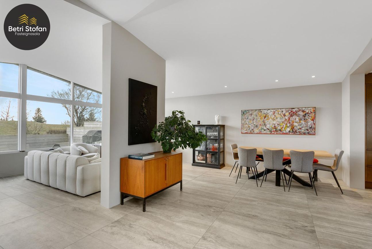 Stofa: Stór og björt með stórum gluggum og hátt til lofts, flísar á gólfi. Útgengi út á suðurpall. Gólfhiti